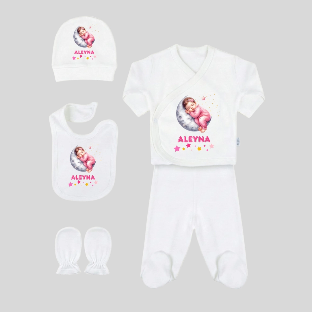 5’li Hastane Çıkış Seti Kız Bebek Ay Motifli