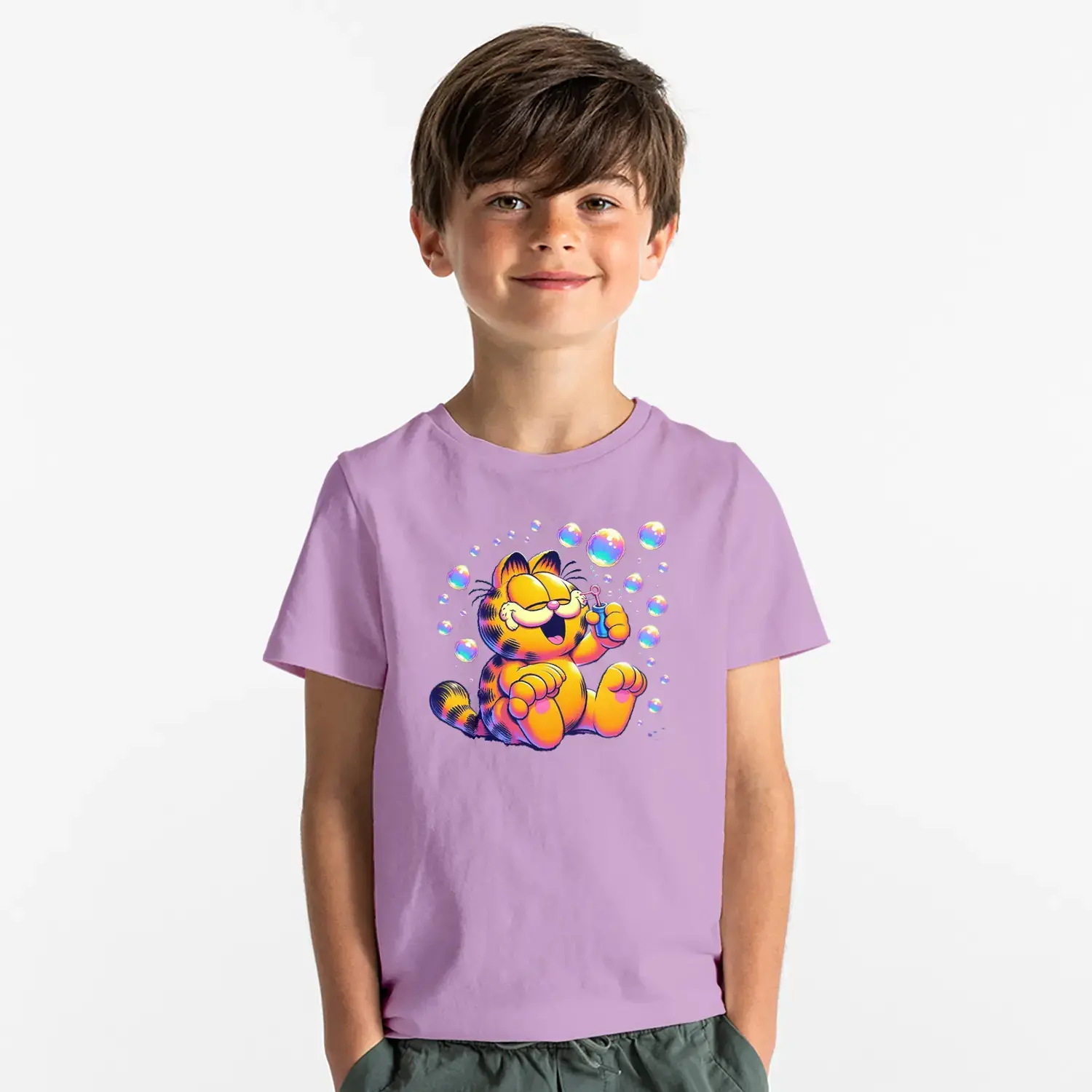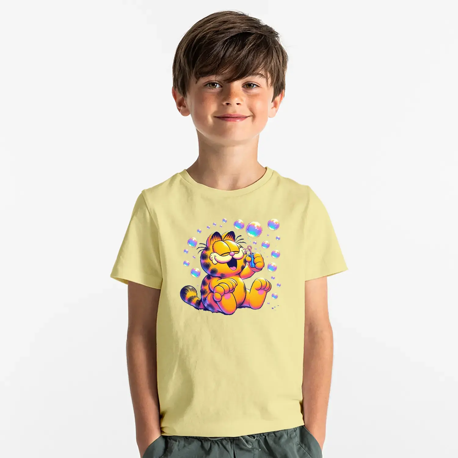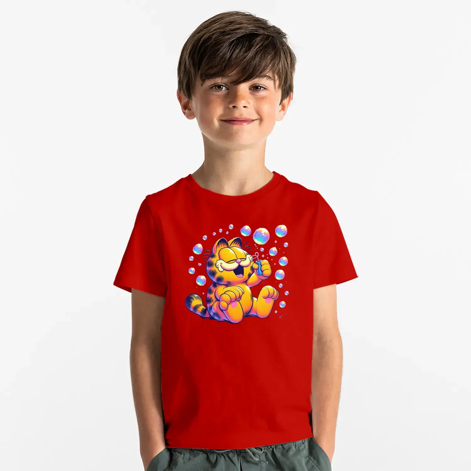 Baloncuklu Sevimli Kedi Çizgi Karakter Baskılı Erkek Çocuk Tişört