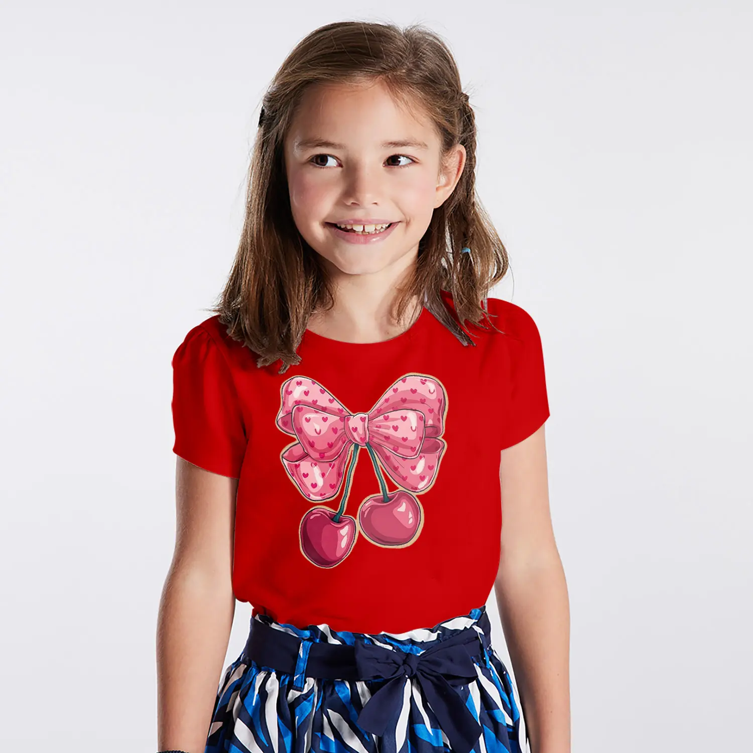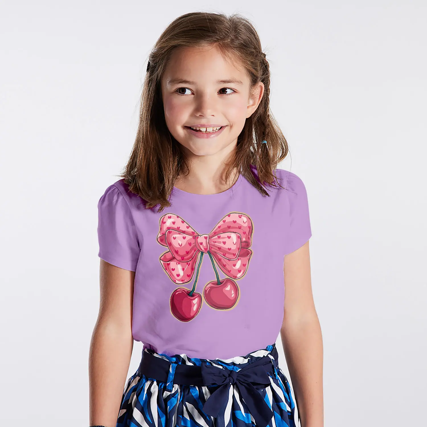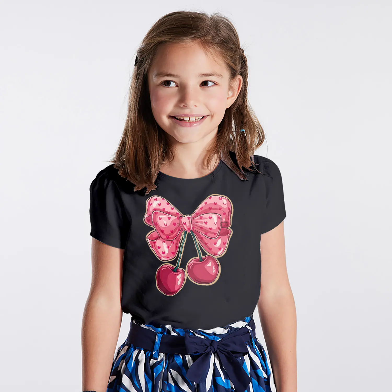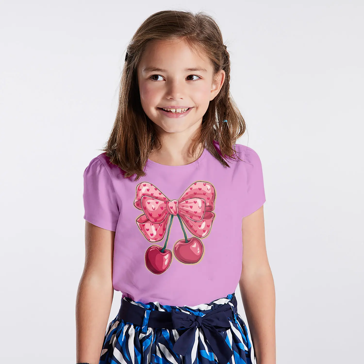 Büyük Pembe Fiyonk ve Kalpli Kiraz Figürlü Baskılı Kız Çocuk Tişörtü