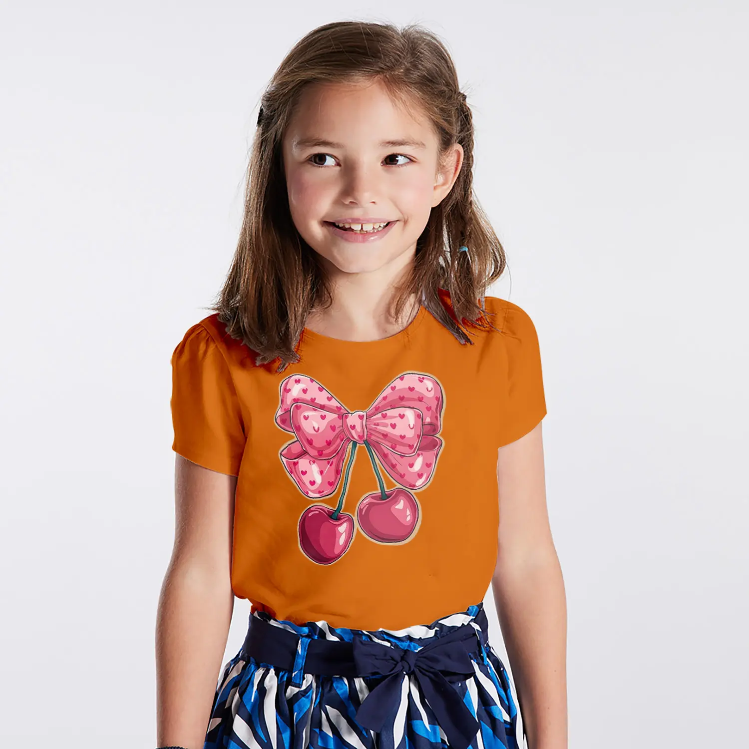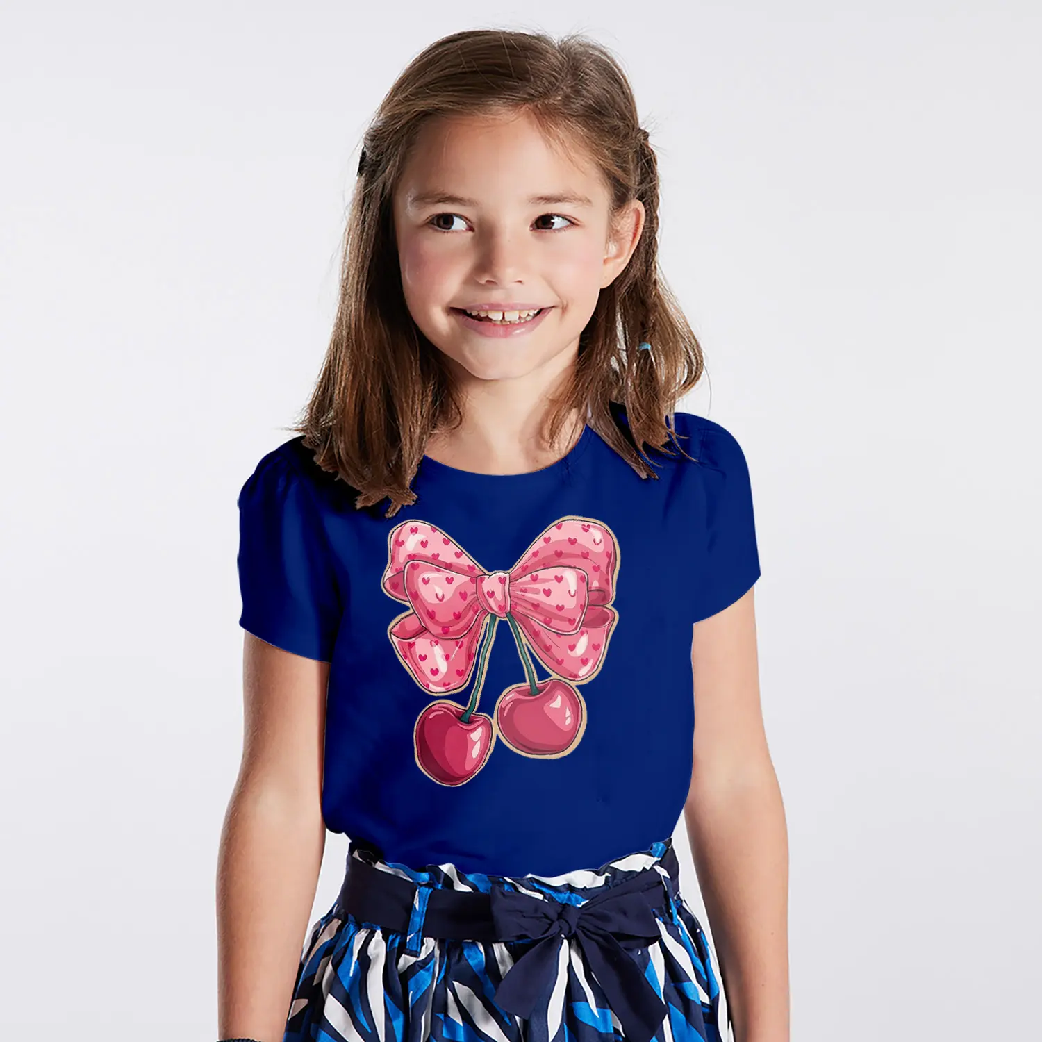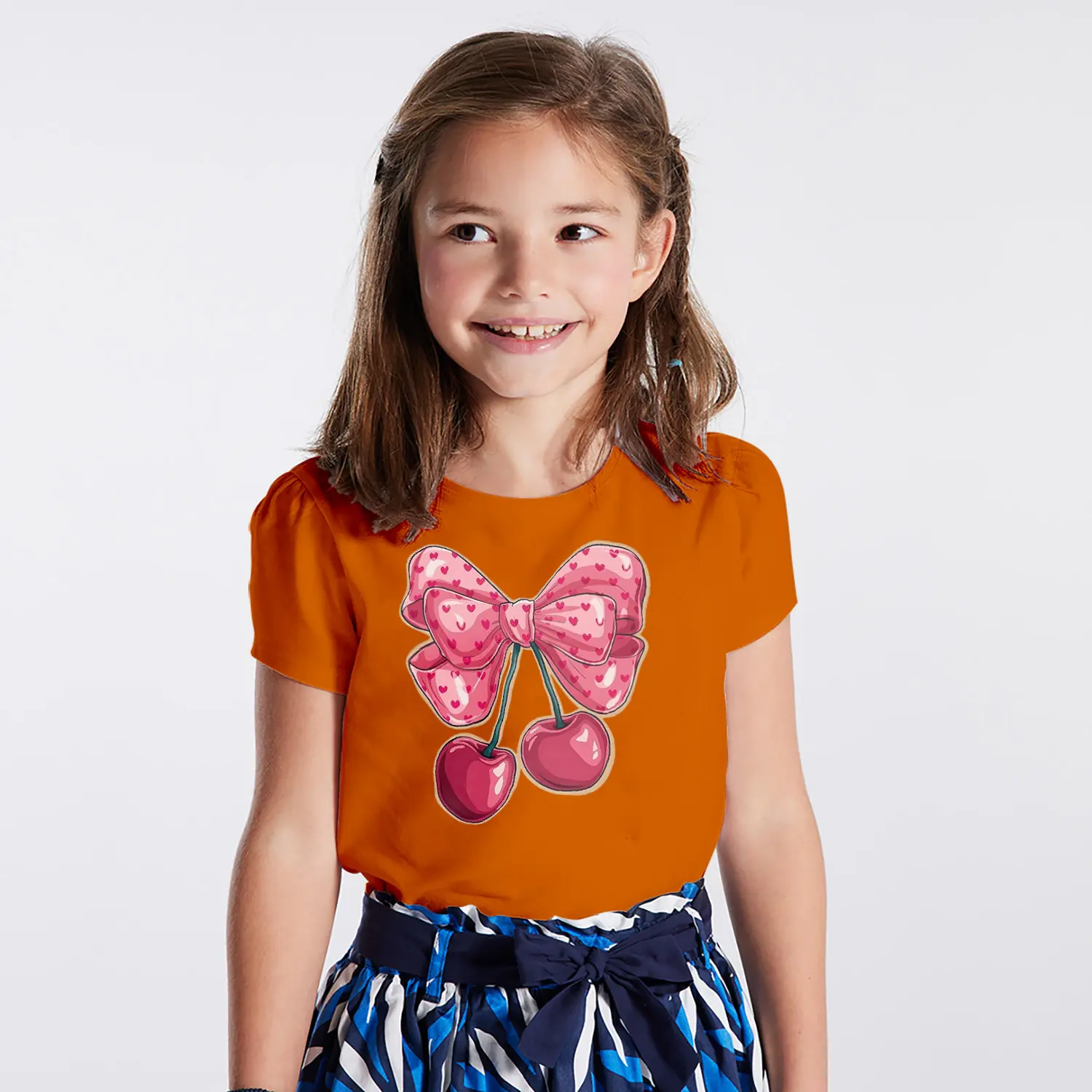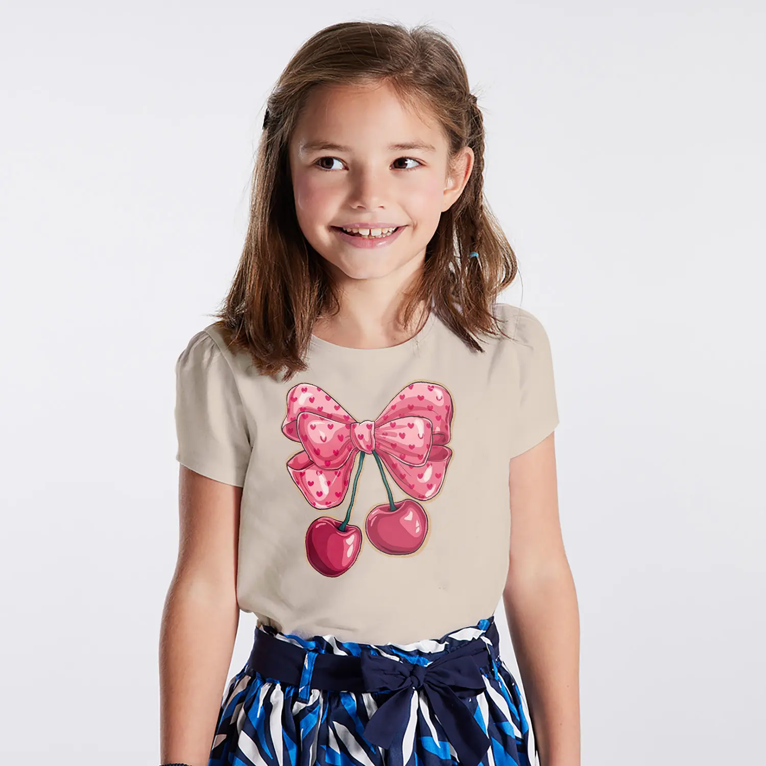 Büyük Pembe Fiyonk ve Kalpli Kiraz Figürlü Baskılı Kız Çocuk Tişörtü