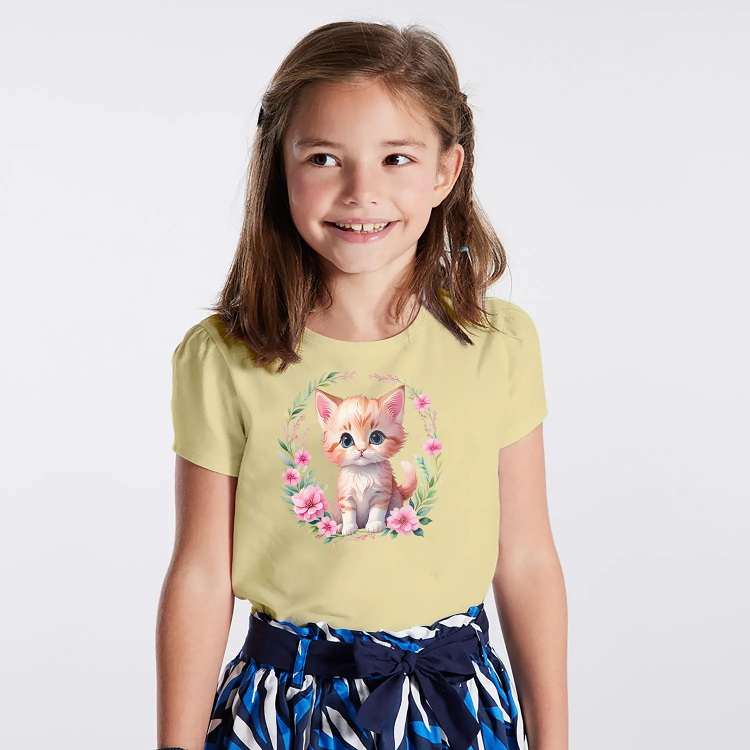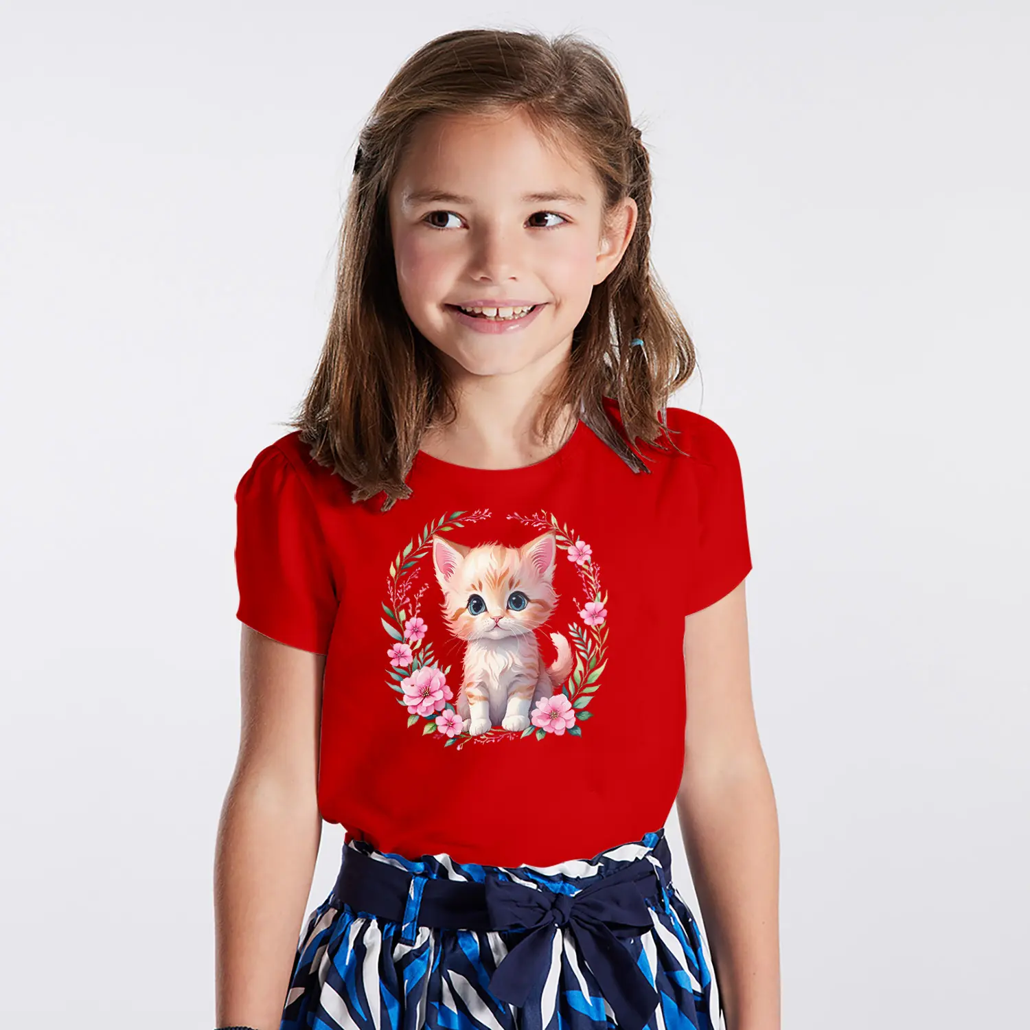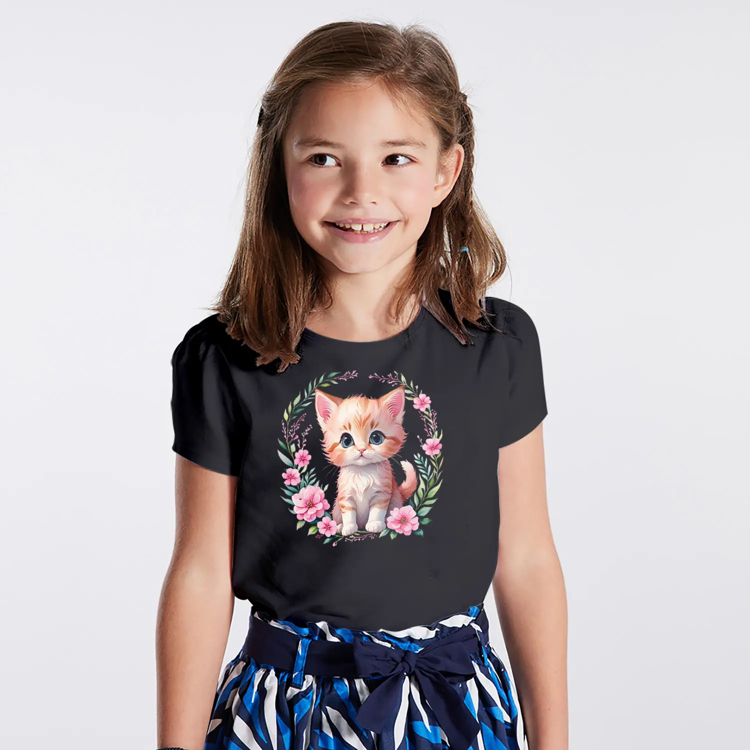 Çiçek Çerçeveli Sevimli Yavru Kedi Figürlü Baskılı Kız Çocuk Tişörtü