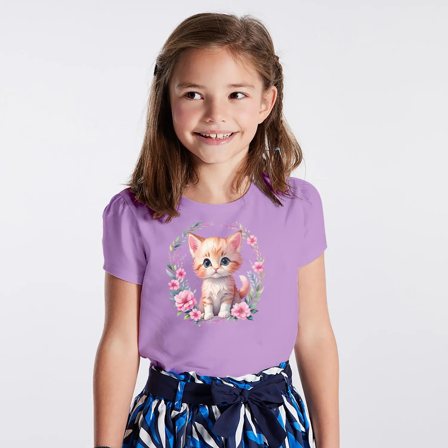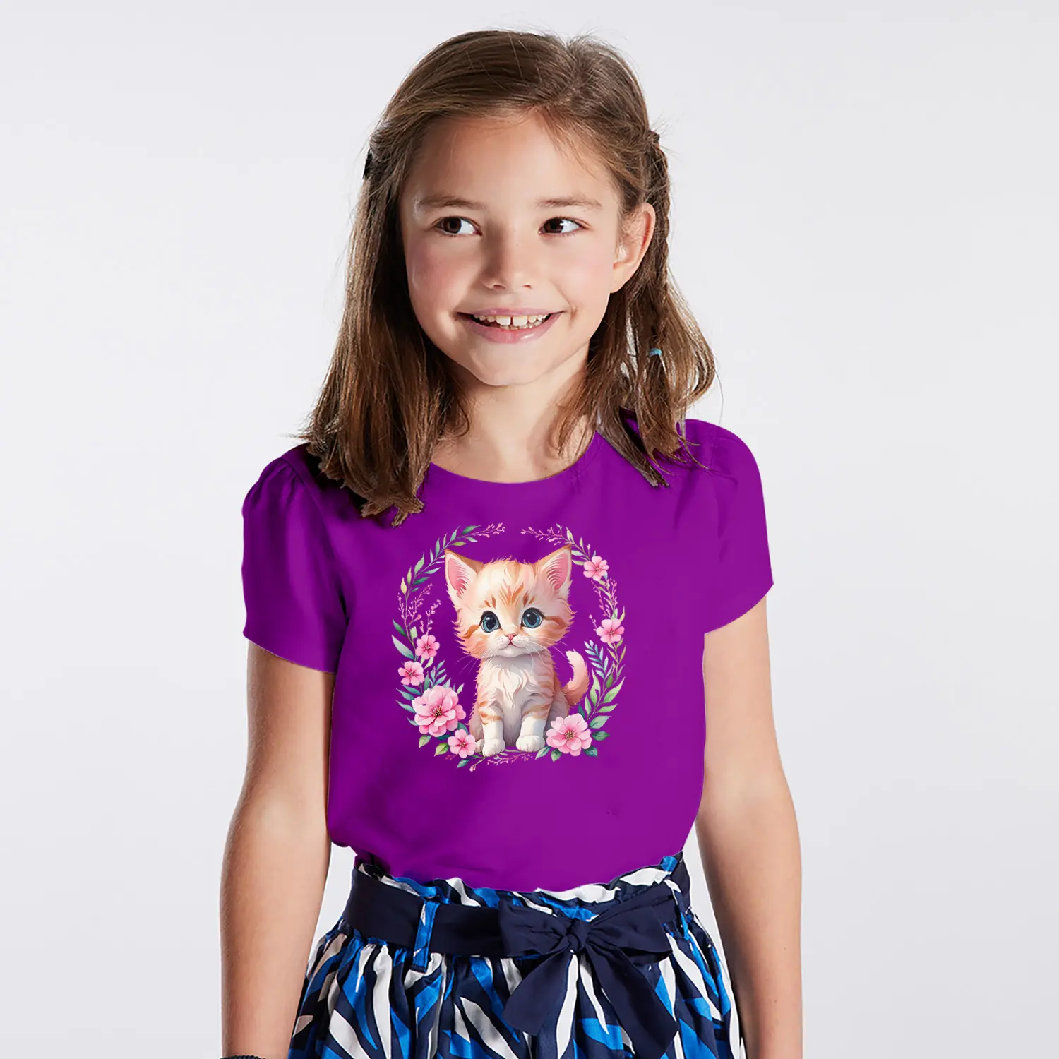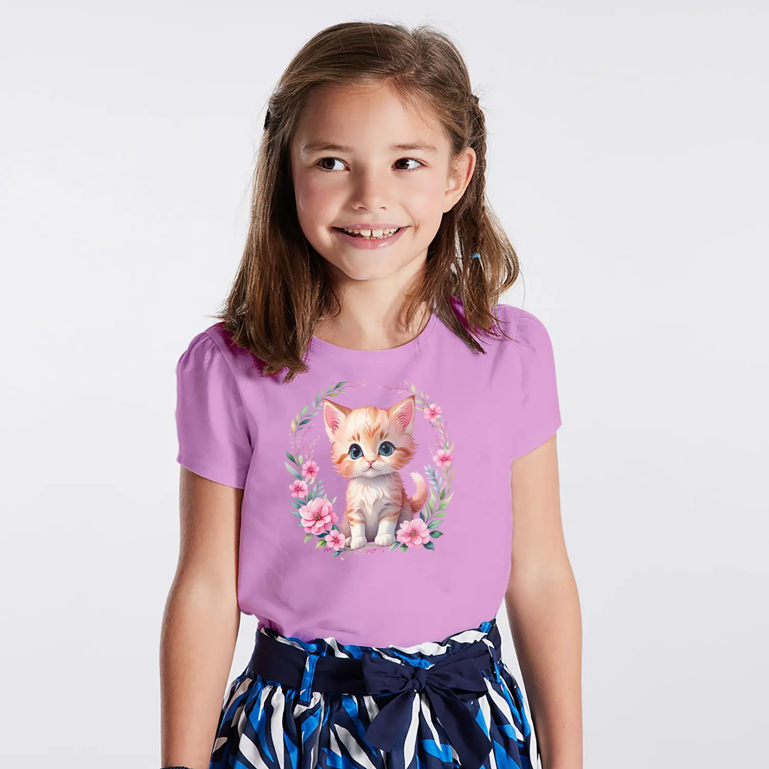 Çiçek Çerçeveli Sevimli Yavru Kedi Figürlü Baskılı Kız Çocuk Tişörtü