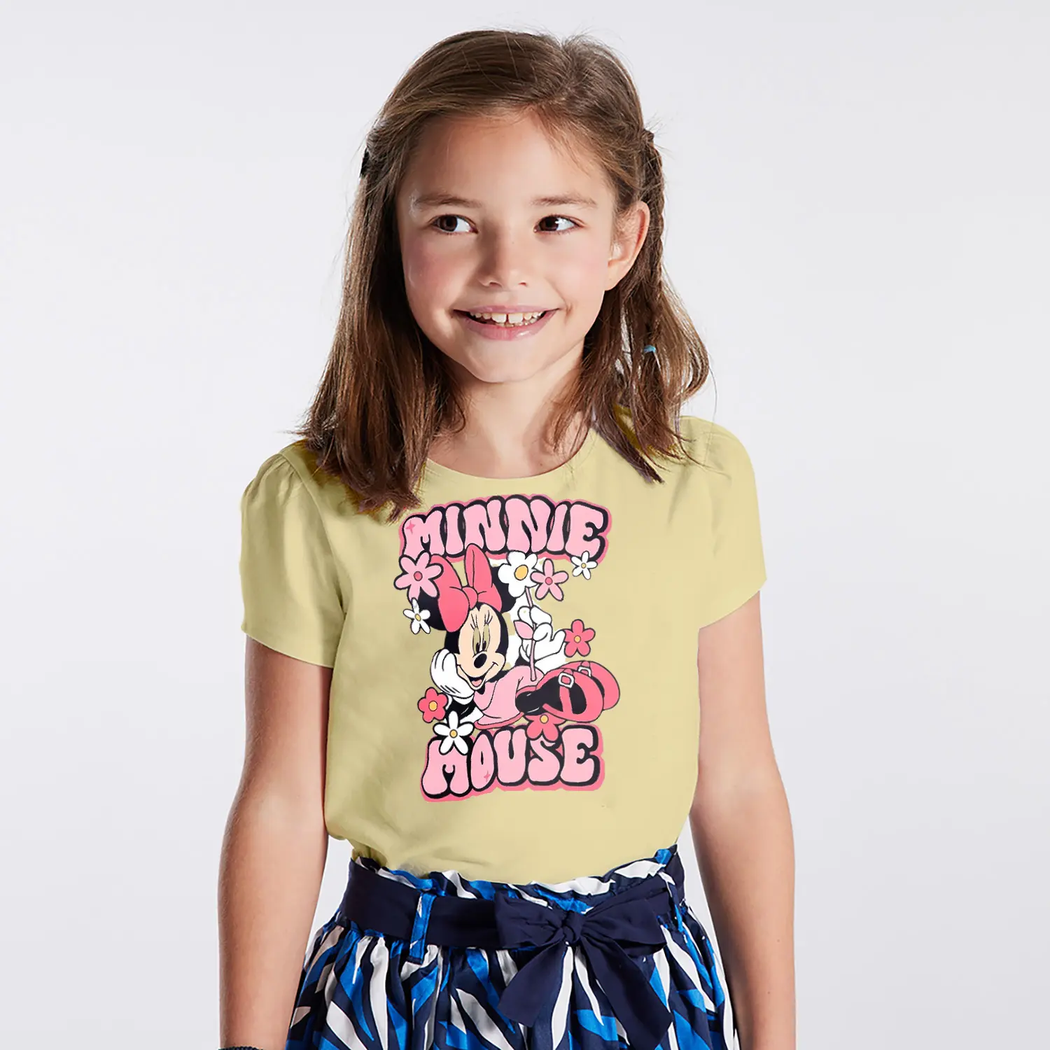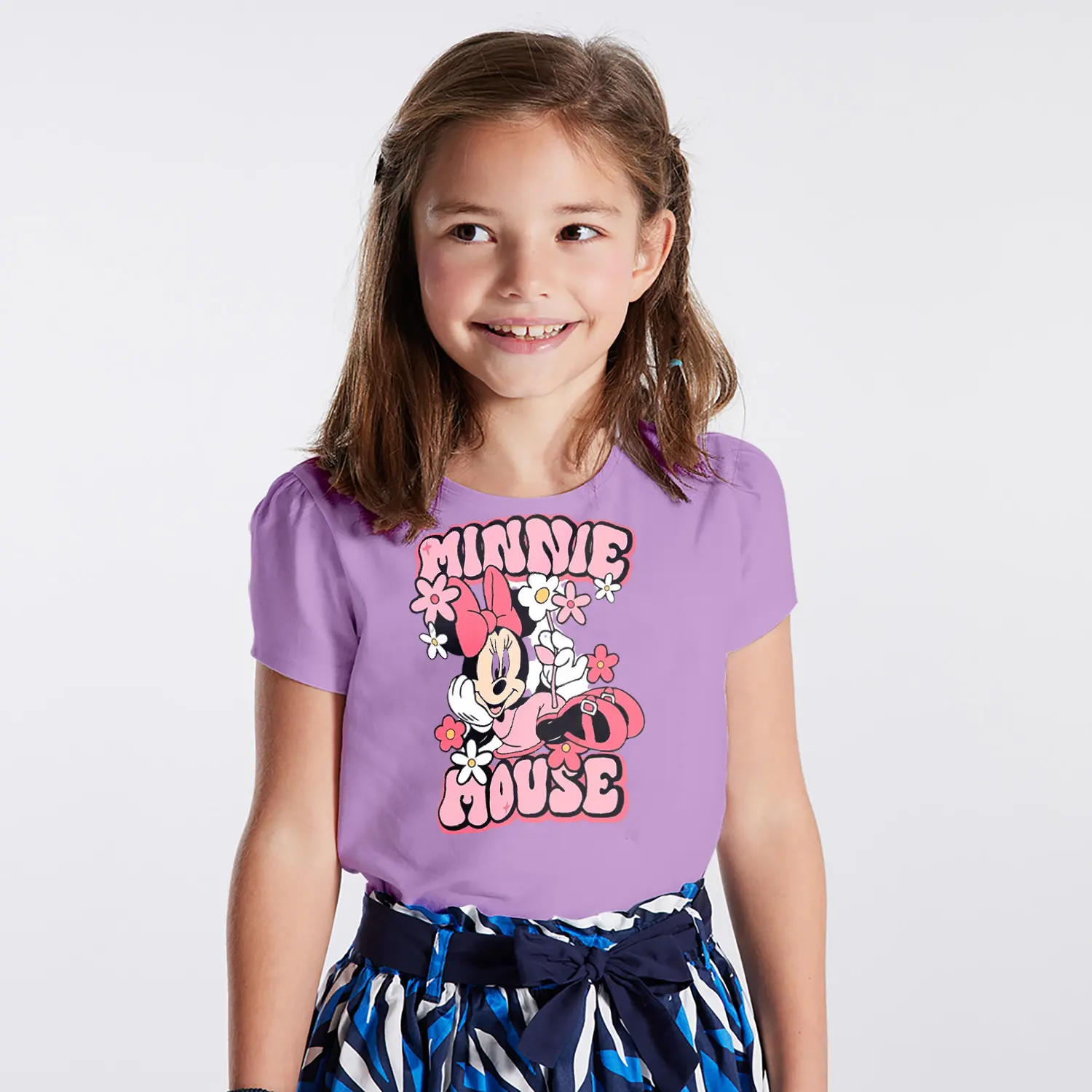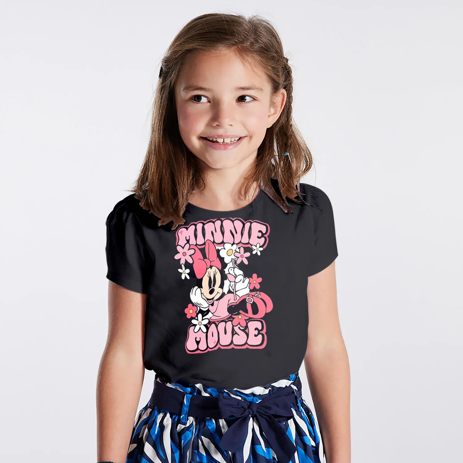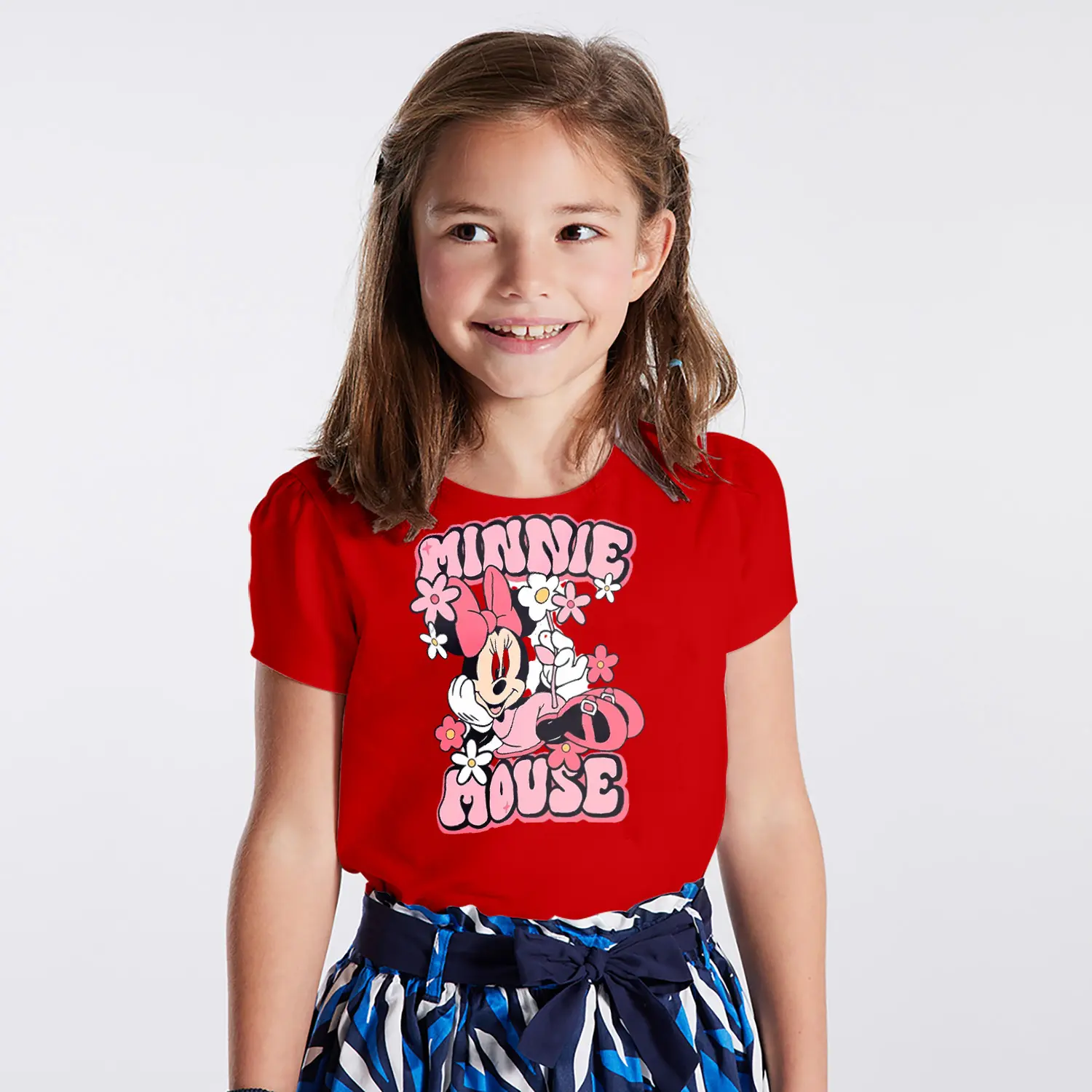 Çiçekli Fiyonklu Yuvarlak Kulaklı Fare Karikatür Mouse Yazılı Baskılı Kız Çocuk Tişörtü
