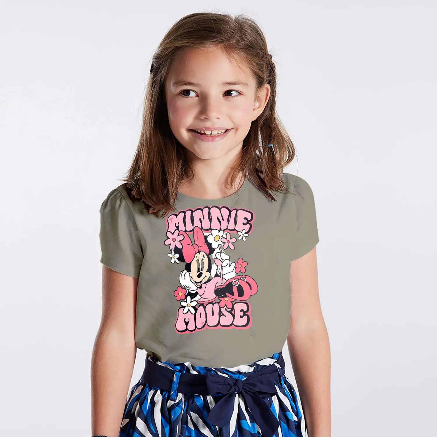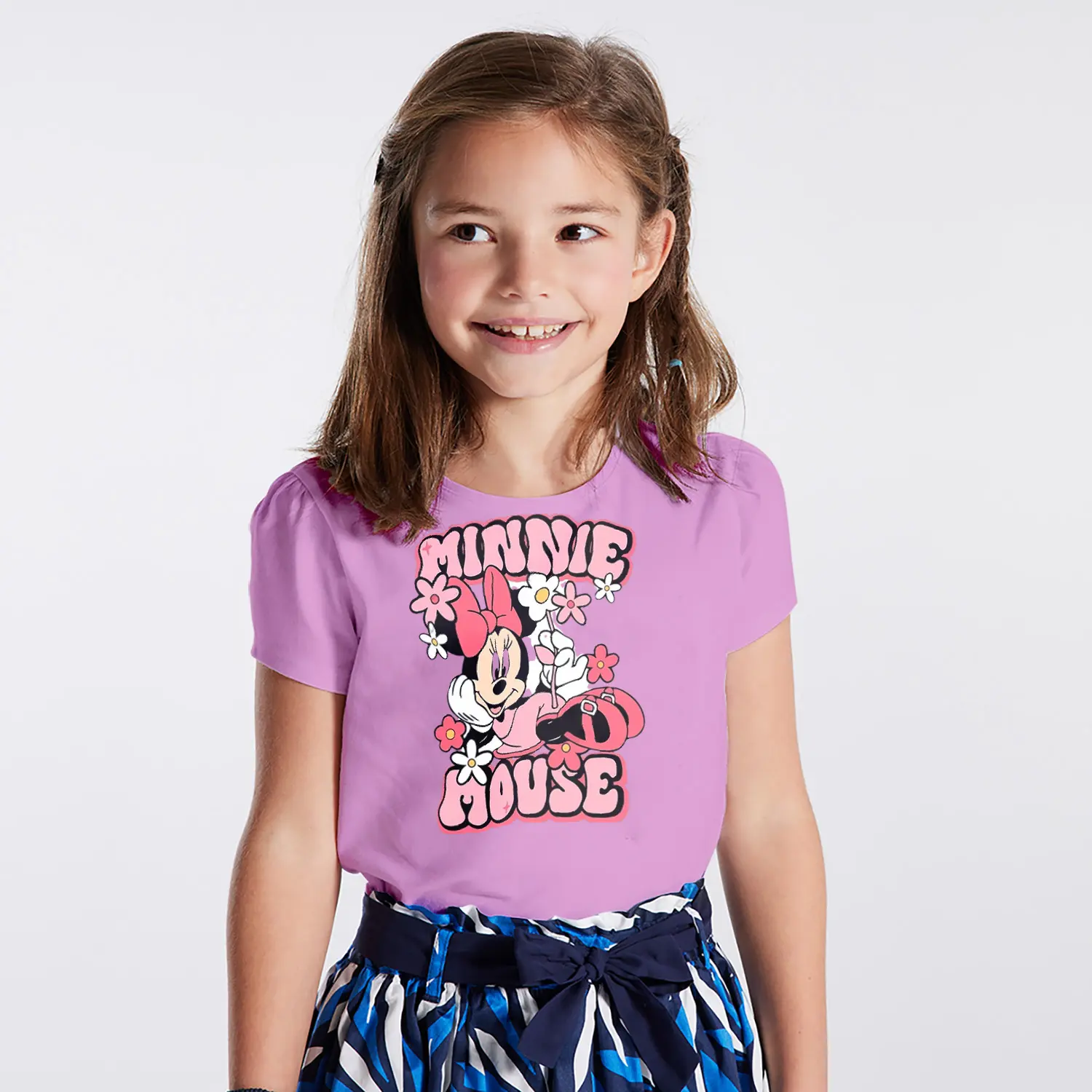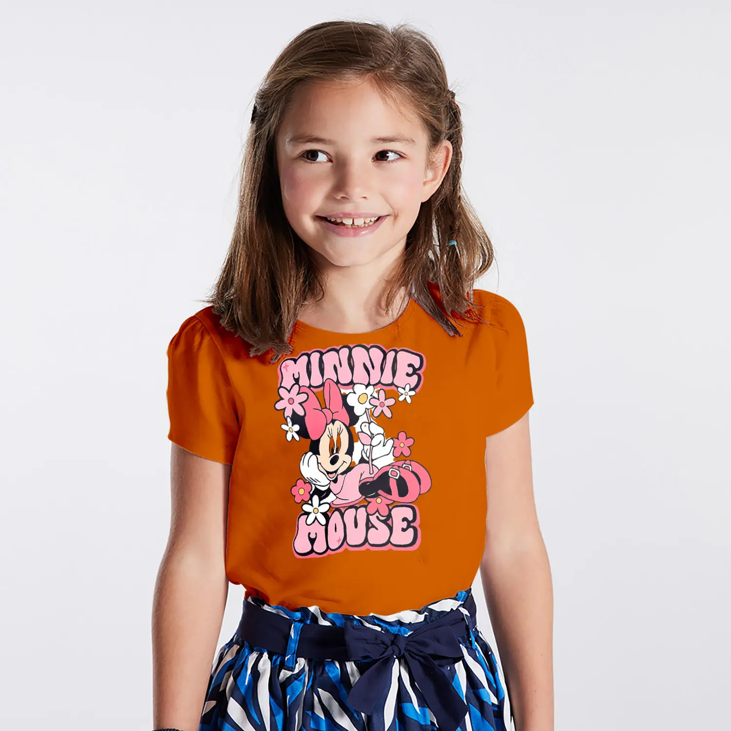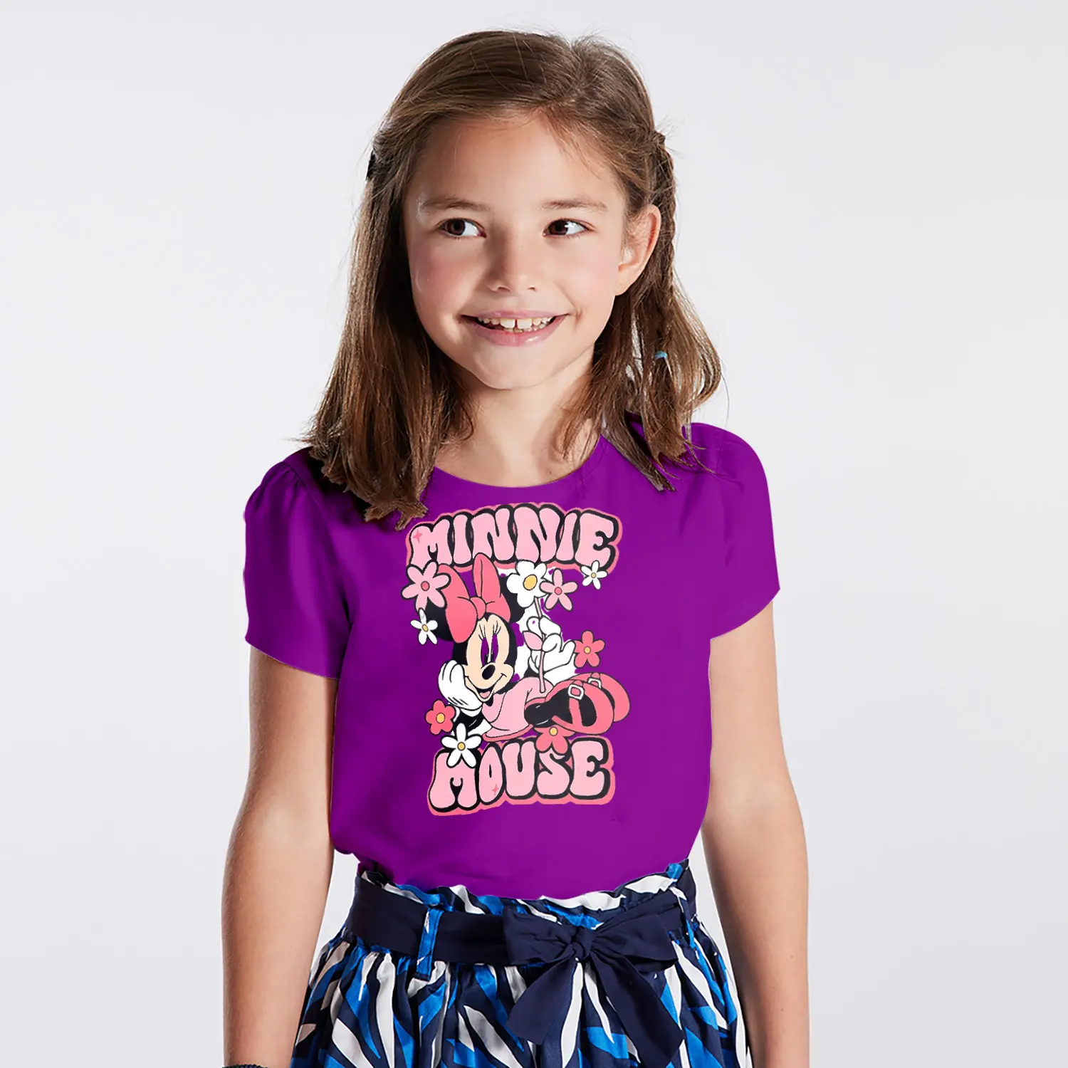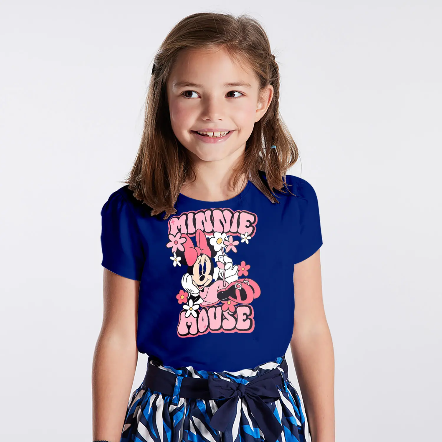 Çiçekli Fiyonklu Yuvarlak Kulaklı Fare Karikatür Mouse Yazılı Baskılı Kız Çocuk Tişörtü