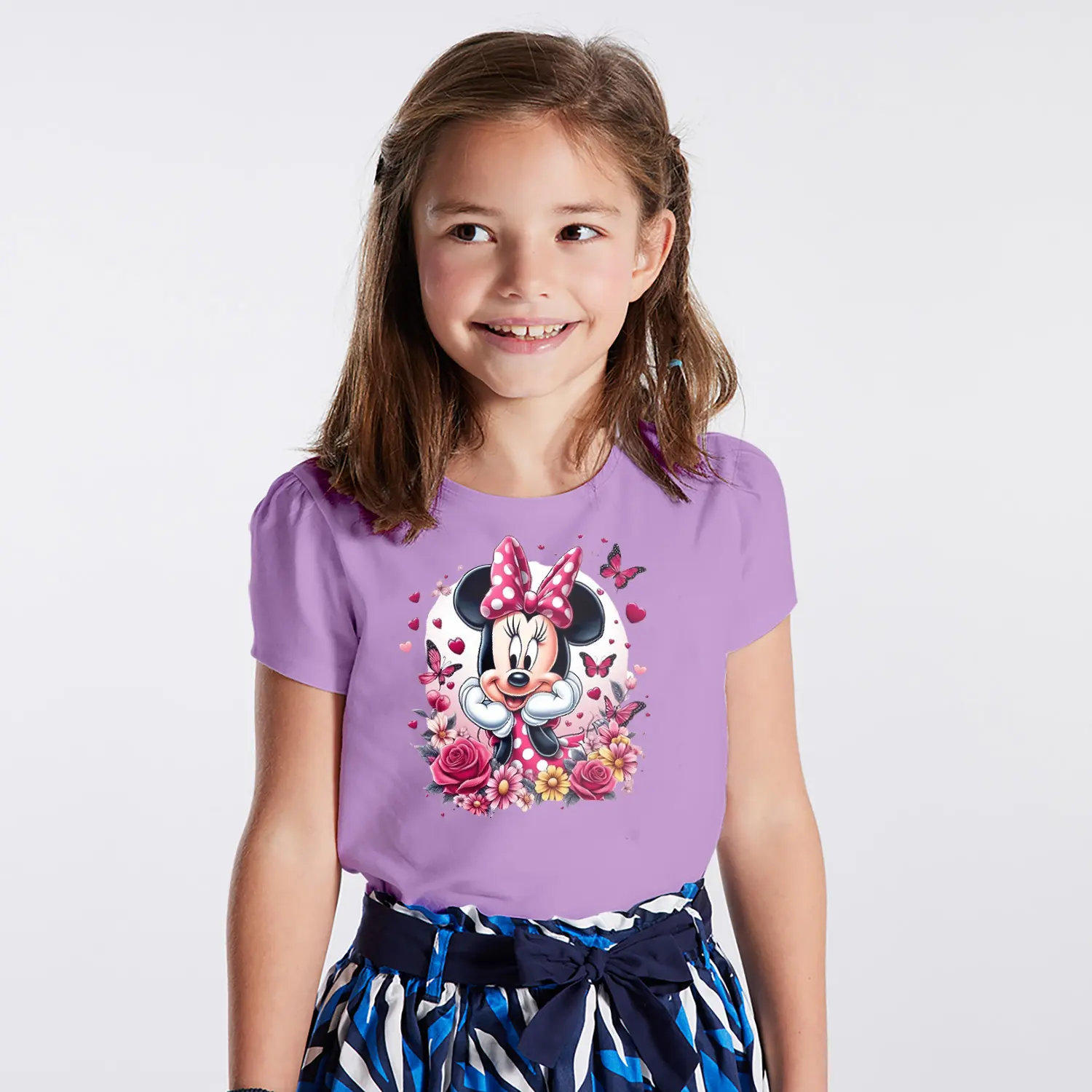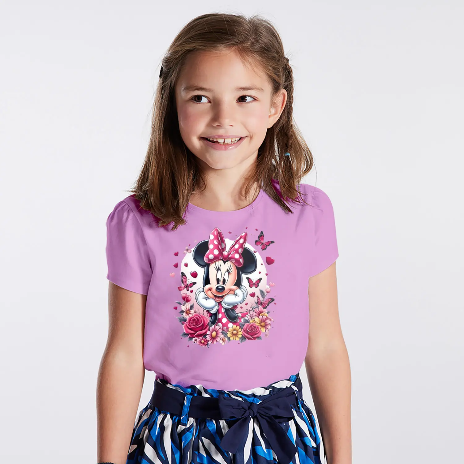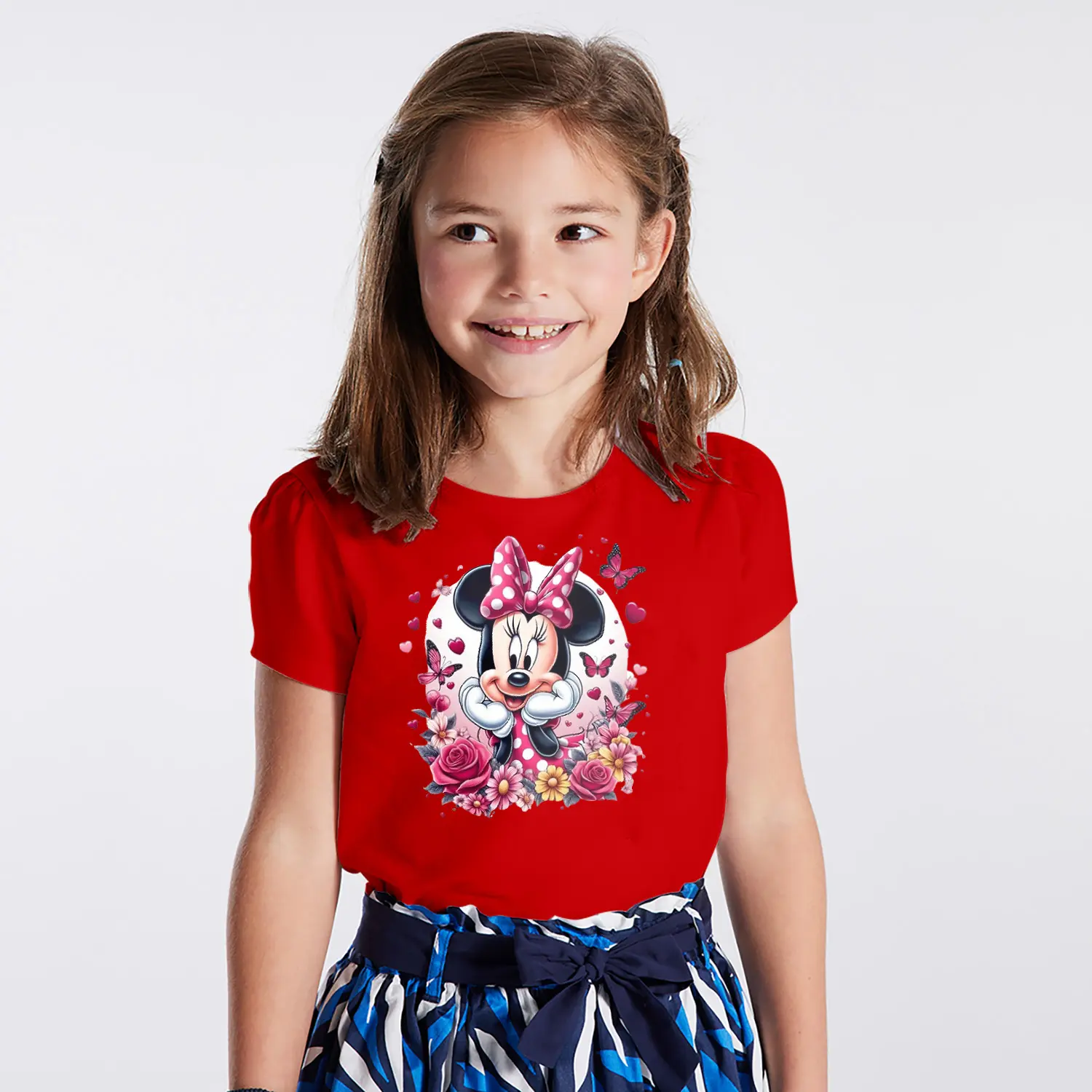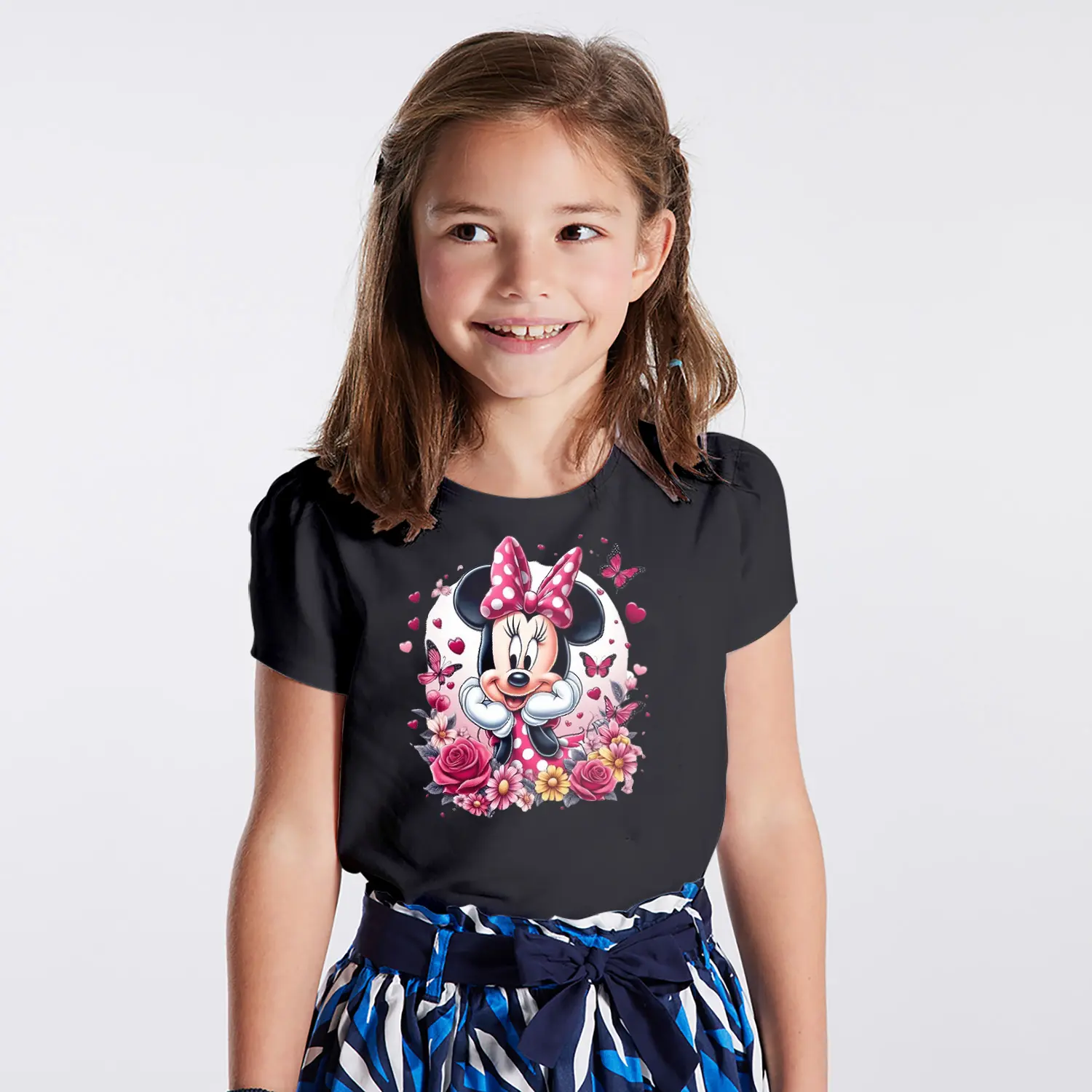 Çiçekli Kelebek Desenli Yuvarlak Kulaklı Fare Karikatür Kalpli Baskılı Kız Çocuk Tişörtü