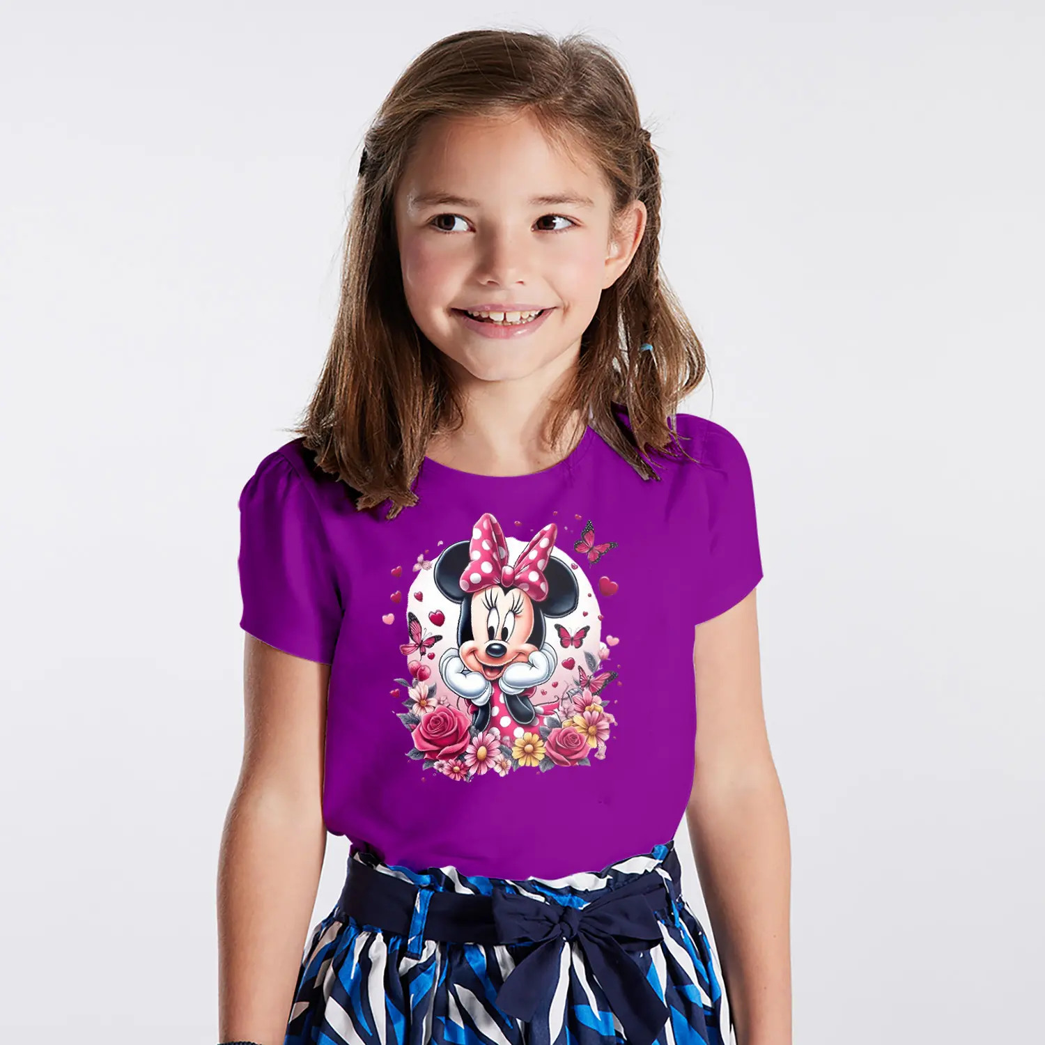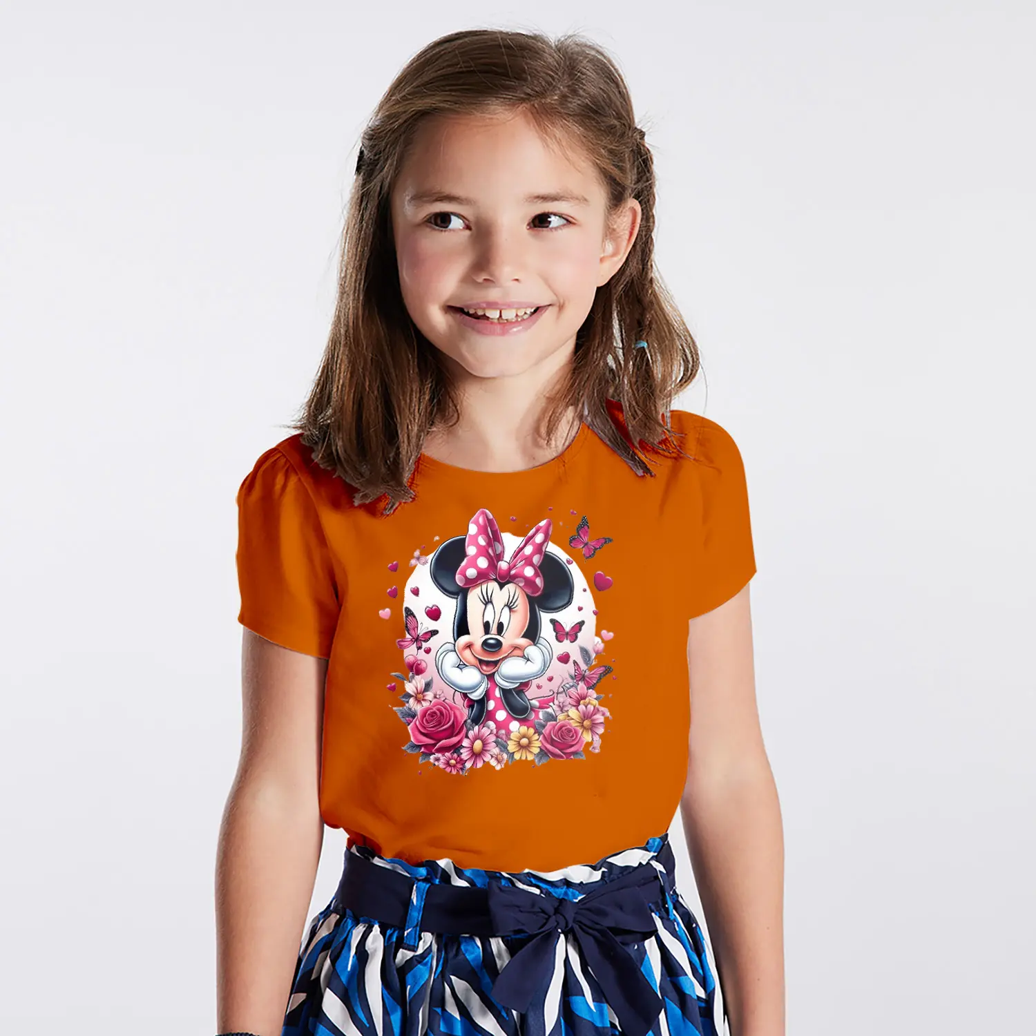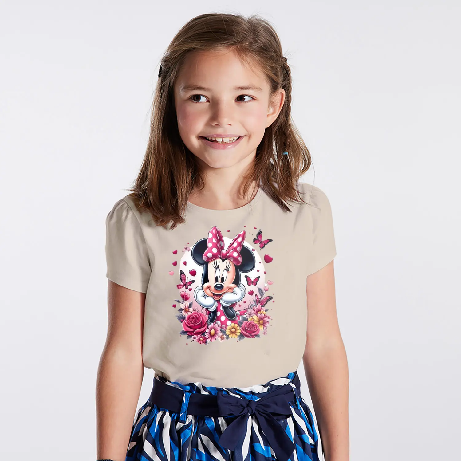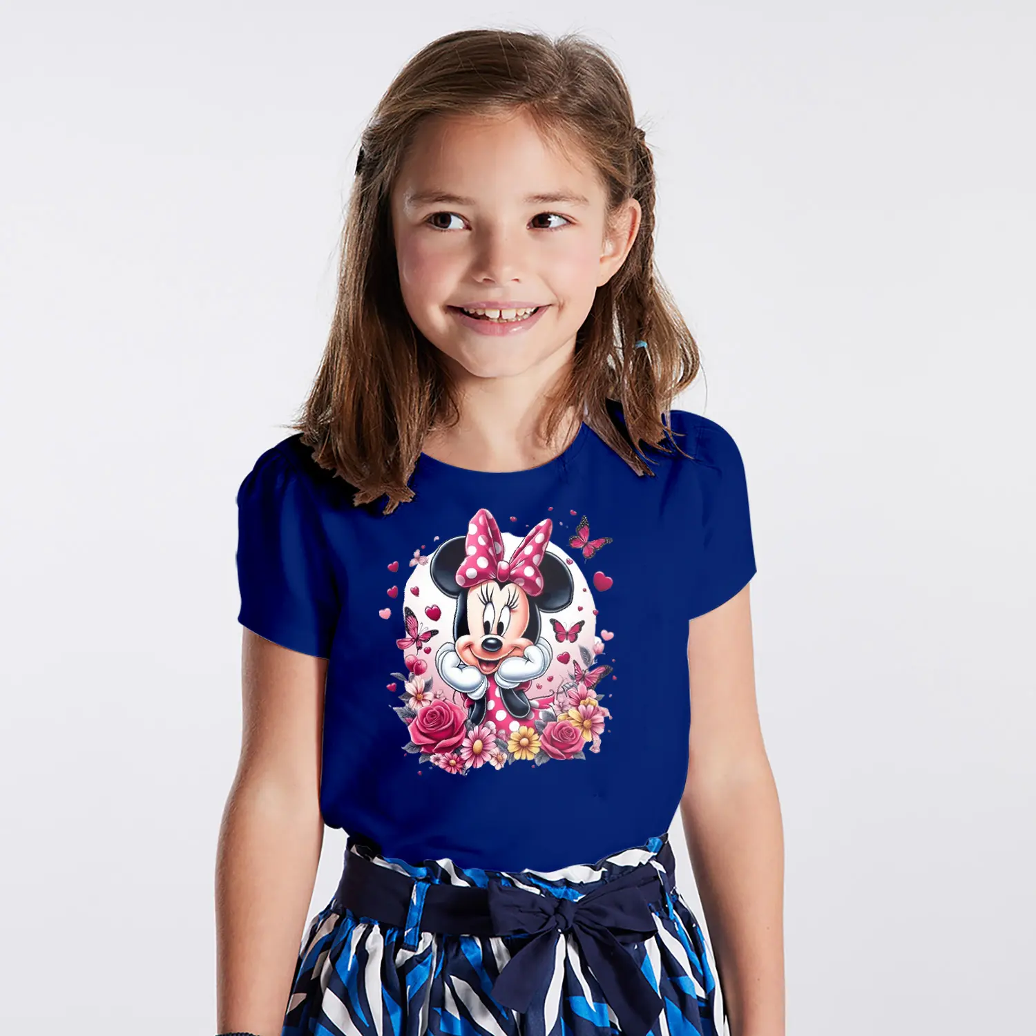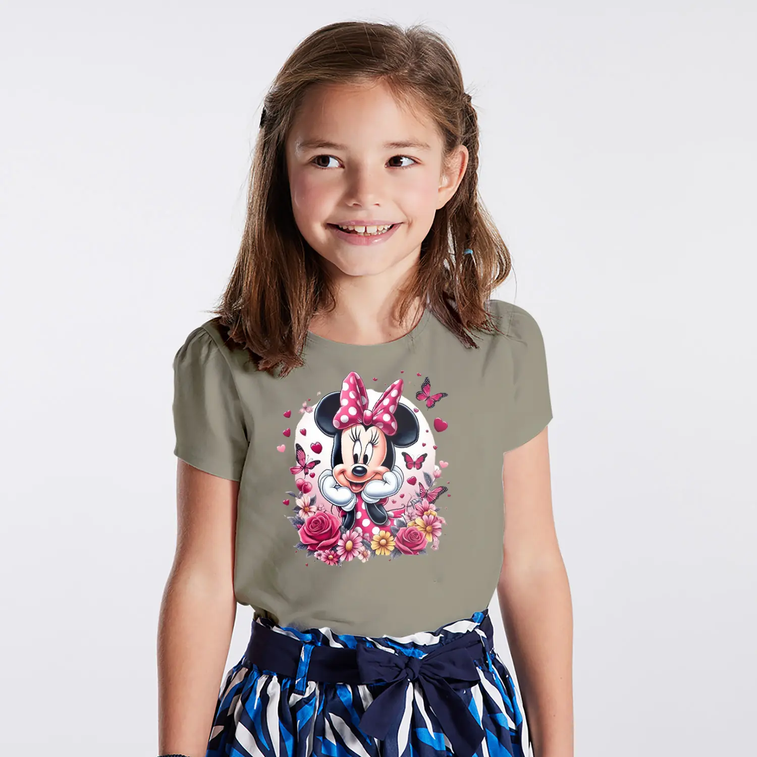 Çiçekli Kelebek Desenli Yuvarlak Kulaklı Fare Karikatür Kalpli Baskılı Kız Çocuk Tişörtü