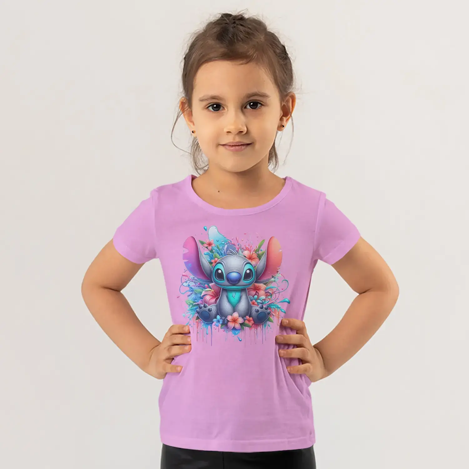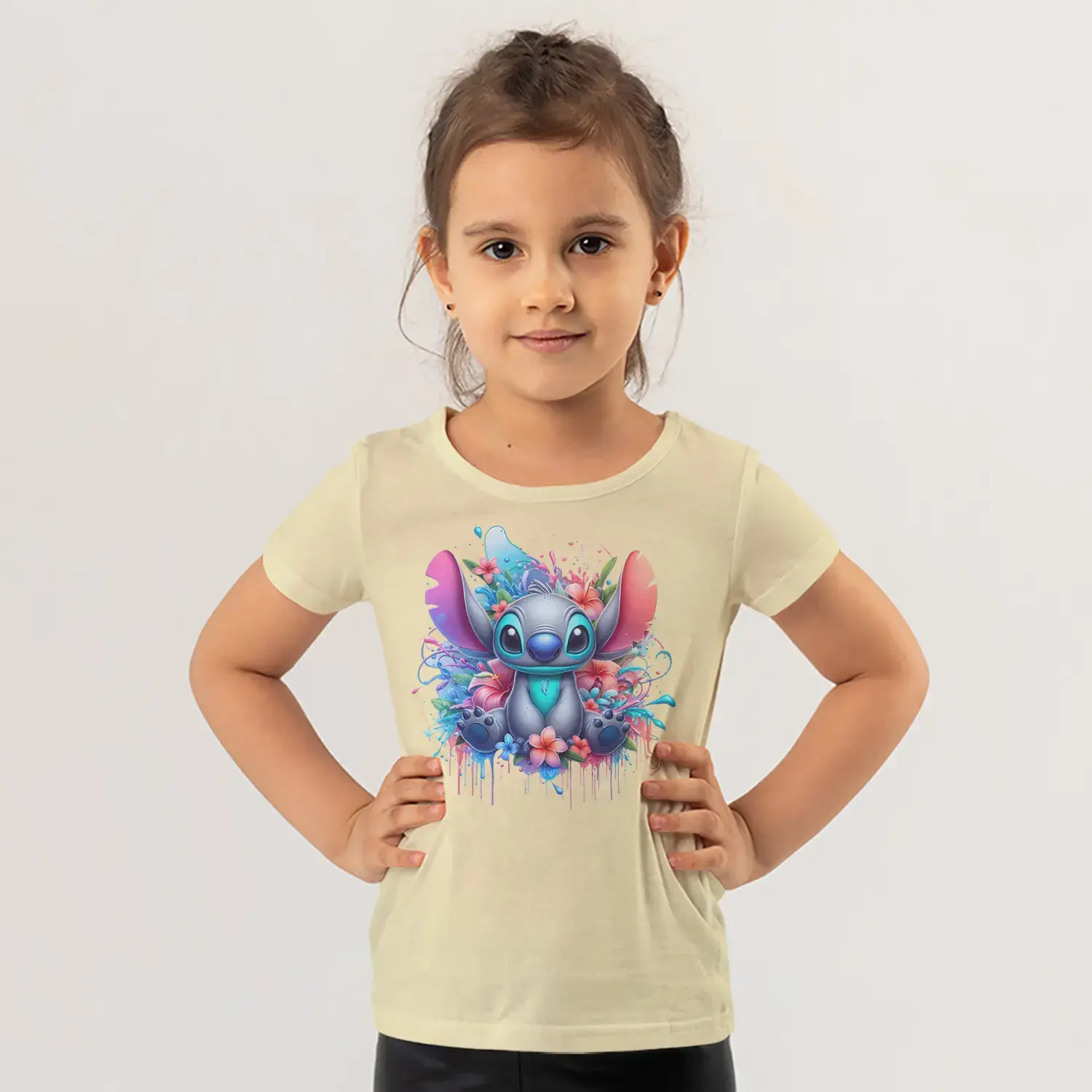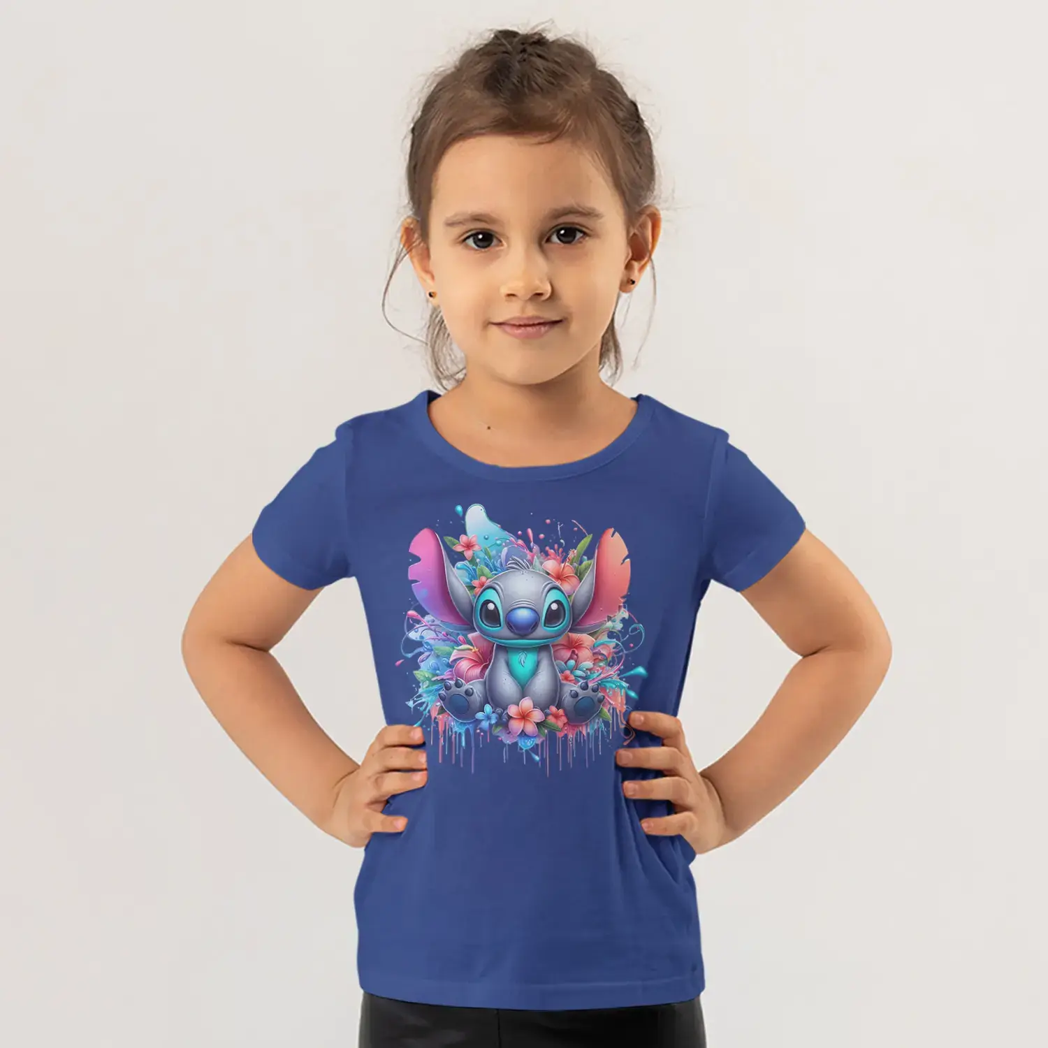 Çiçekli Mavi Büyük Kulaklı Sevimli Uzaylı Yaratık Suluboya Baskılı Kız Çocuk Tişörtü