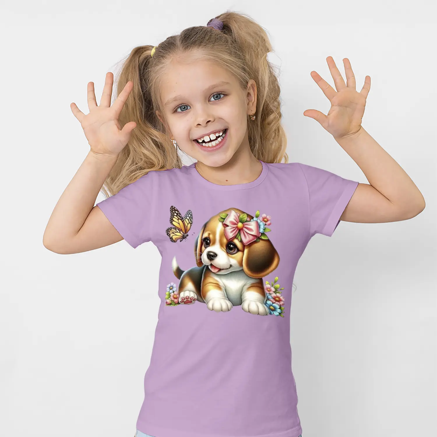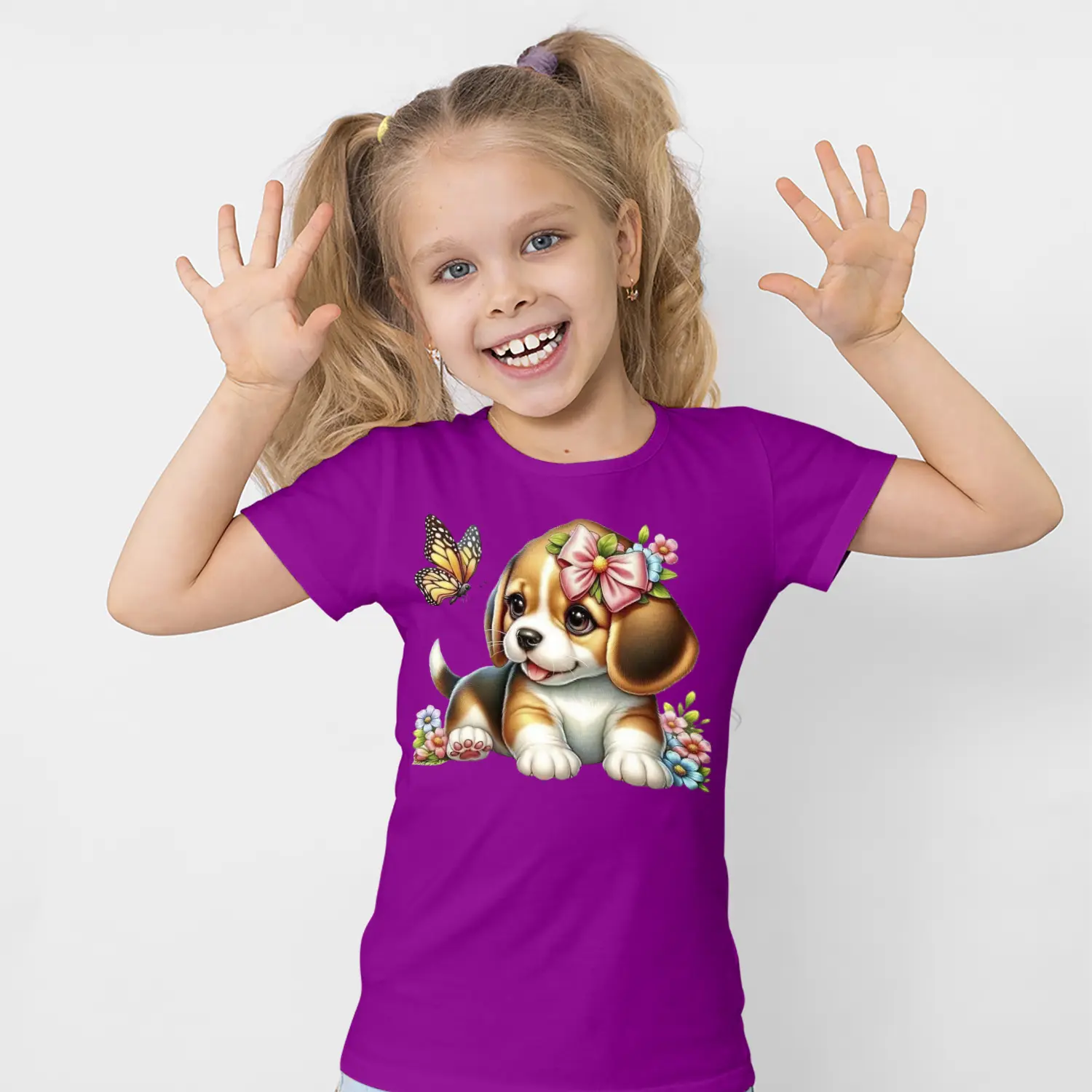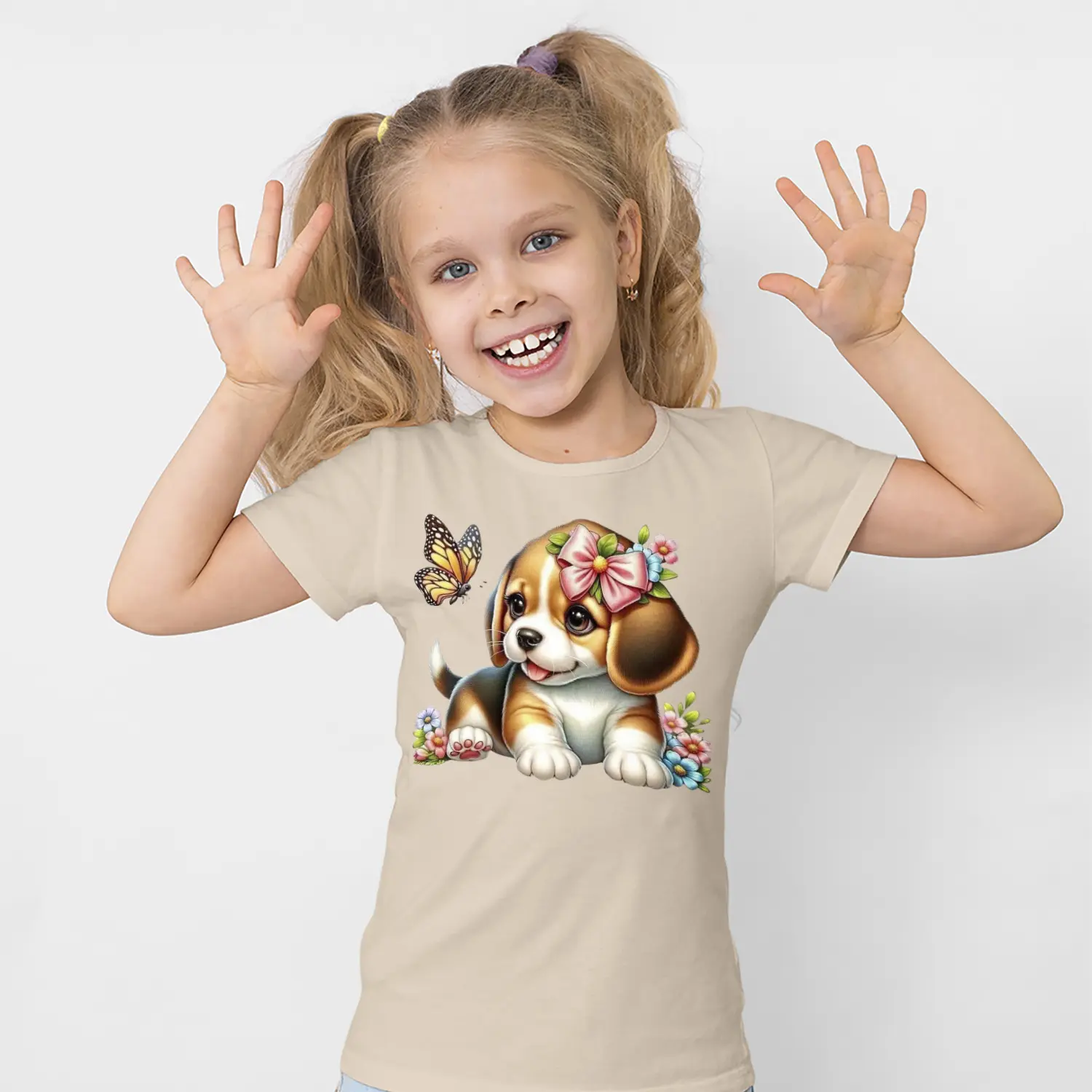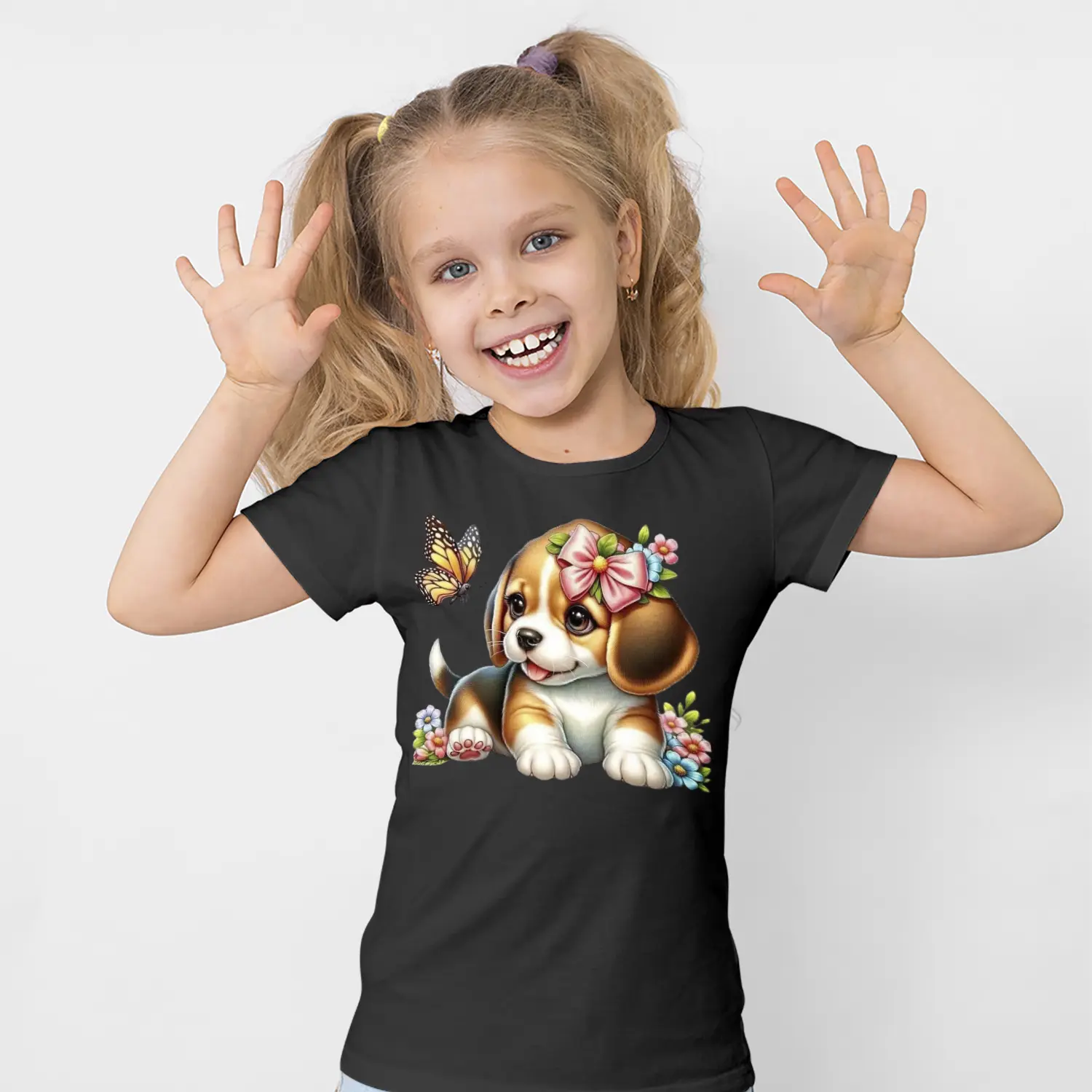 Çiçekli Sevimli Yavru Köpek ve Kelebek Figürlü Baskılı Kız Çocuk Tişörtü