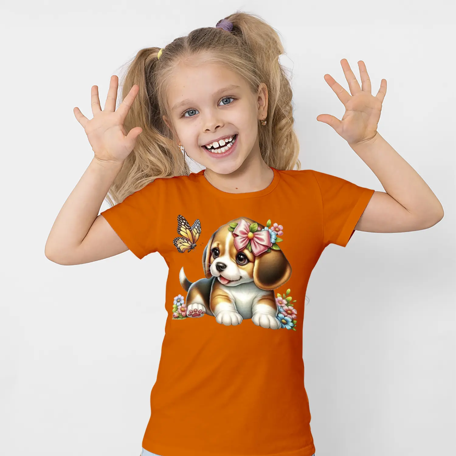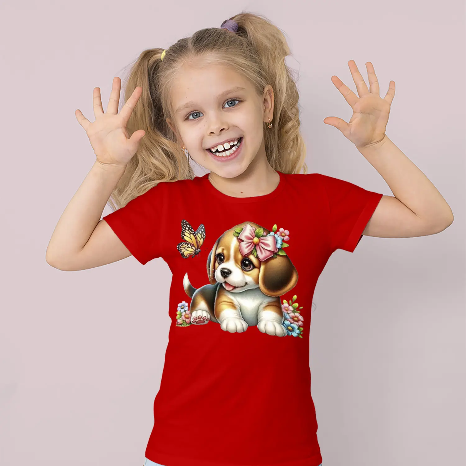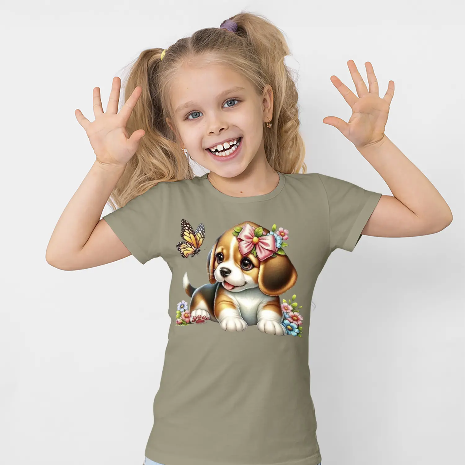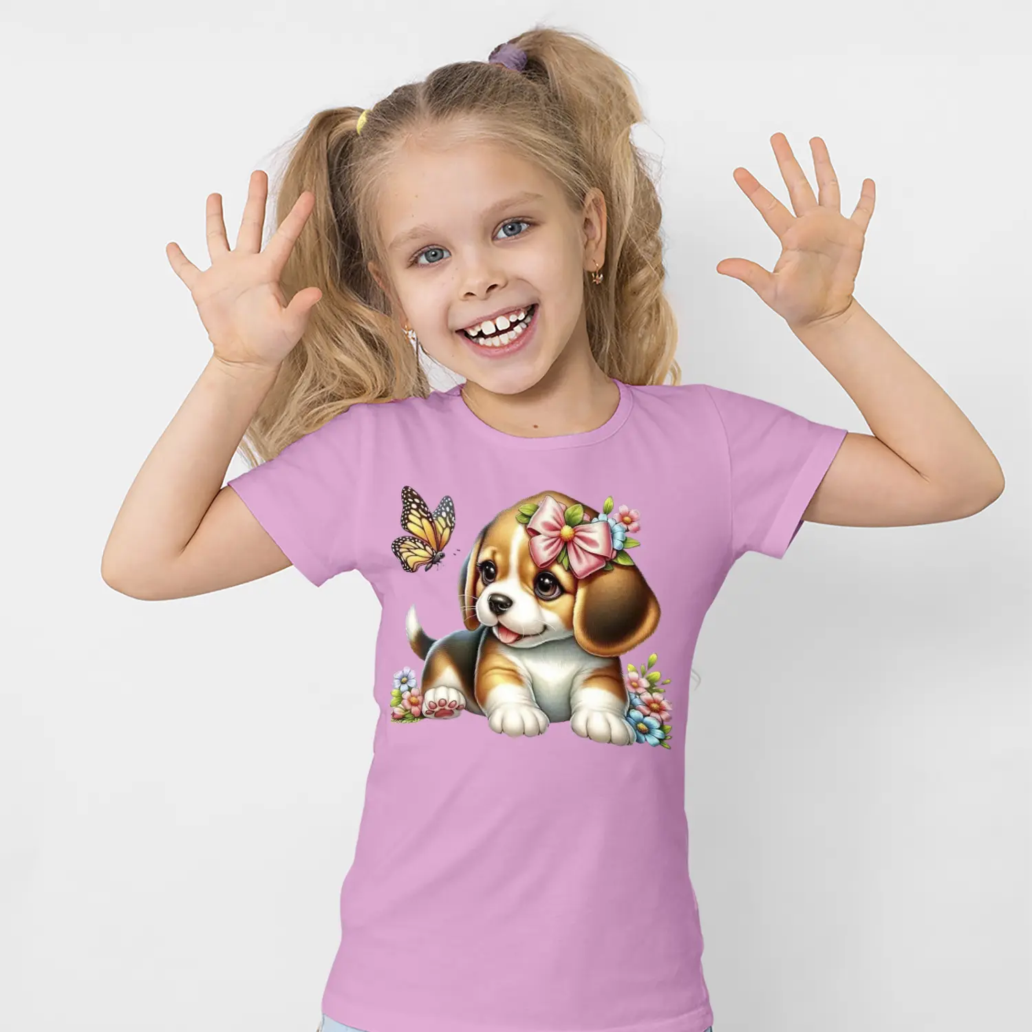 Çiçekli Sevimli Yavru Köpek ve Kelebek Figürlü Baskılı Kız Çocuk Tişörtü