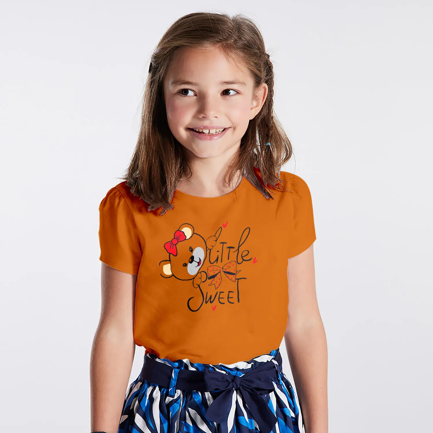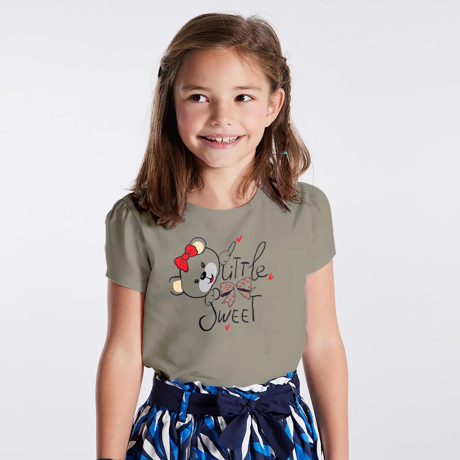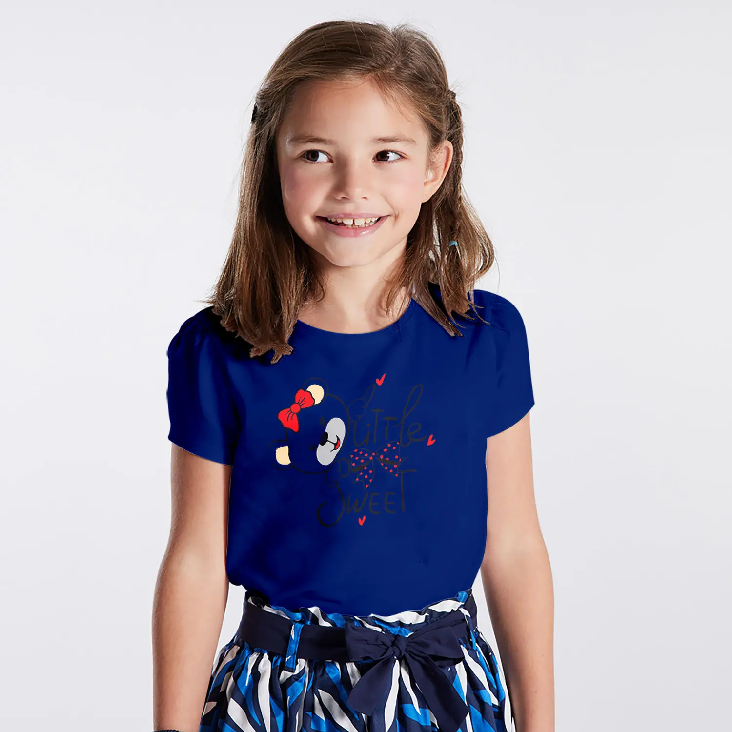 Fiyonklu Sevimli Ayıcık Little Sweet Yazılı Baskılı Kız Çocuk Tişörtü