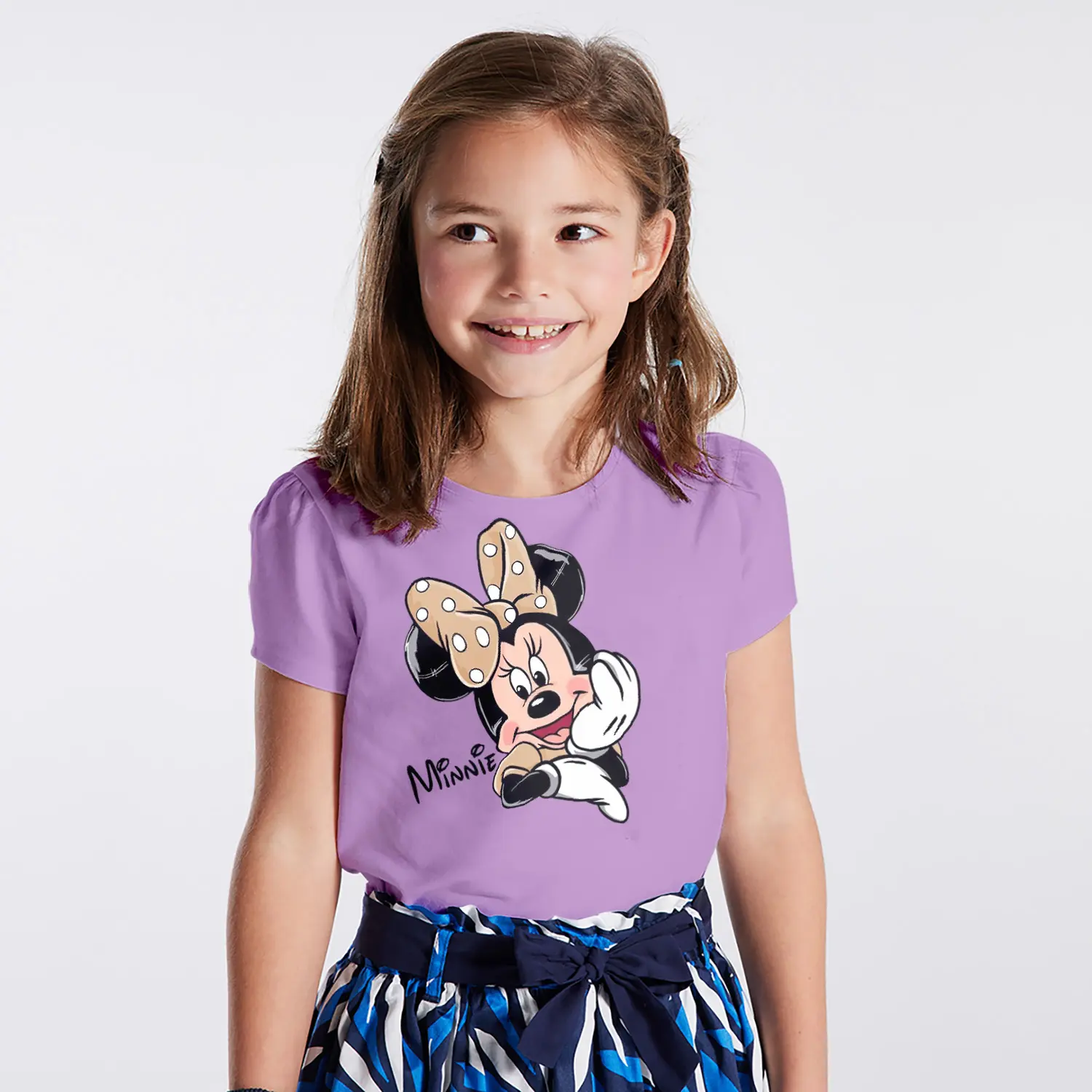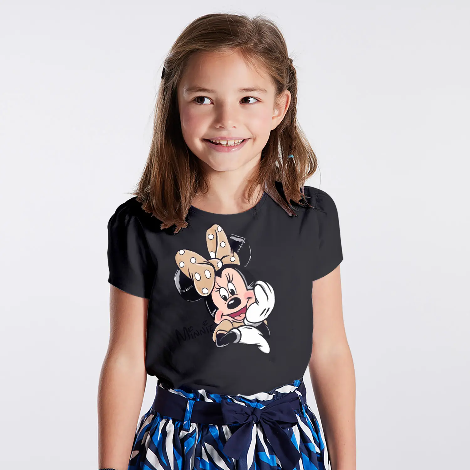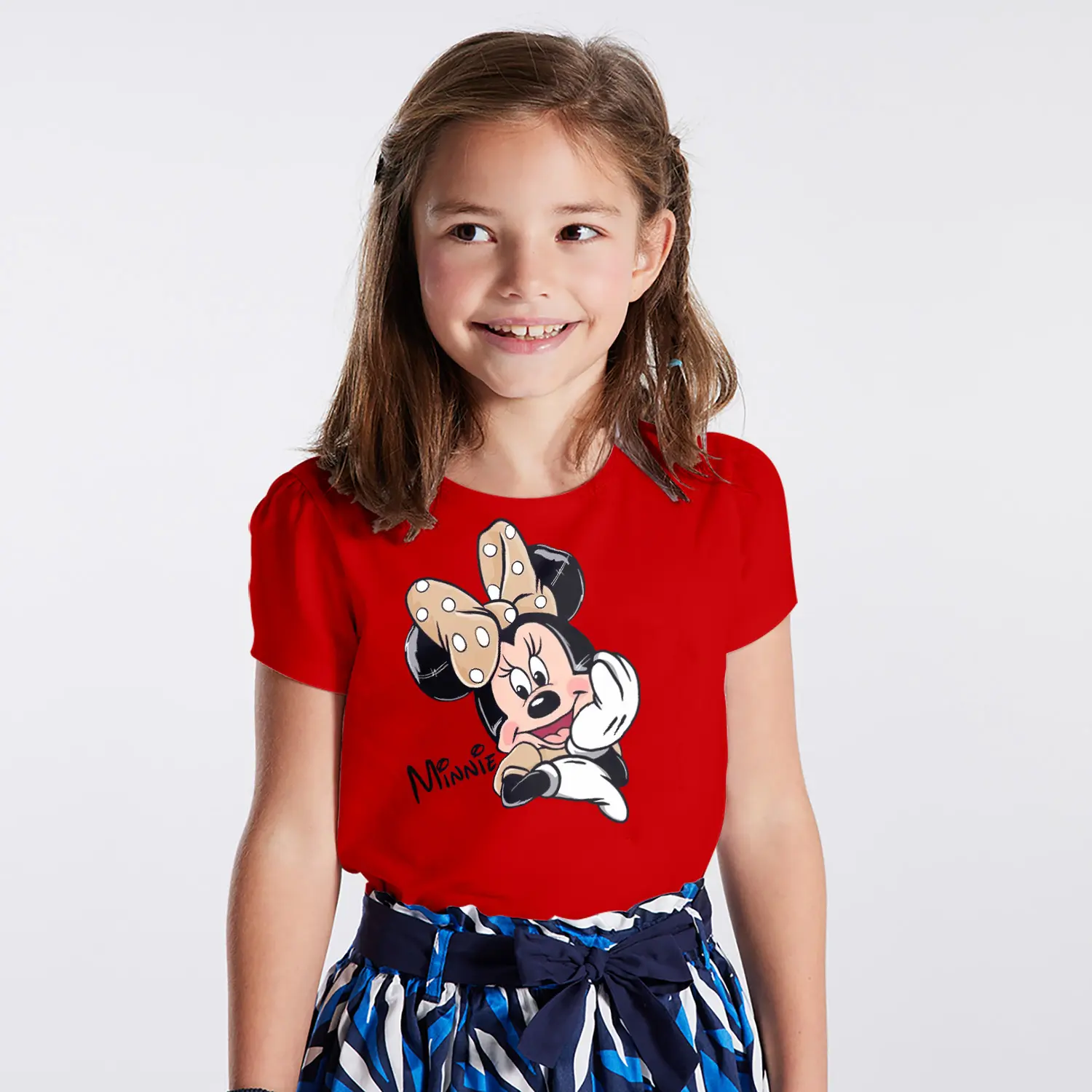 Fiyonklu Yuvarlak Kulaklı Fare Karikatür Minnie Yazılı Baskılı Kız Çocuk Tişörtü