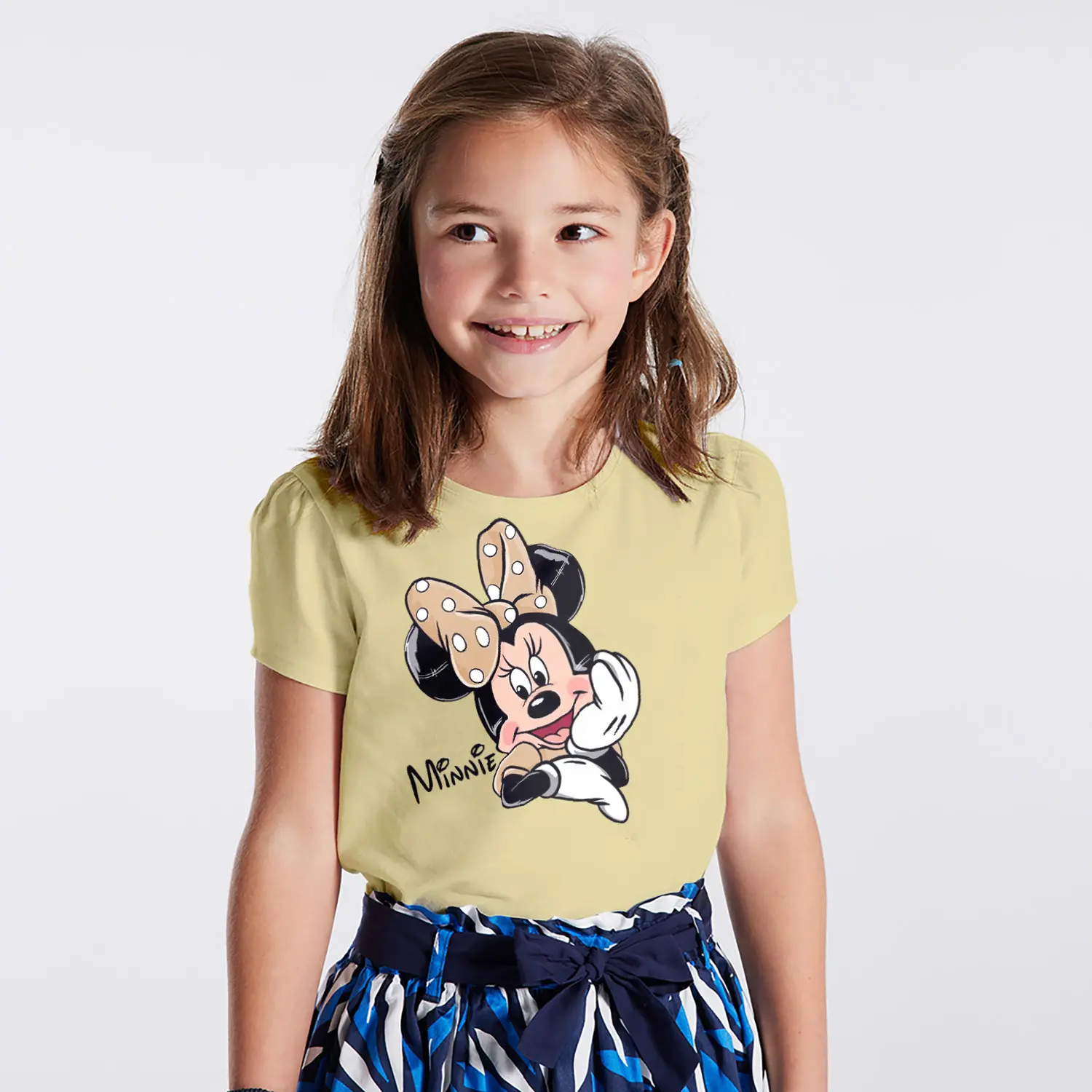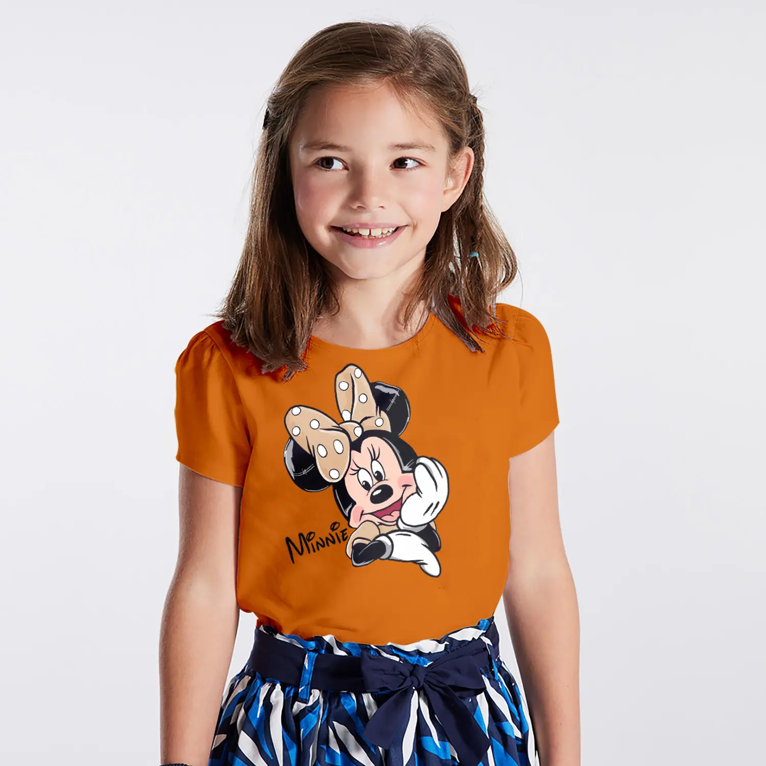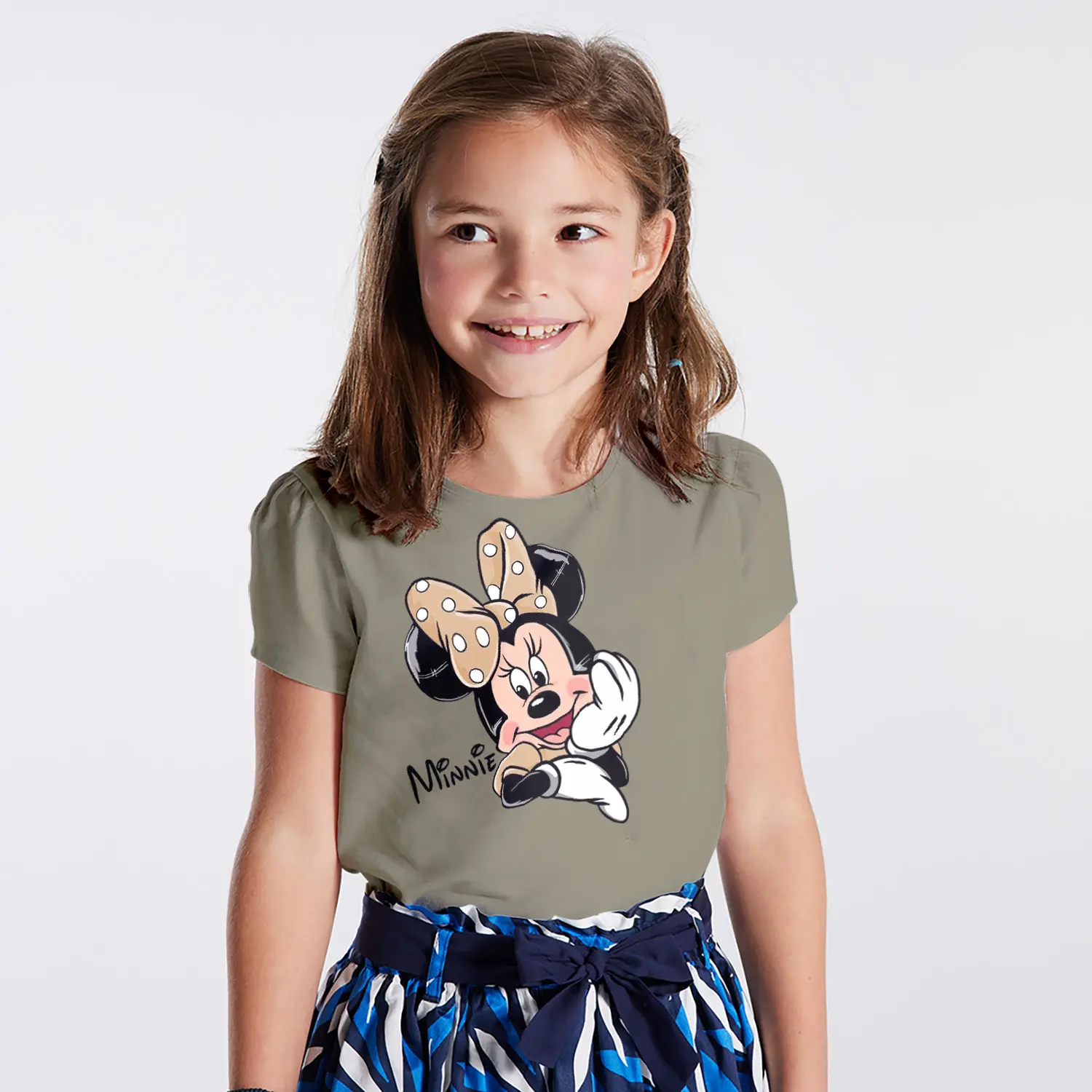 Fiyonklu Yuvarlak Kulaklı Fare Karikatür Minnie Yazılı Baskılı Kız Çocuk Tişörtü