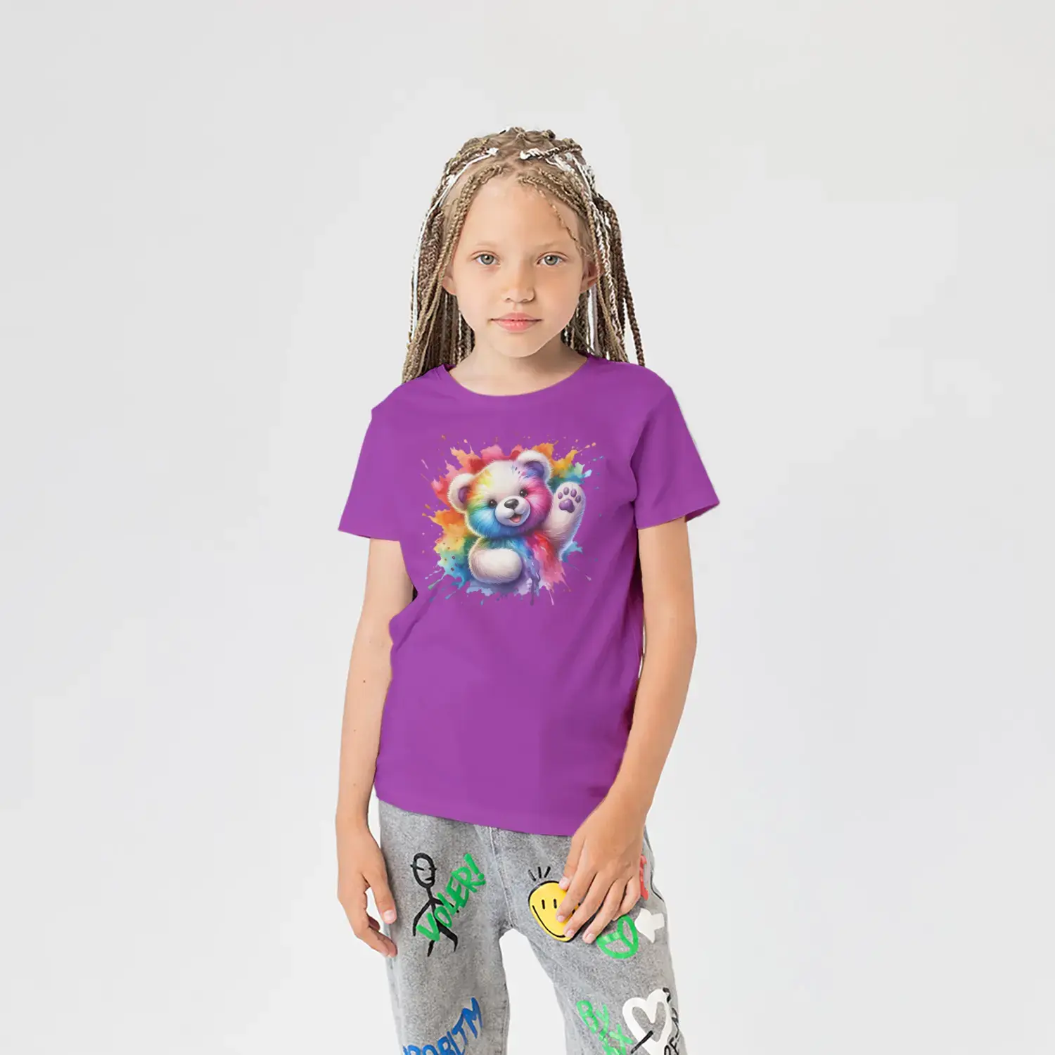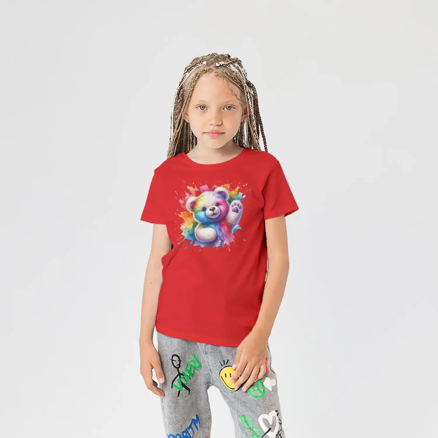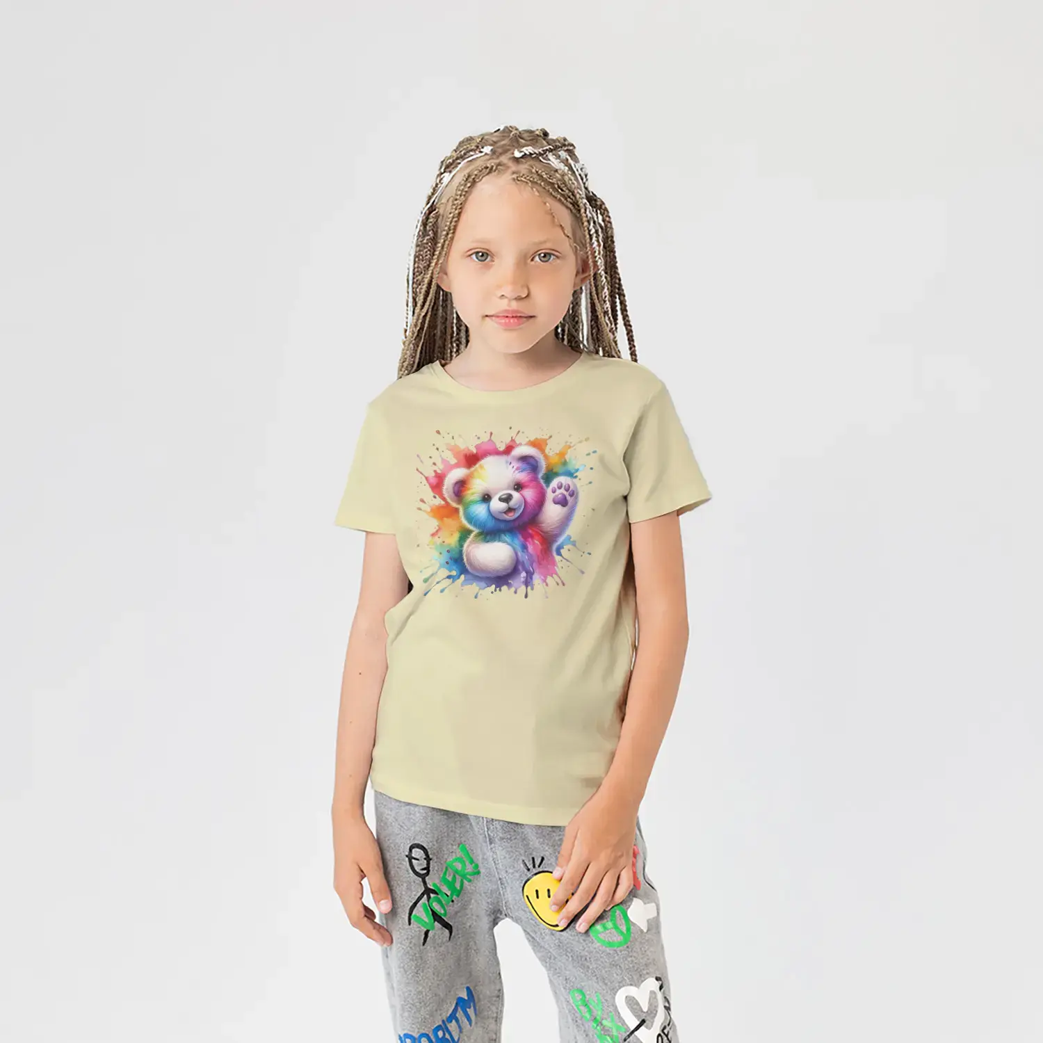 Gökkuşağı Renkli Sevimli Ayıcık Baskılı Kız Çocuk Tişörtü