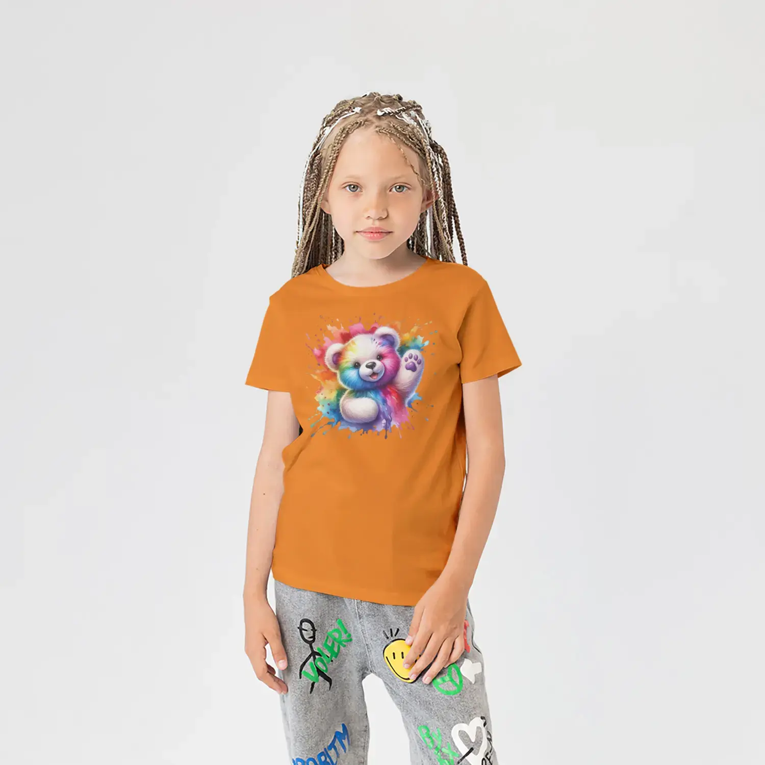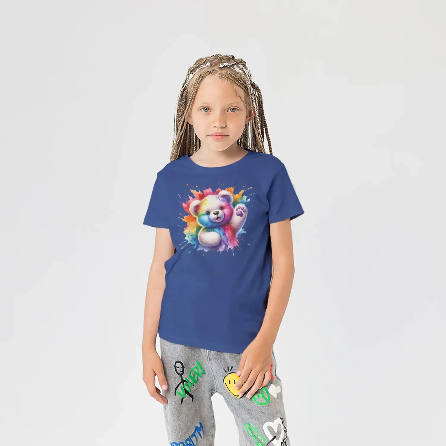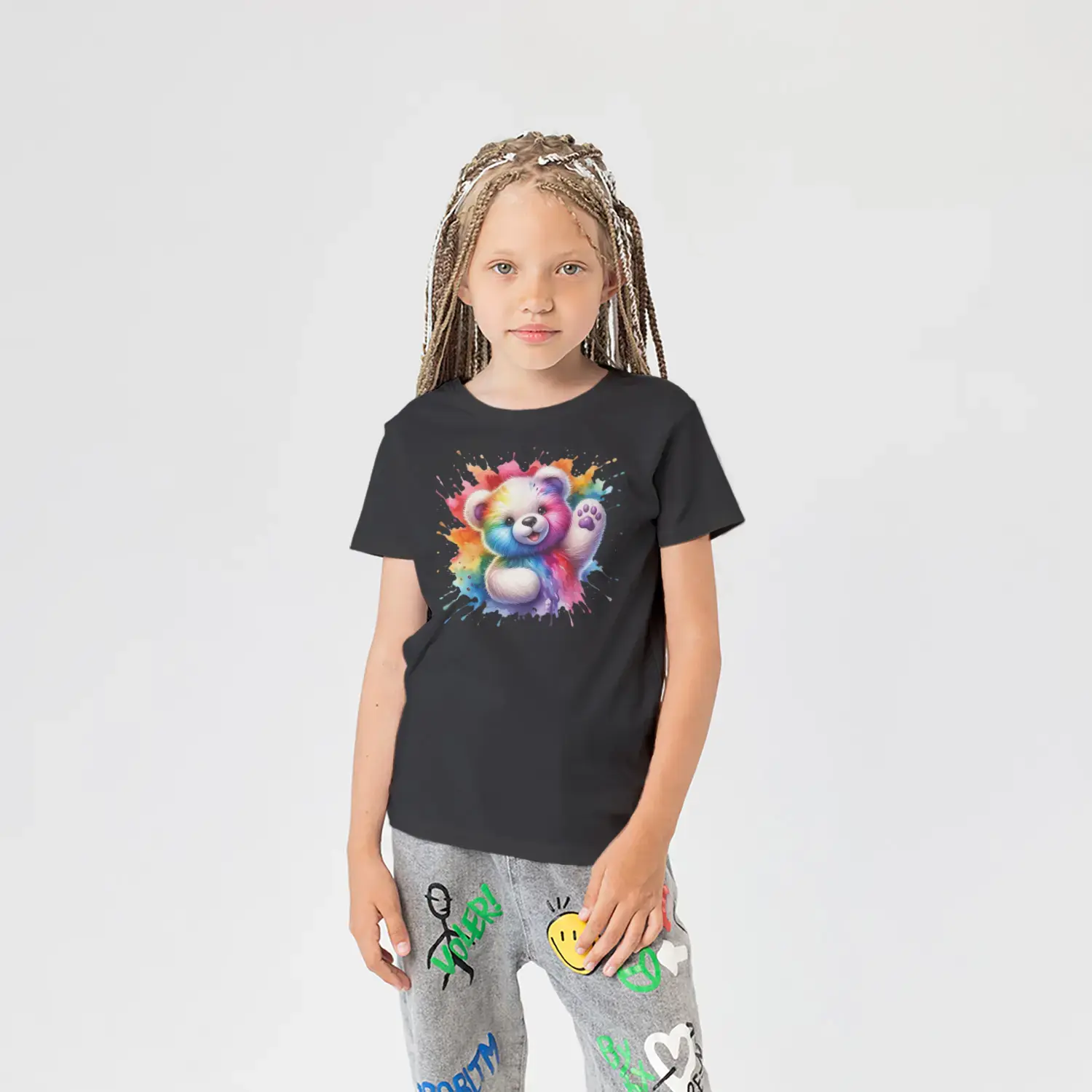 Gökkuşağı Renkli Sevimli Ayıcık Baskılı Kız Çocuk Tişörtü