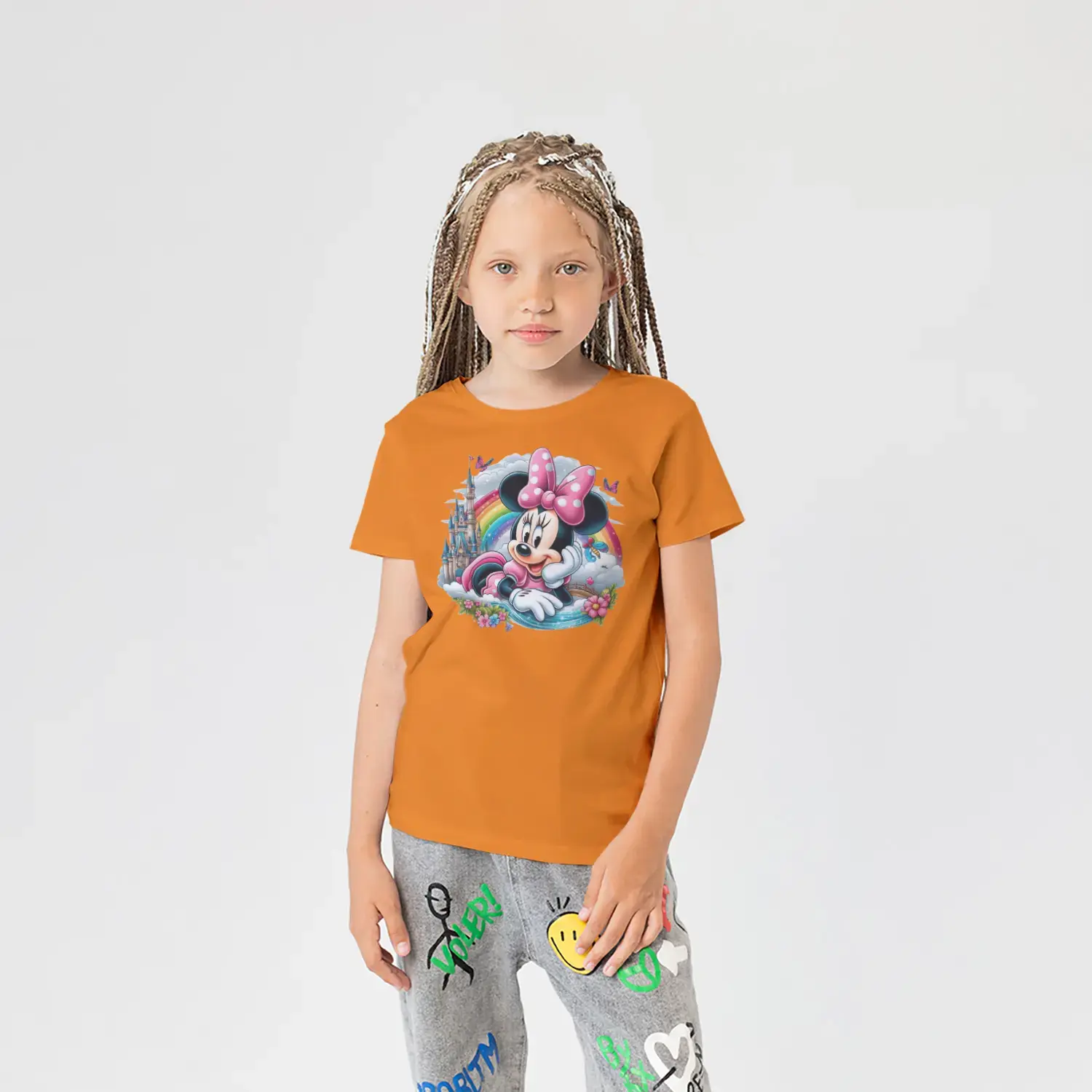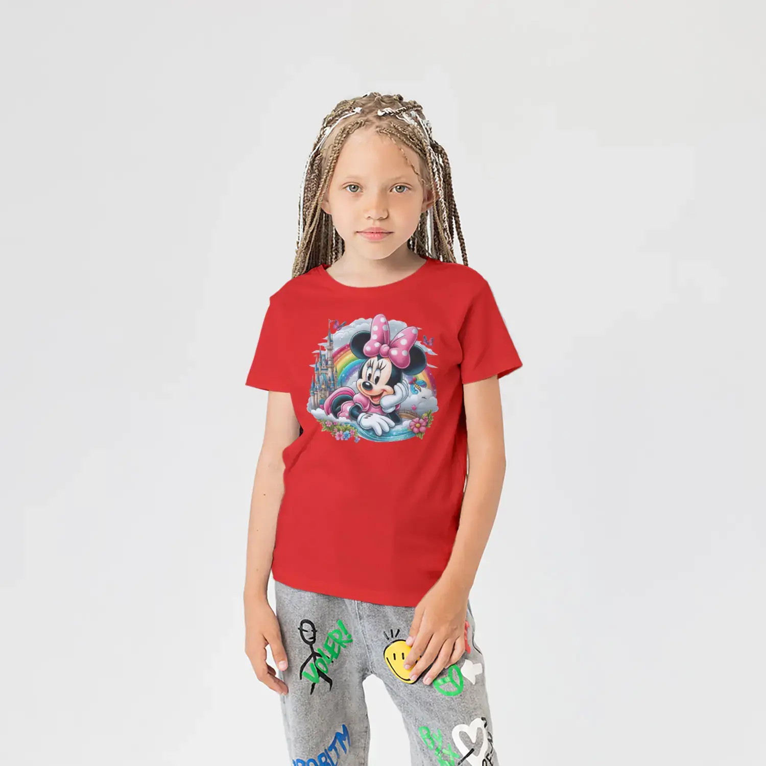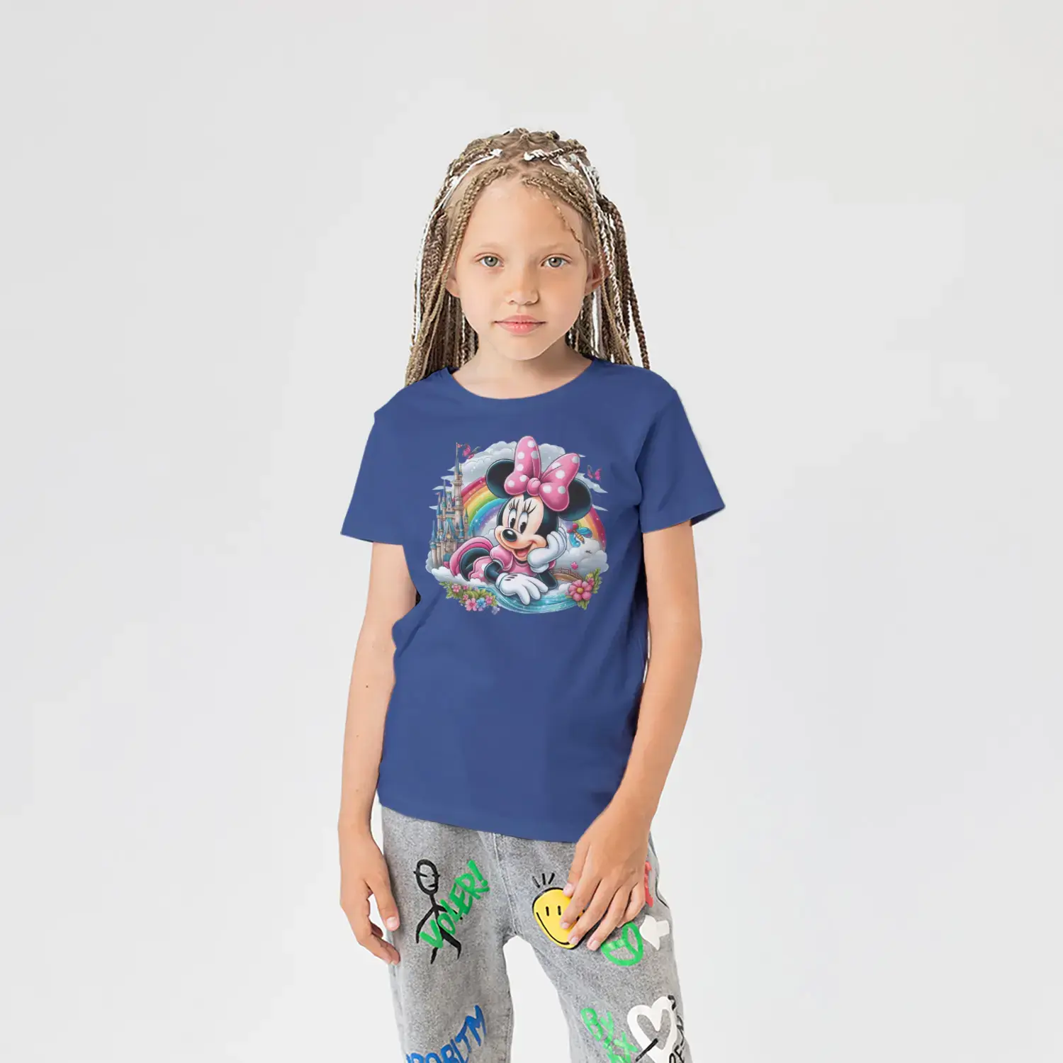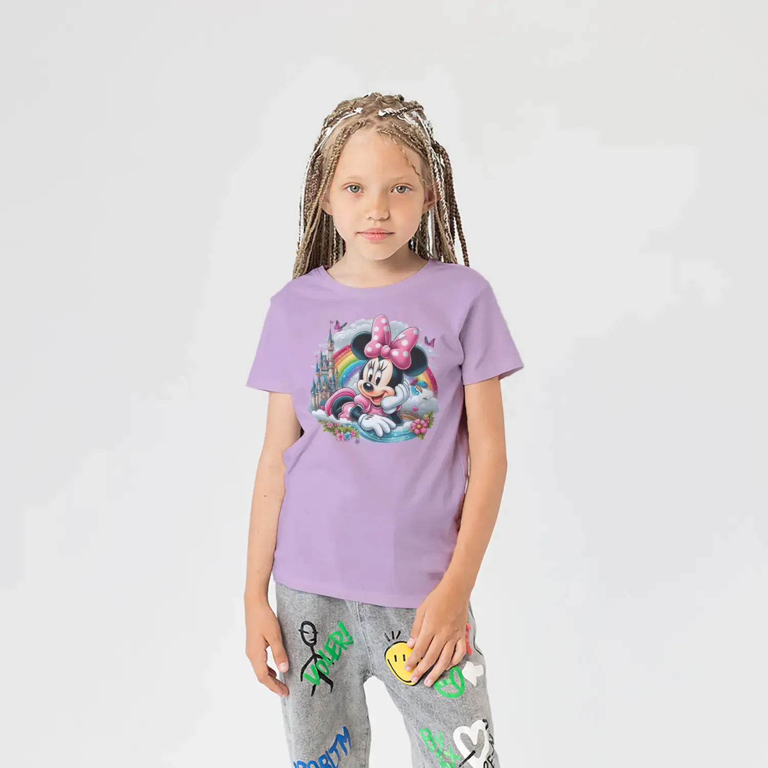 Gökkuşağı ve Şatolu Pembe Fiyonklu Fare Kahraman Baskılı Kız Çocuk Tişörtü