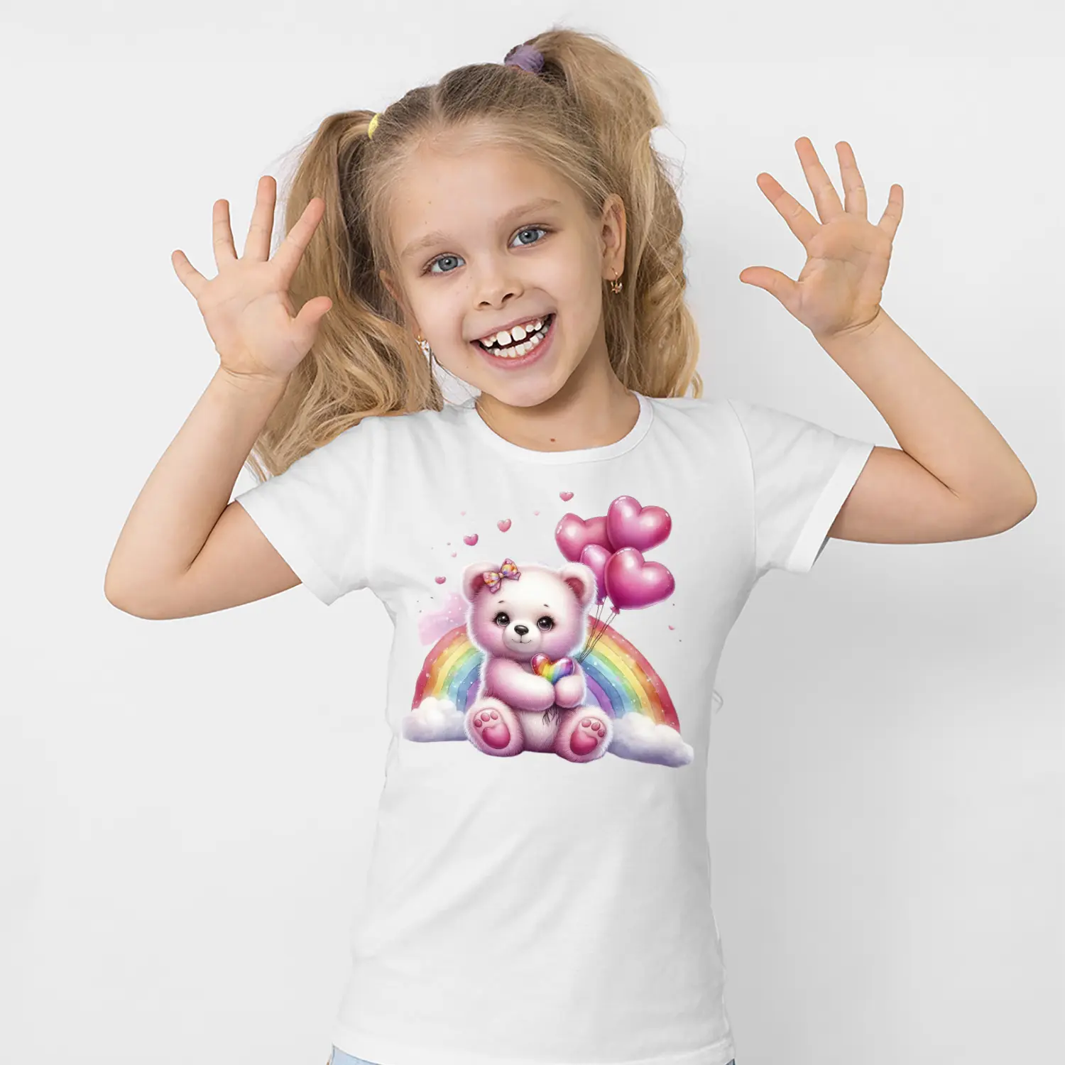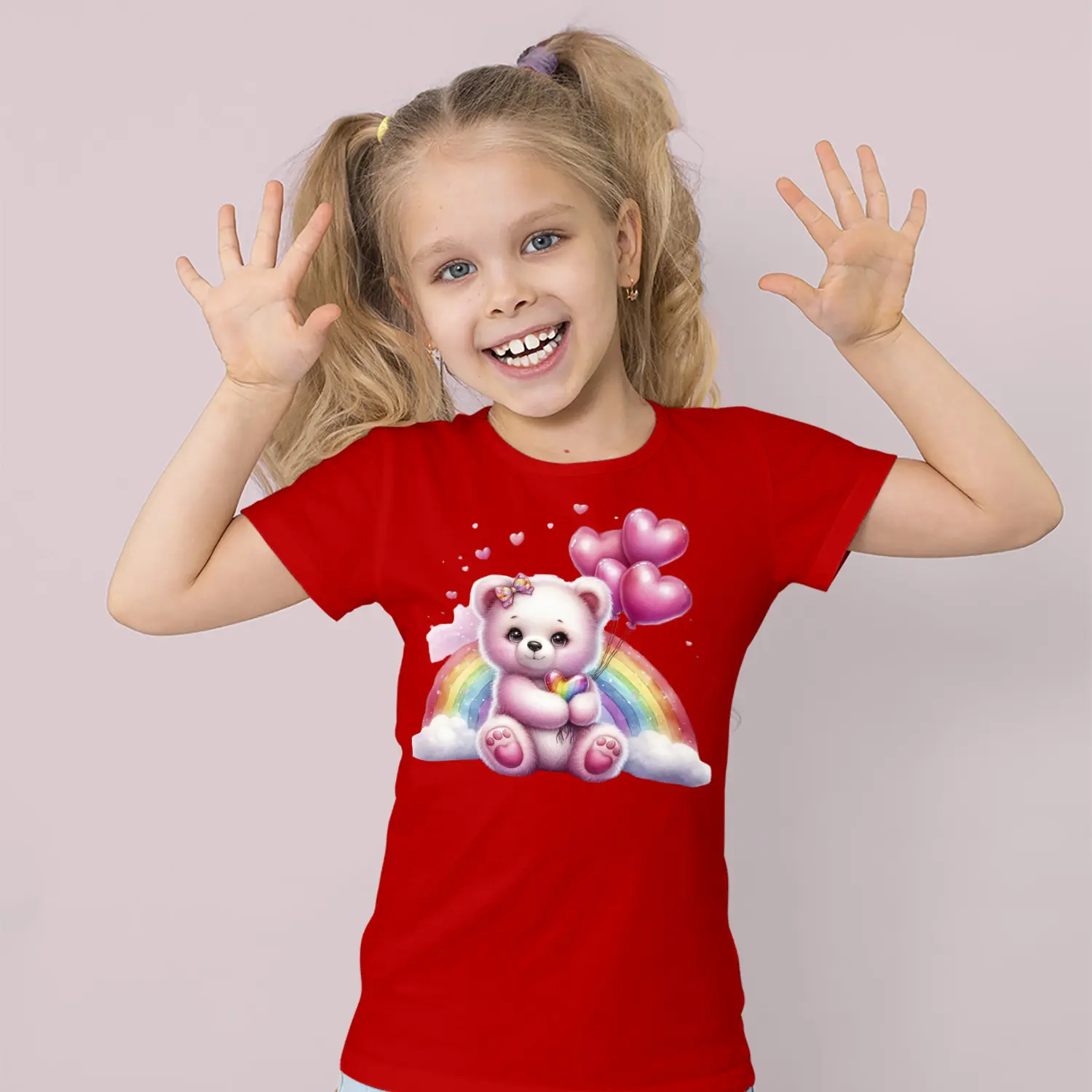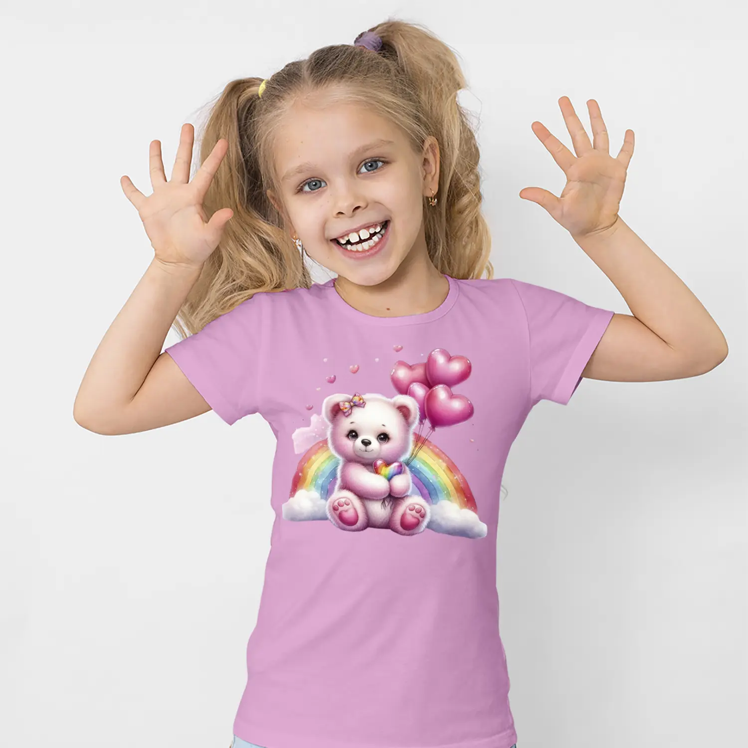 Gökkuşaklı Kalpli Balon Tutan Pembe Ayıcık Figürlü Baskılı Kız Çocuk Tişörtü