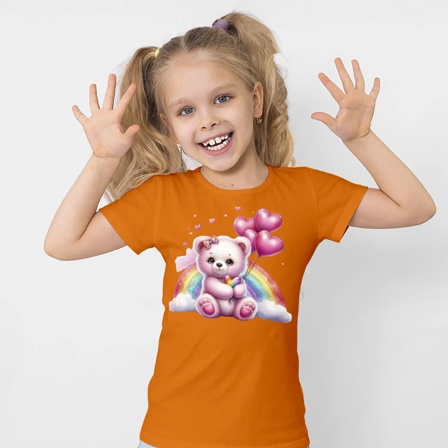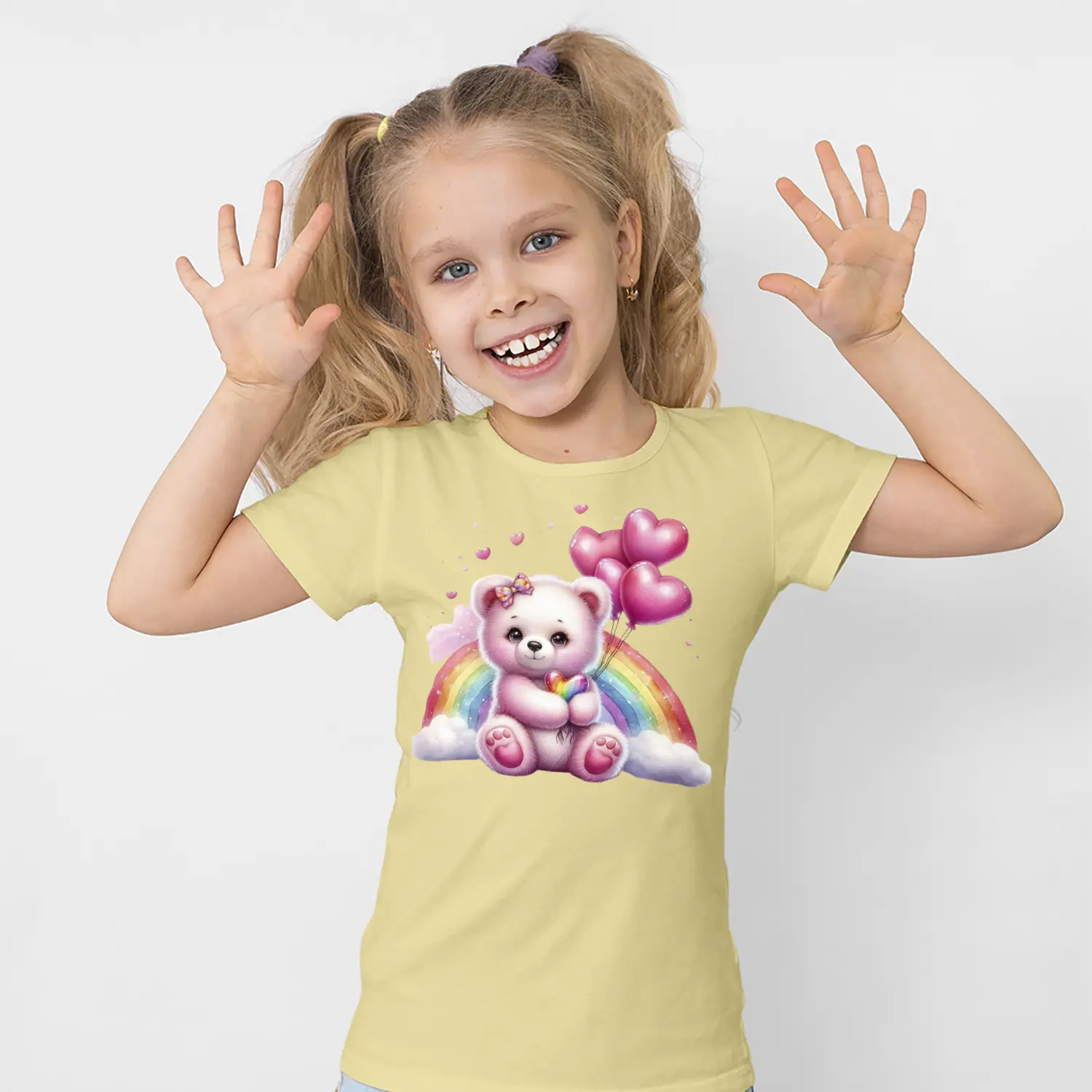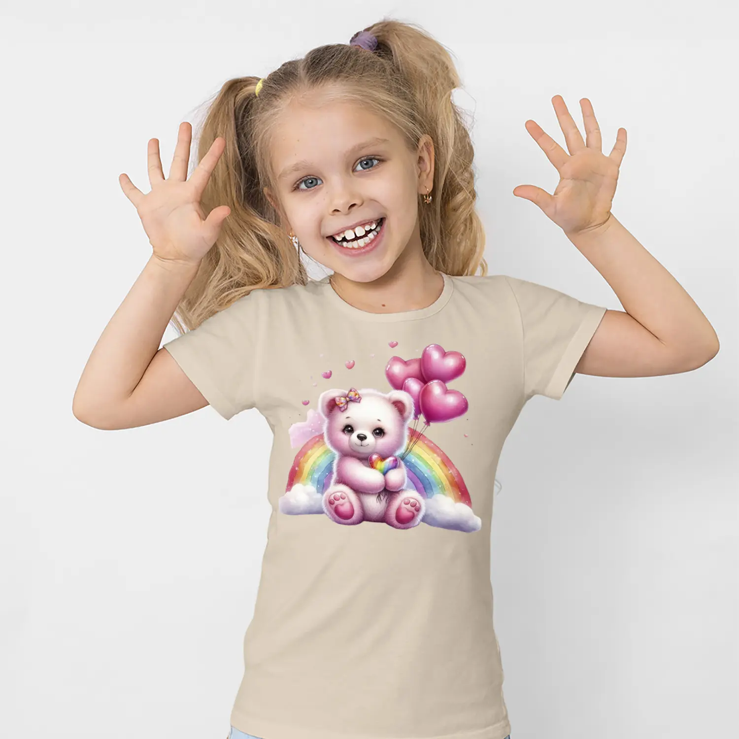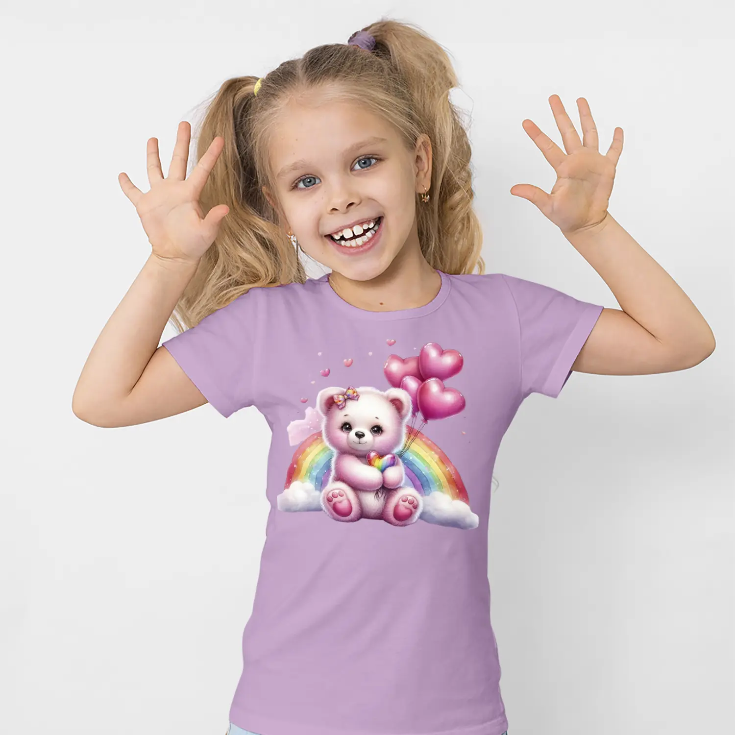 Gökkuşaklı Kalpli Balon Tutan Pembe Ayıcık Figürlü Baskılı Kız Çocuk Tişörtü