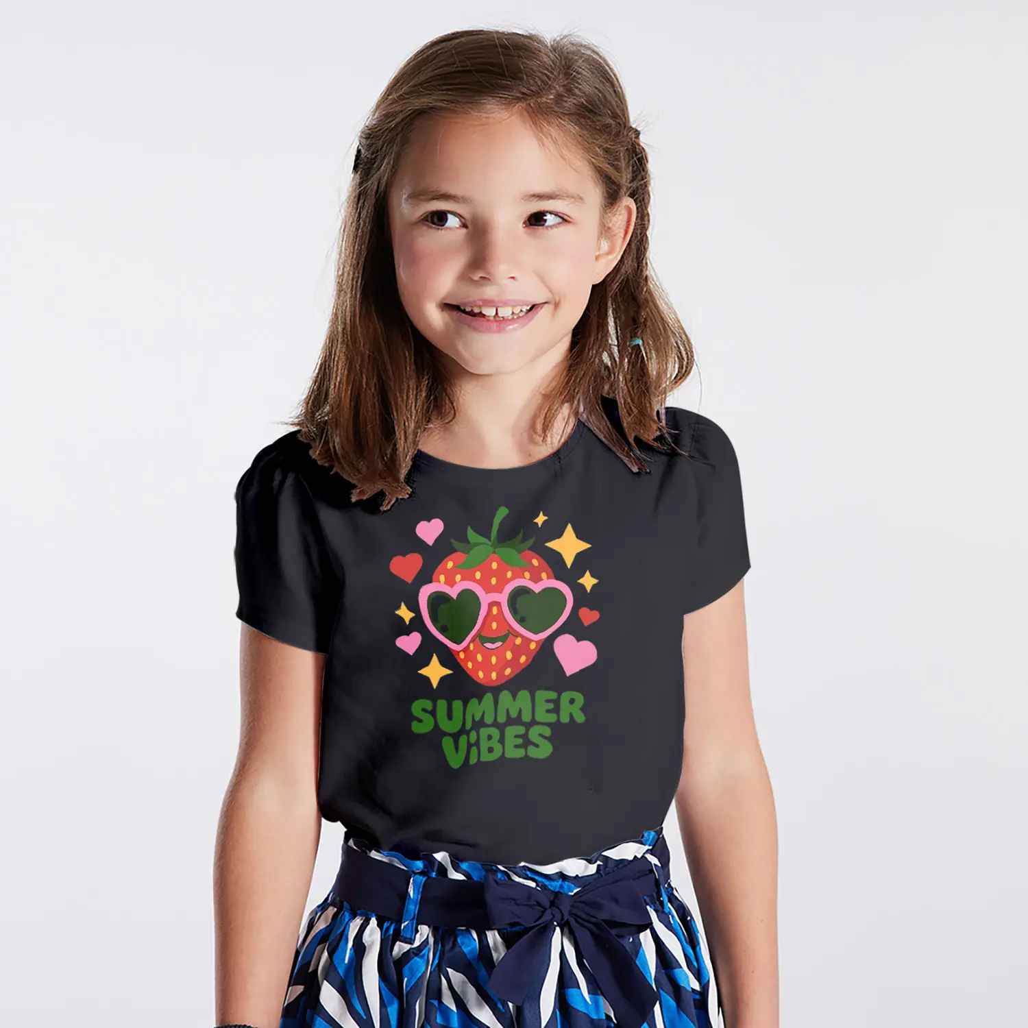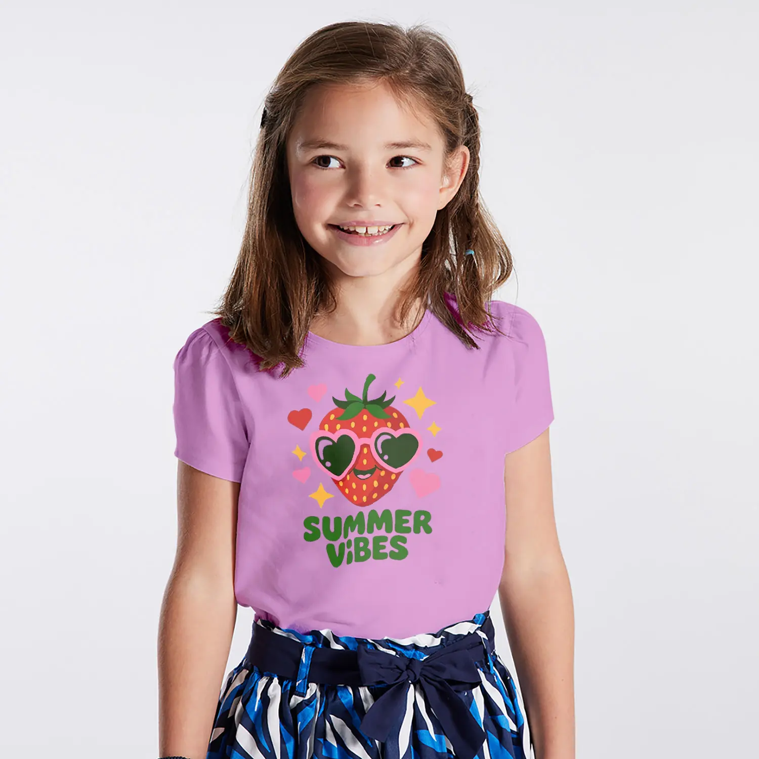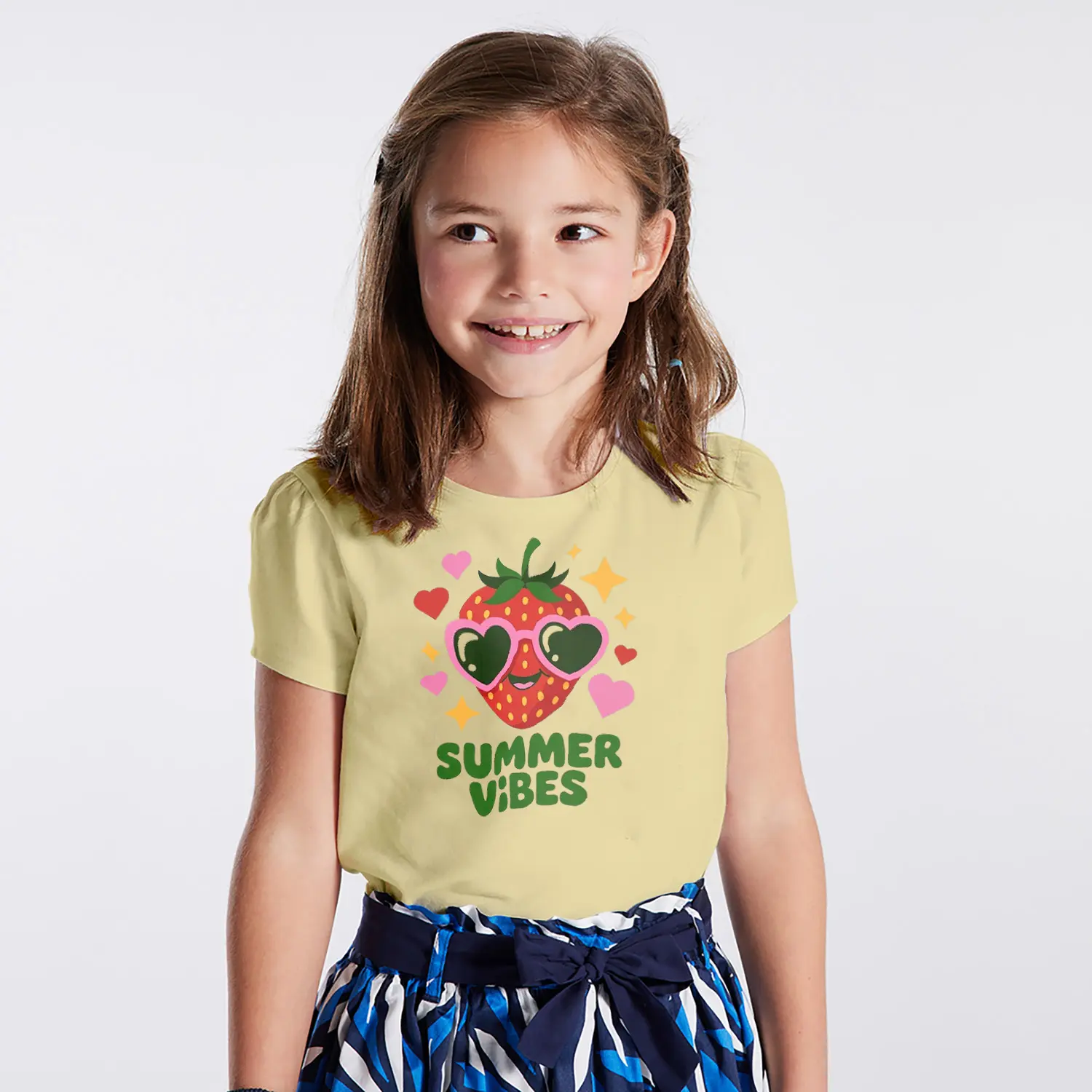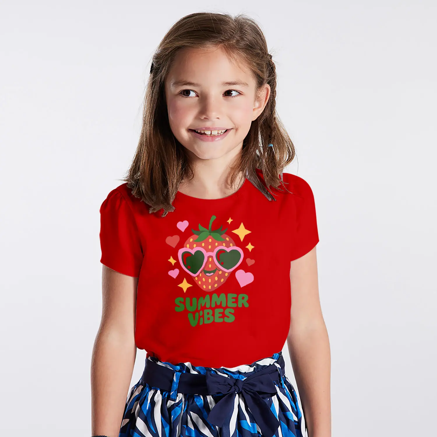 Güneş Gözlüklü Çilek Summer Vibes Yazılı Baskılı Kız Çocuk Tişörtü