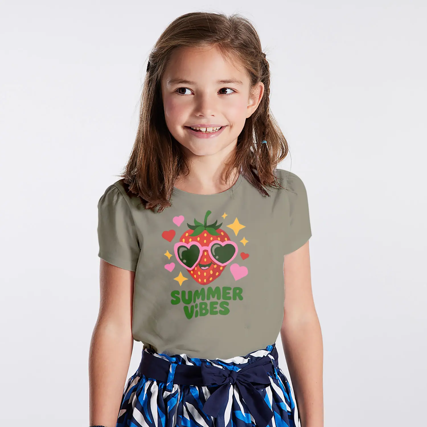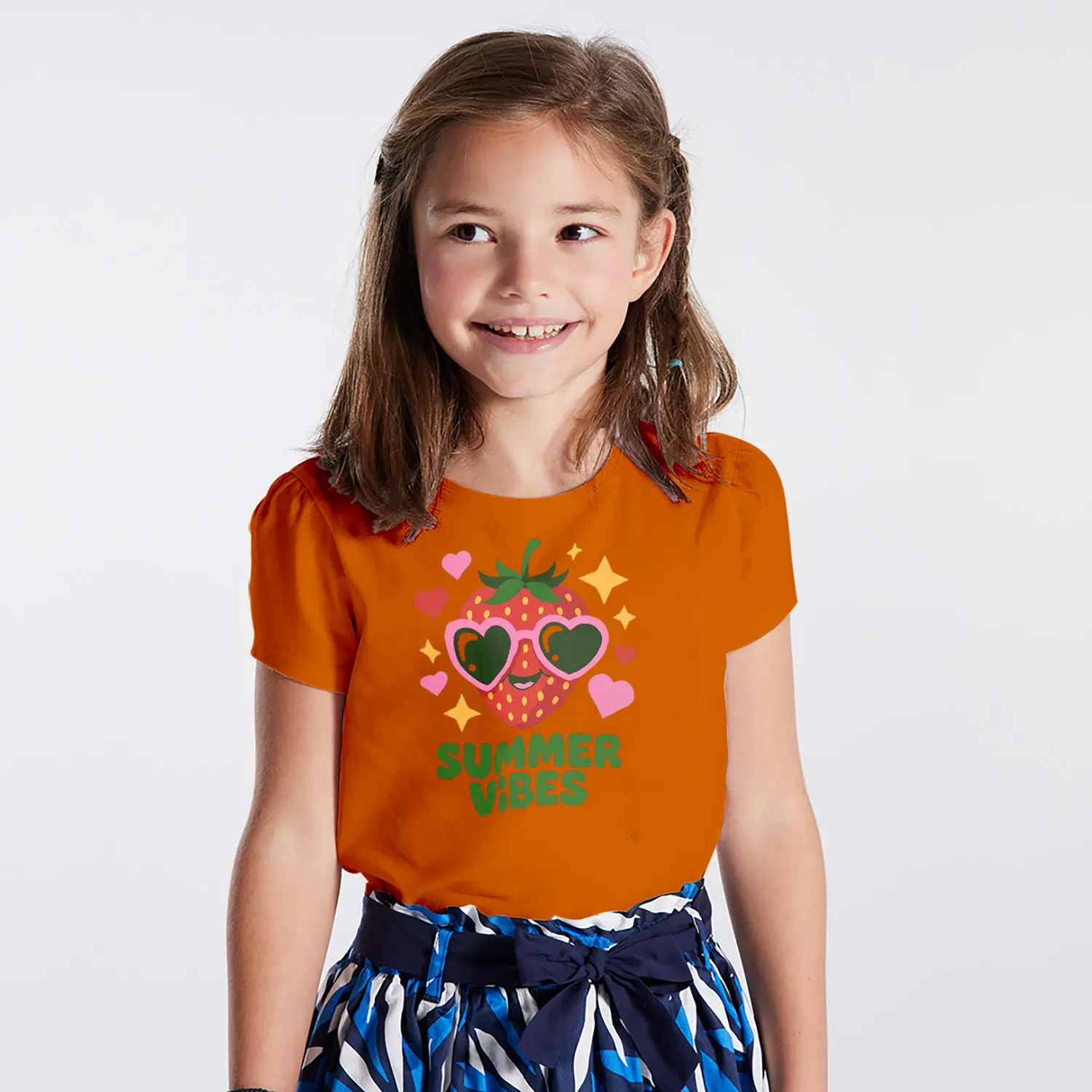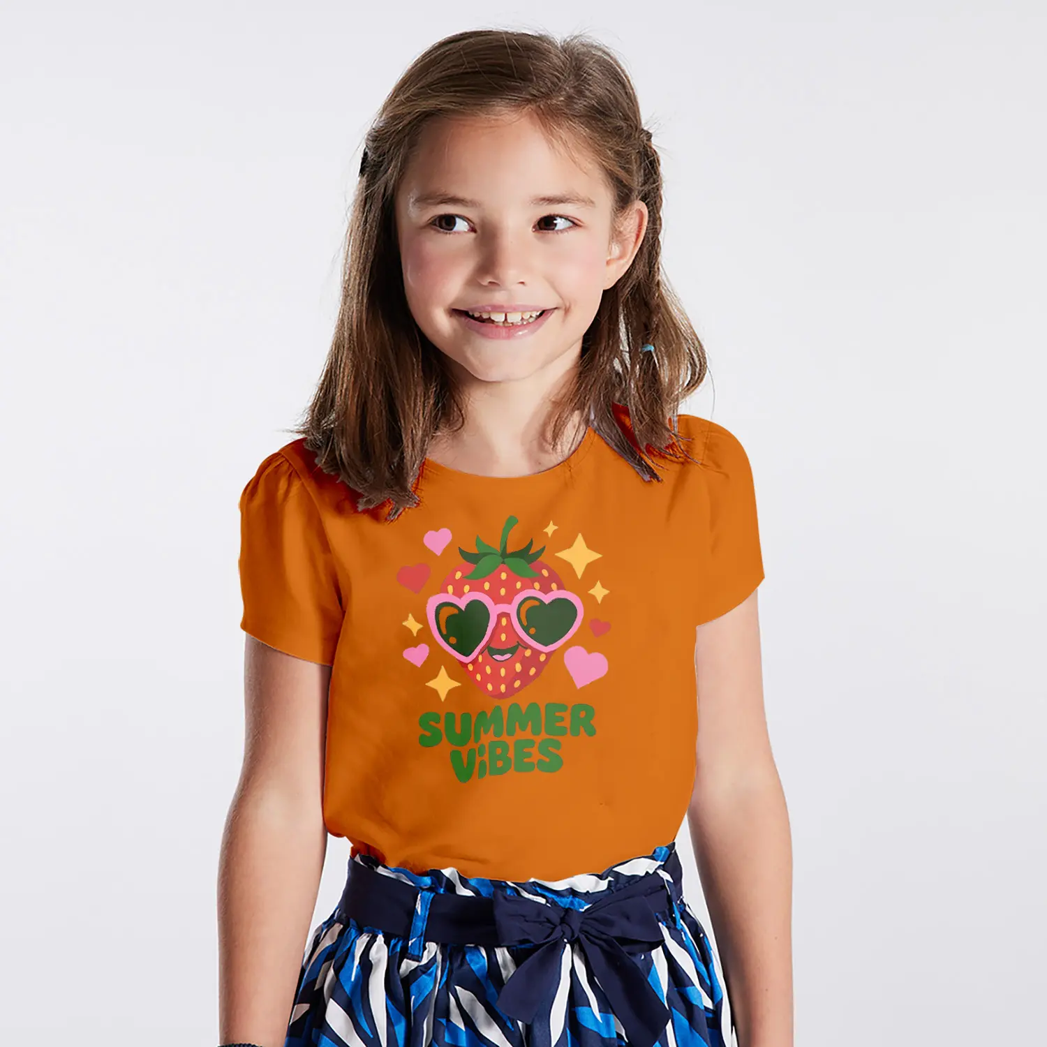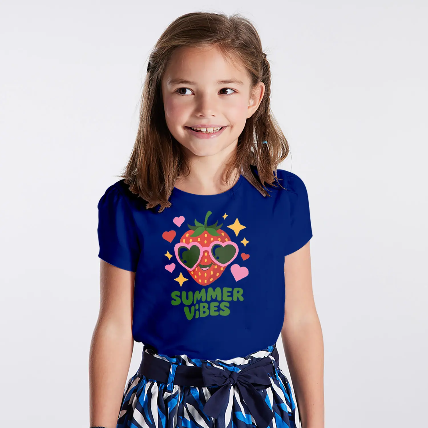 Güneş Gözlüklü Çilek Summer Vibes Yazılı Baskılı Kız Çocuk Tişörtü