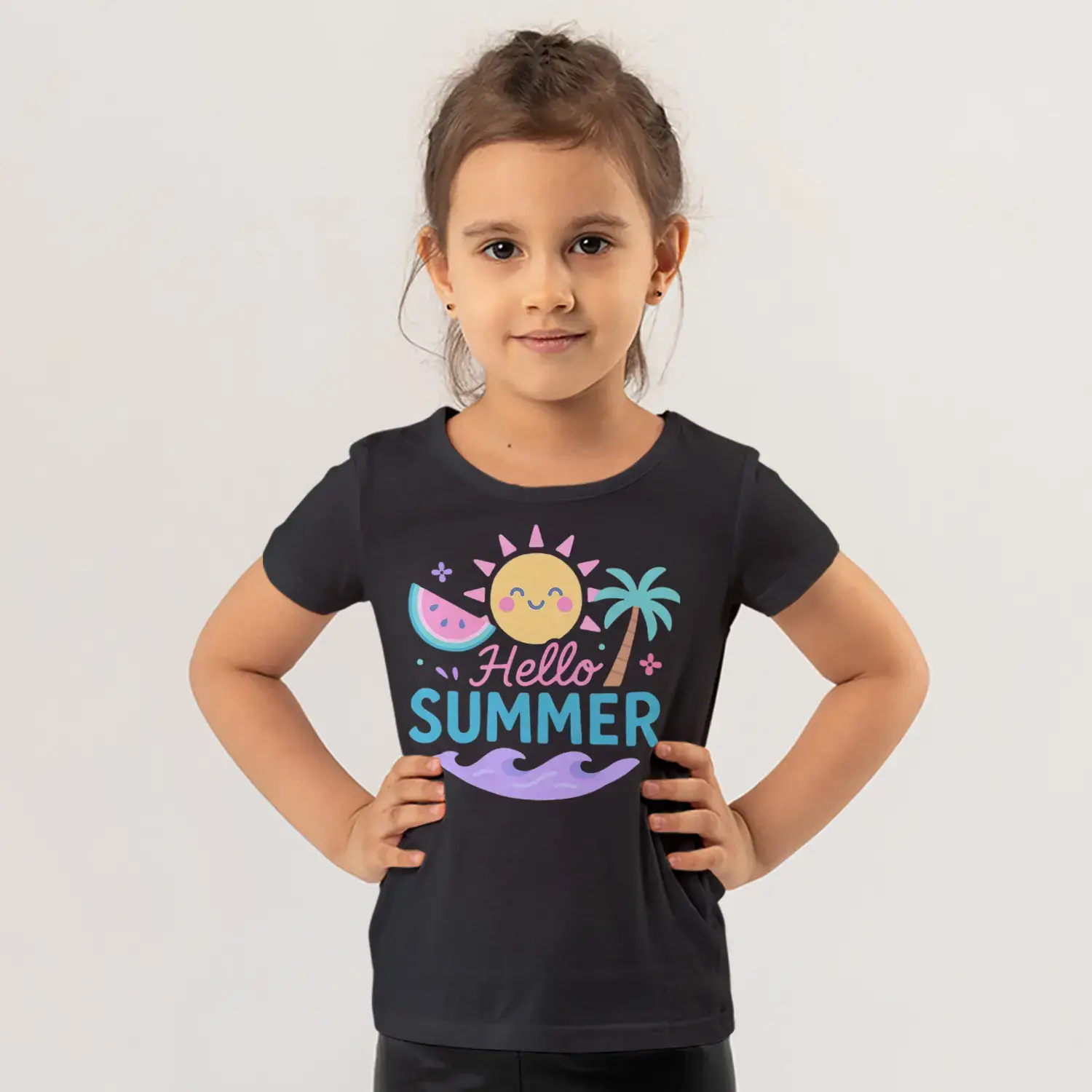 Hello Summer Güneş Palmiye Karpuz Yaz Temalı Baskılı Kız Çocuk Tişörtü