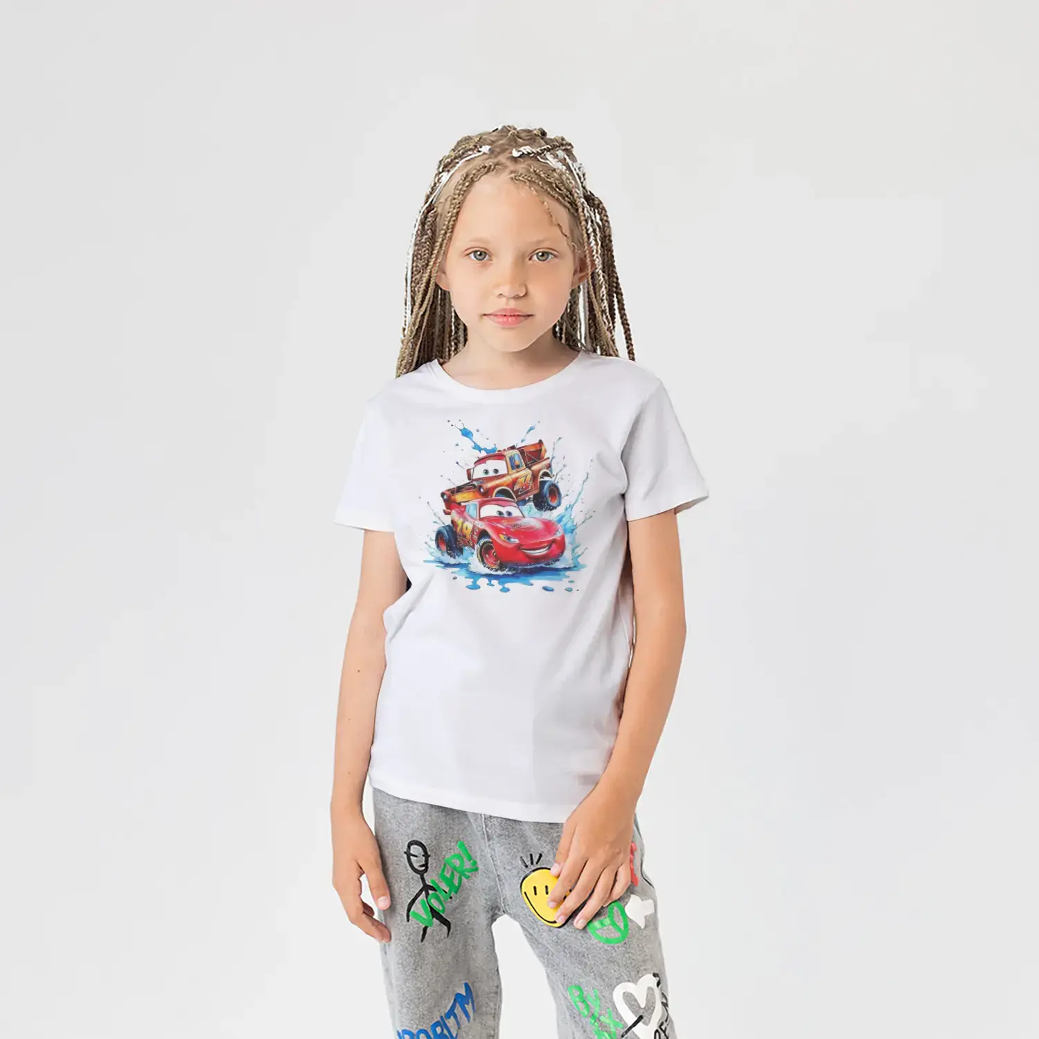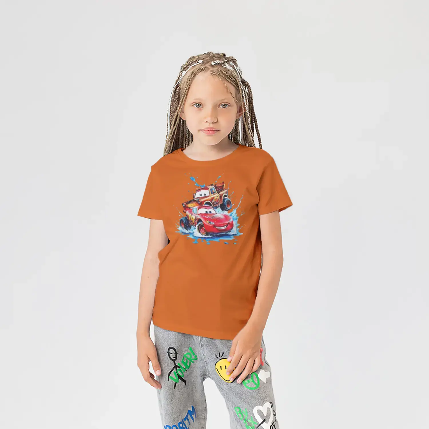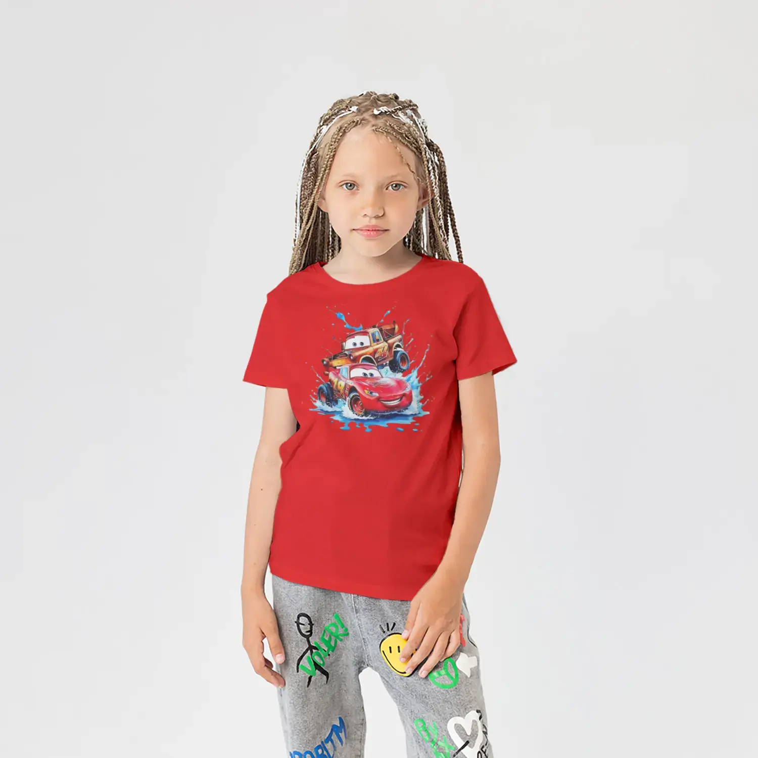 Hızlı Kırmızı Yarış Arabası ve Arkadaşı Baskılı Kız Çocuk Tişörtü