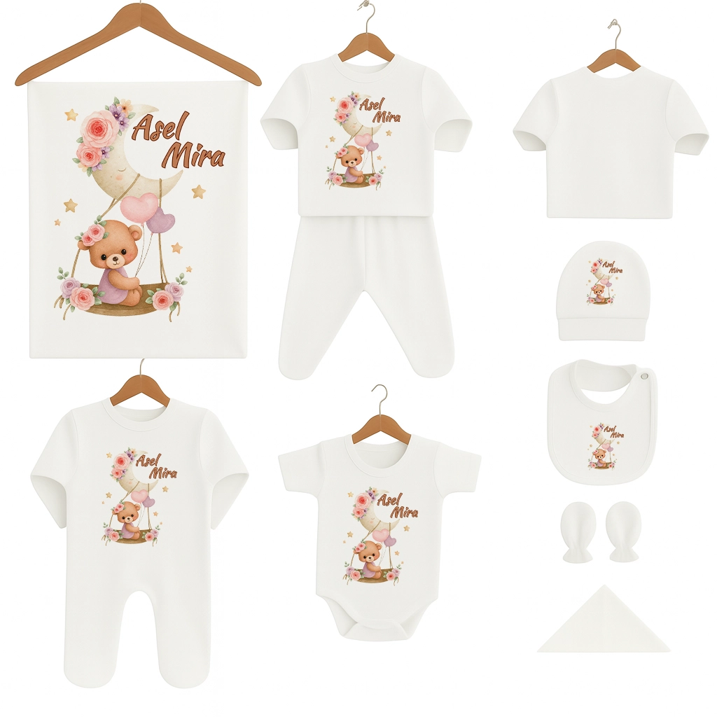 Bebeğinizin dünyaya gözlerini açtığı ilk gün, hayatınızın en değerli ve özel anlarından biridir. Ona, hem konfor hem de şık bir tasarımla merhaba demek için tasarladığımız Salıncakta Sallanan Ayıcık Temalı 10’lu Hastane Çıkış Seti, huzur veren renkleri, zarif detayları ve isme özel baskısıyla bebeğinizin ilk günlerini unutulmaz kılar.