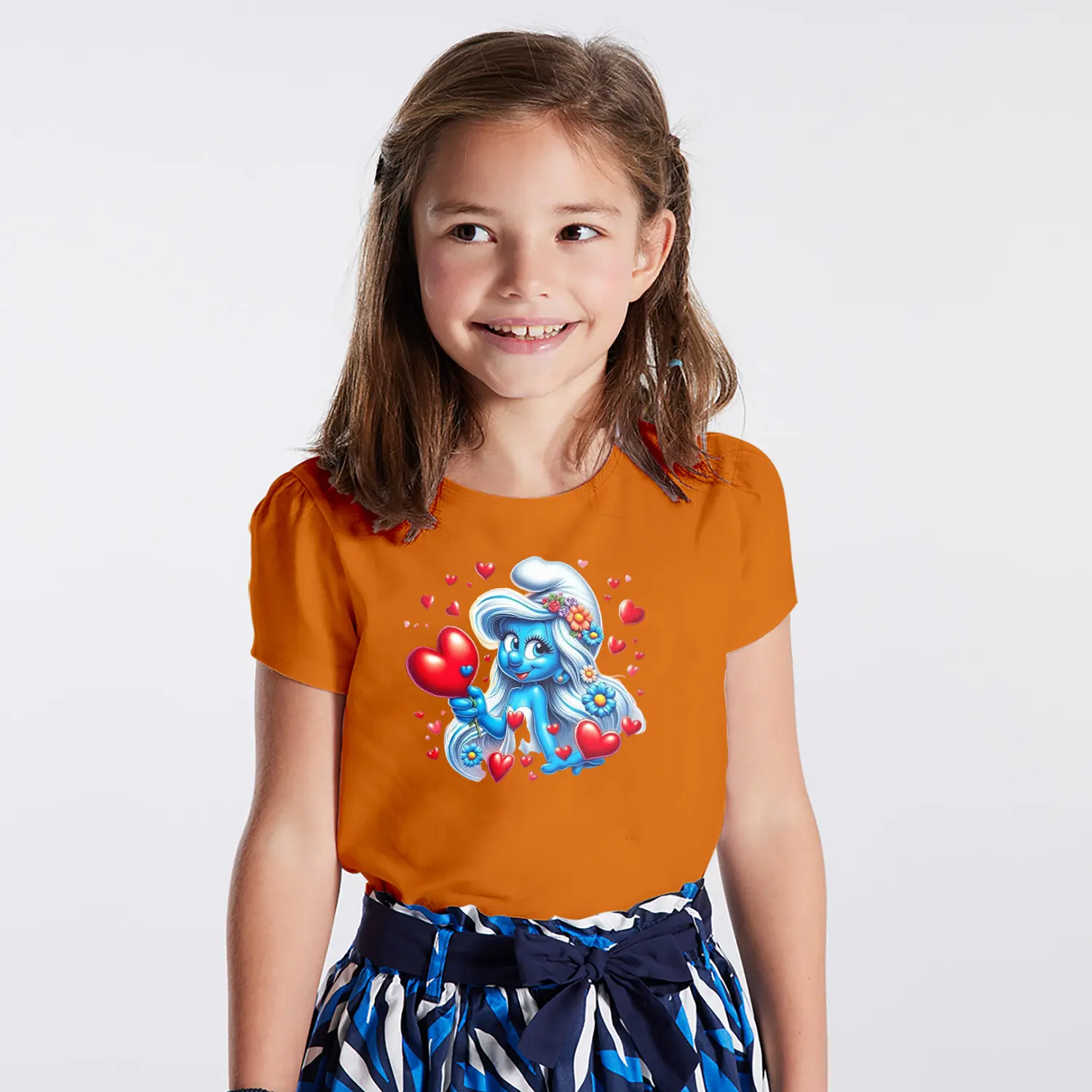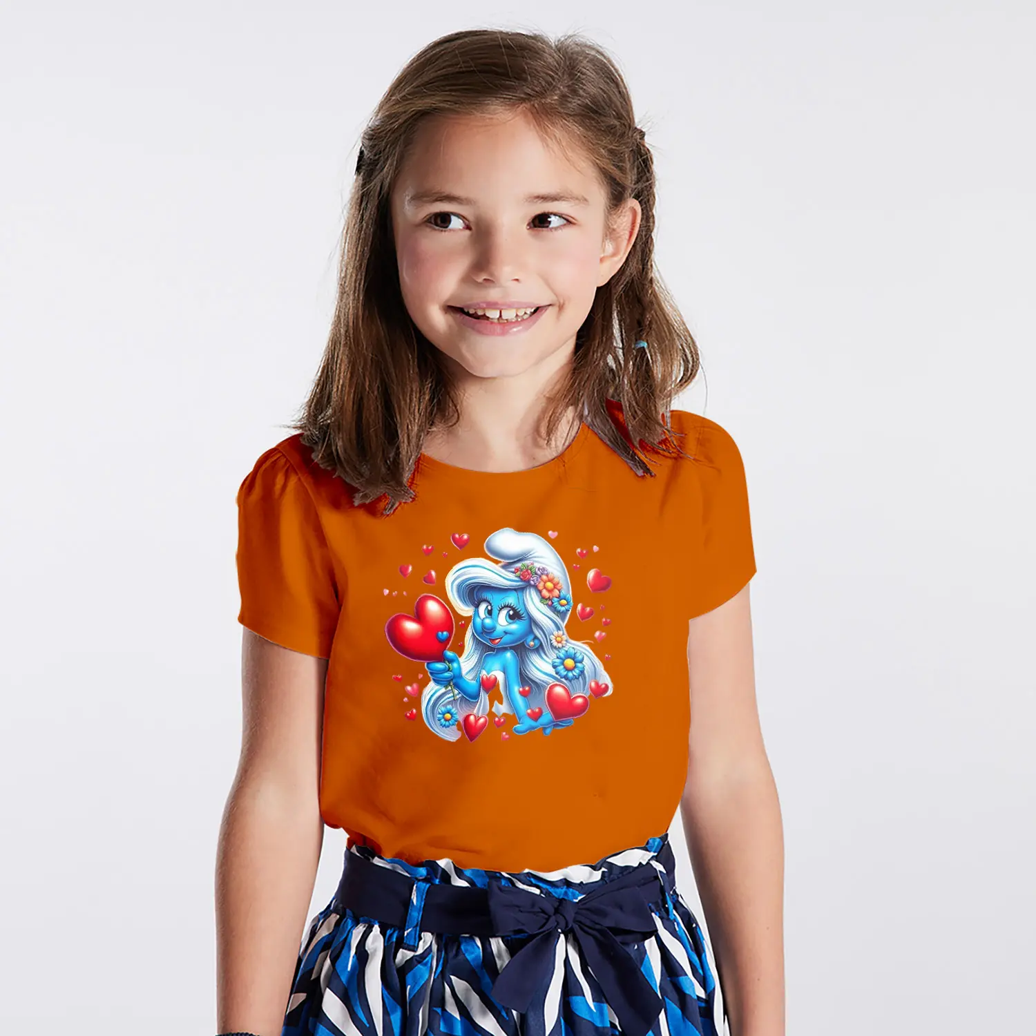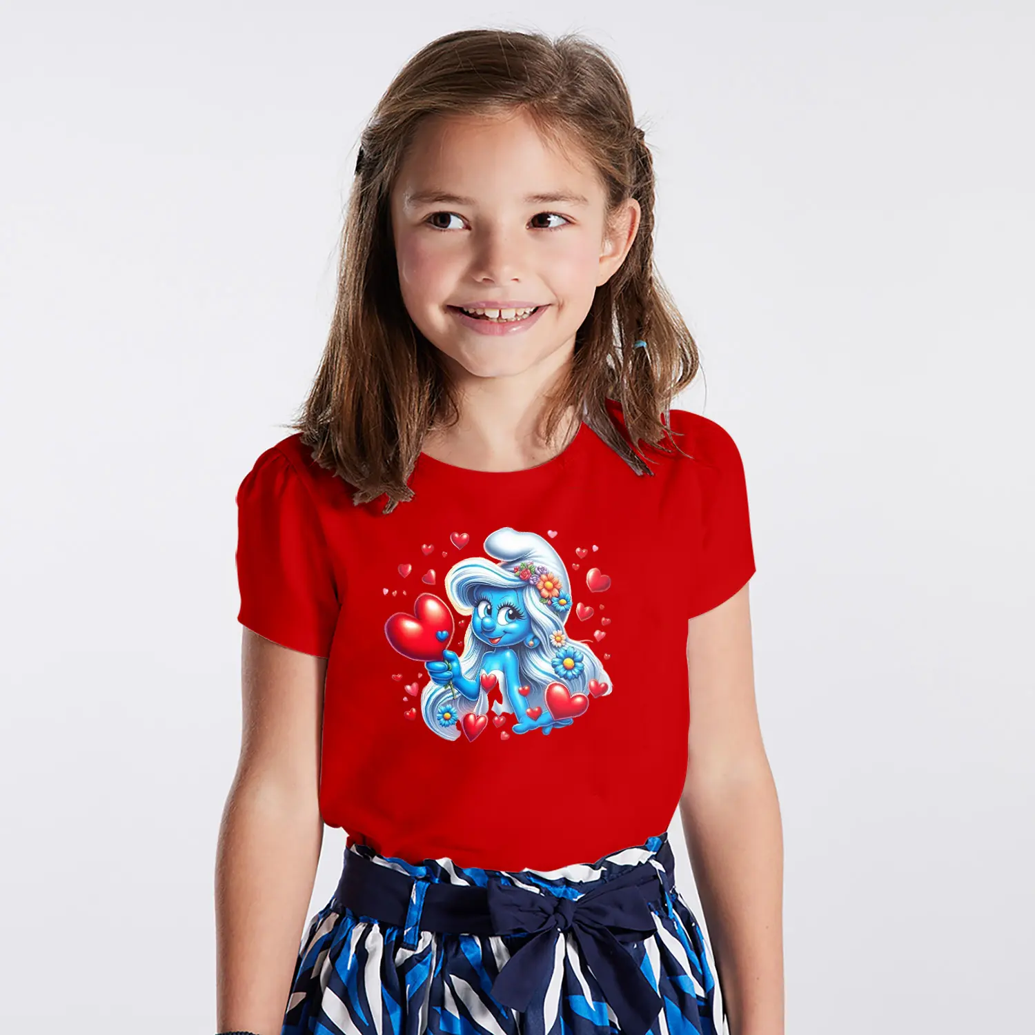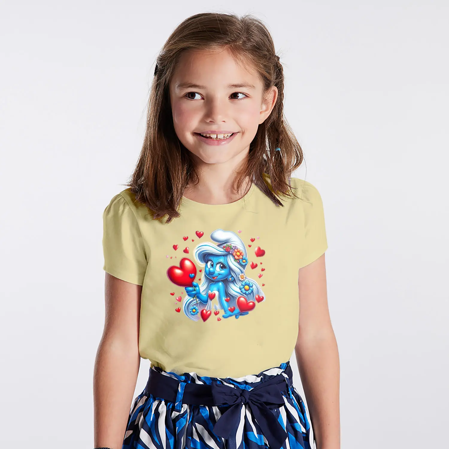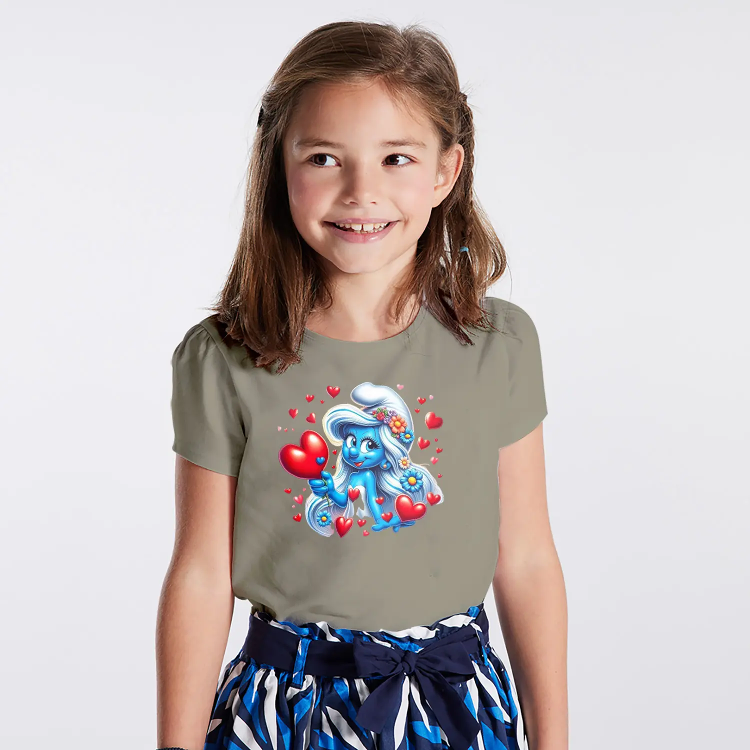 Kalpli Çiçekli Mavi Cüce Kız Karikatür Figürlü Baskılı Kız Çocuk Tişörtü