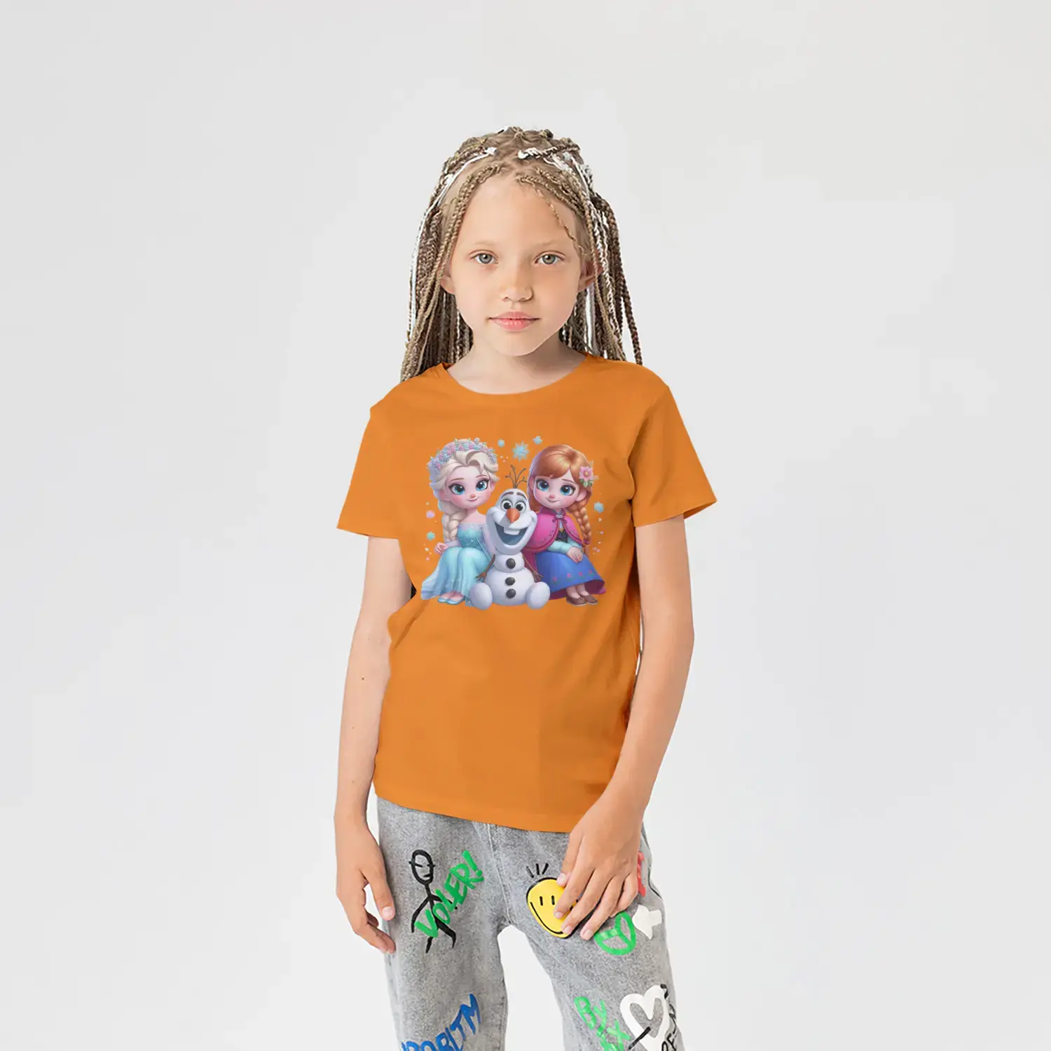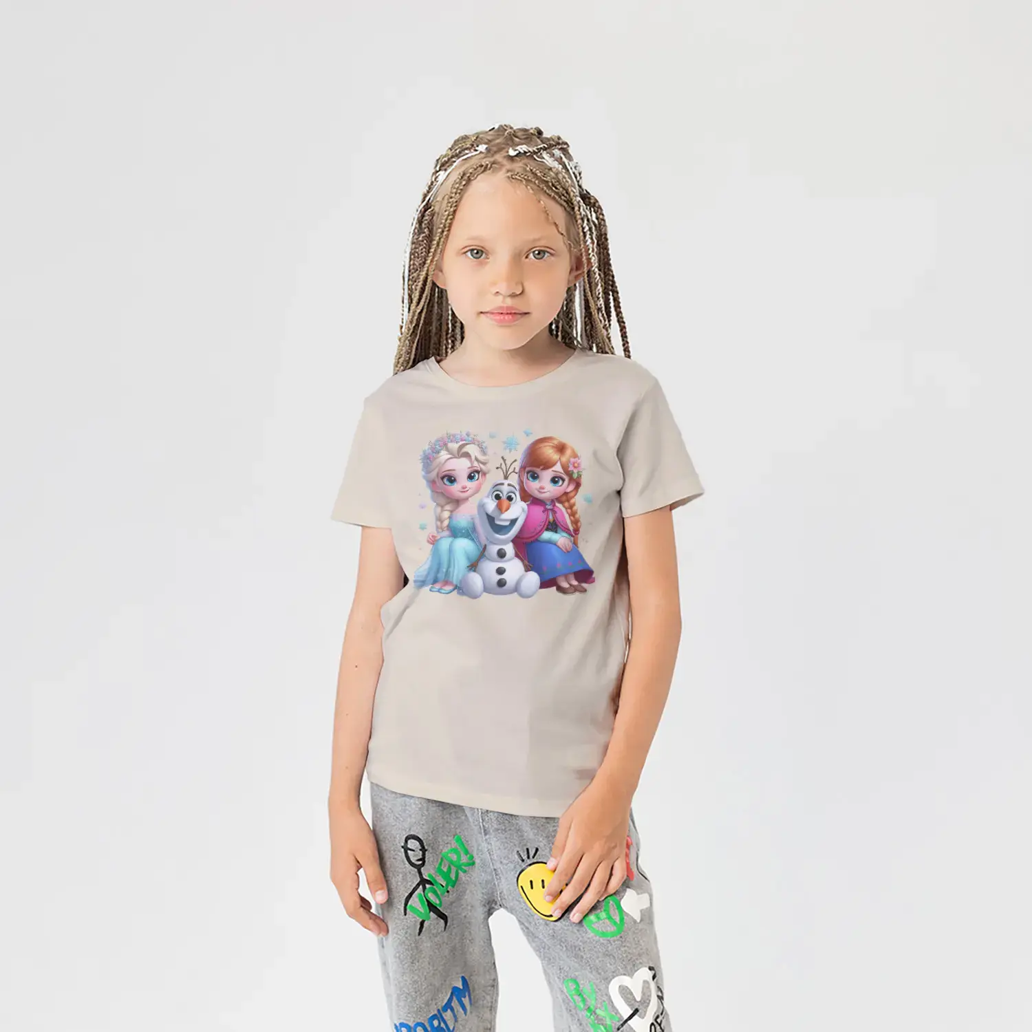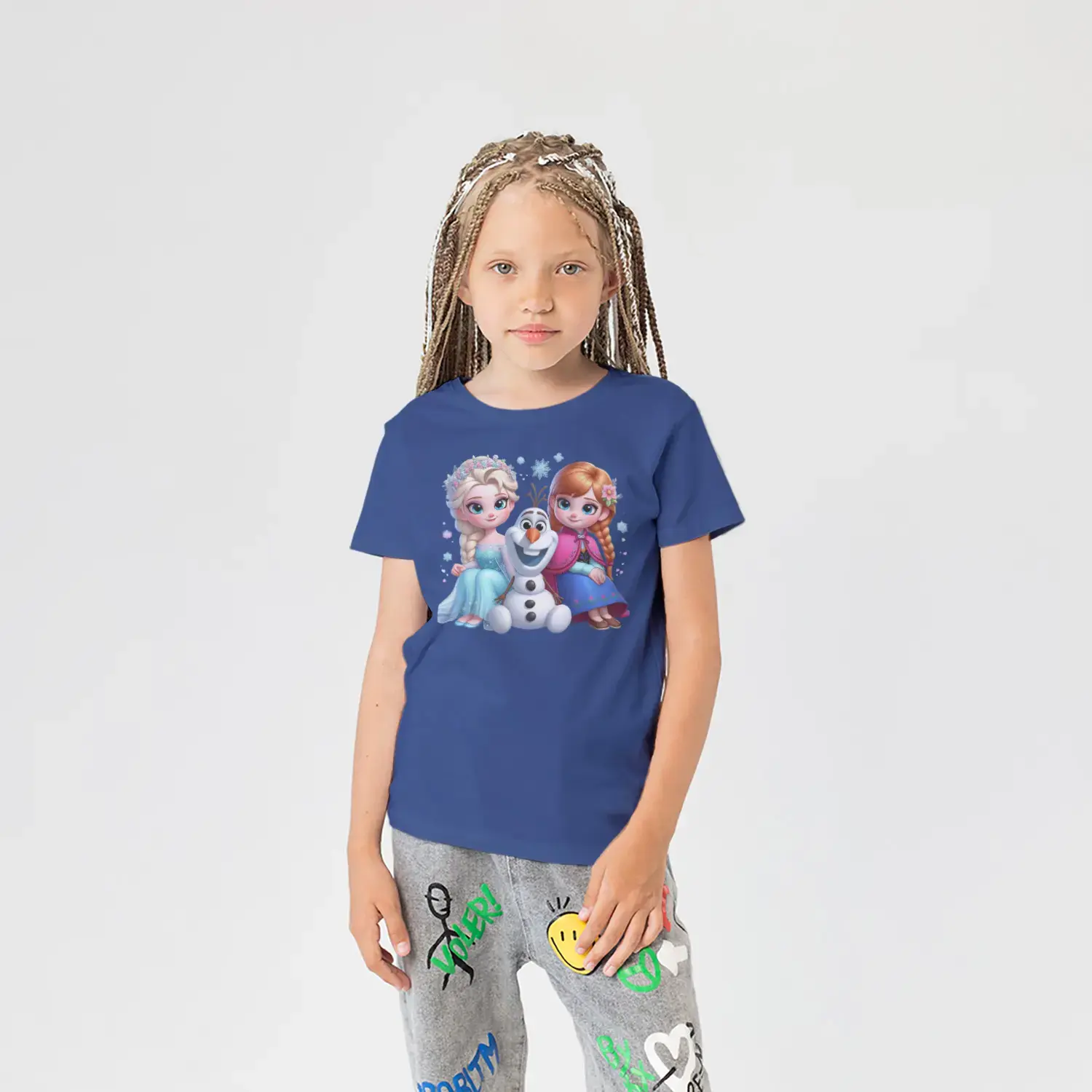 Kar Taneli Buz Prensesleri ve Kardan Adam Üçlü Baskılı Kız Çocuk Tişörtü