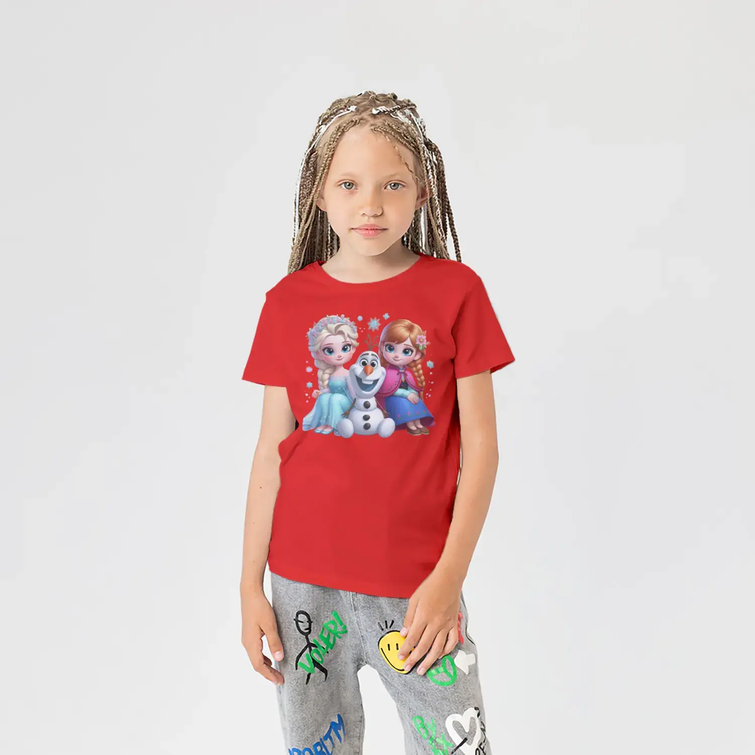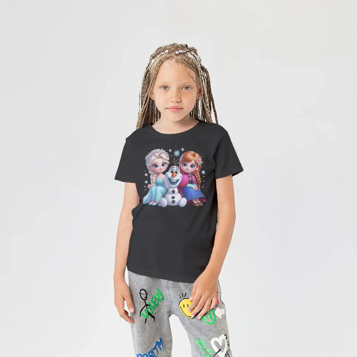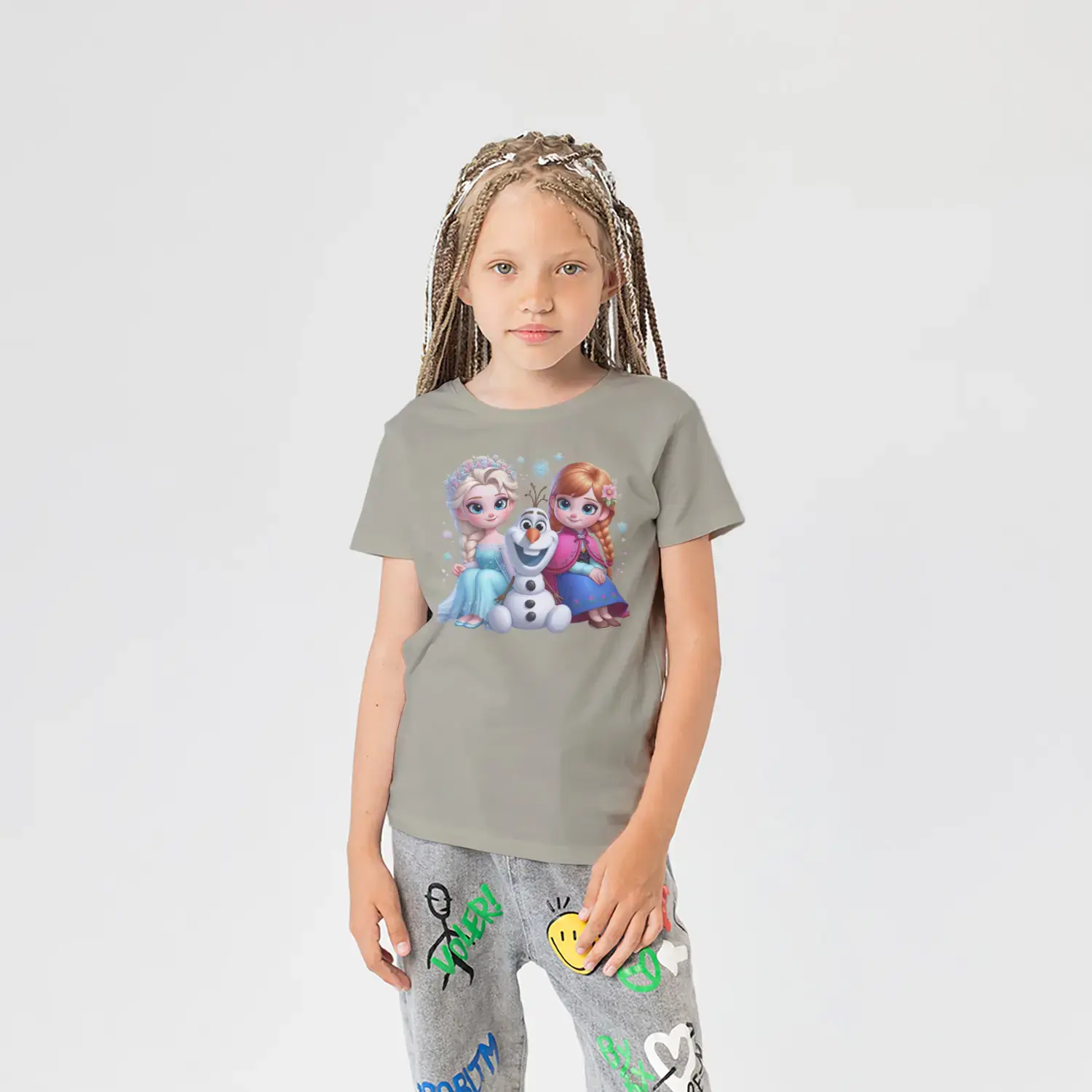 Kar Taneli Buz Prensesleri ve Kardan Adam Üçlü Baskılı Kız Çocuk Tişörtü