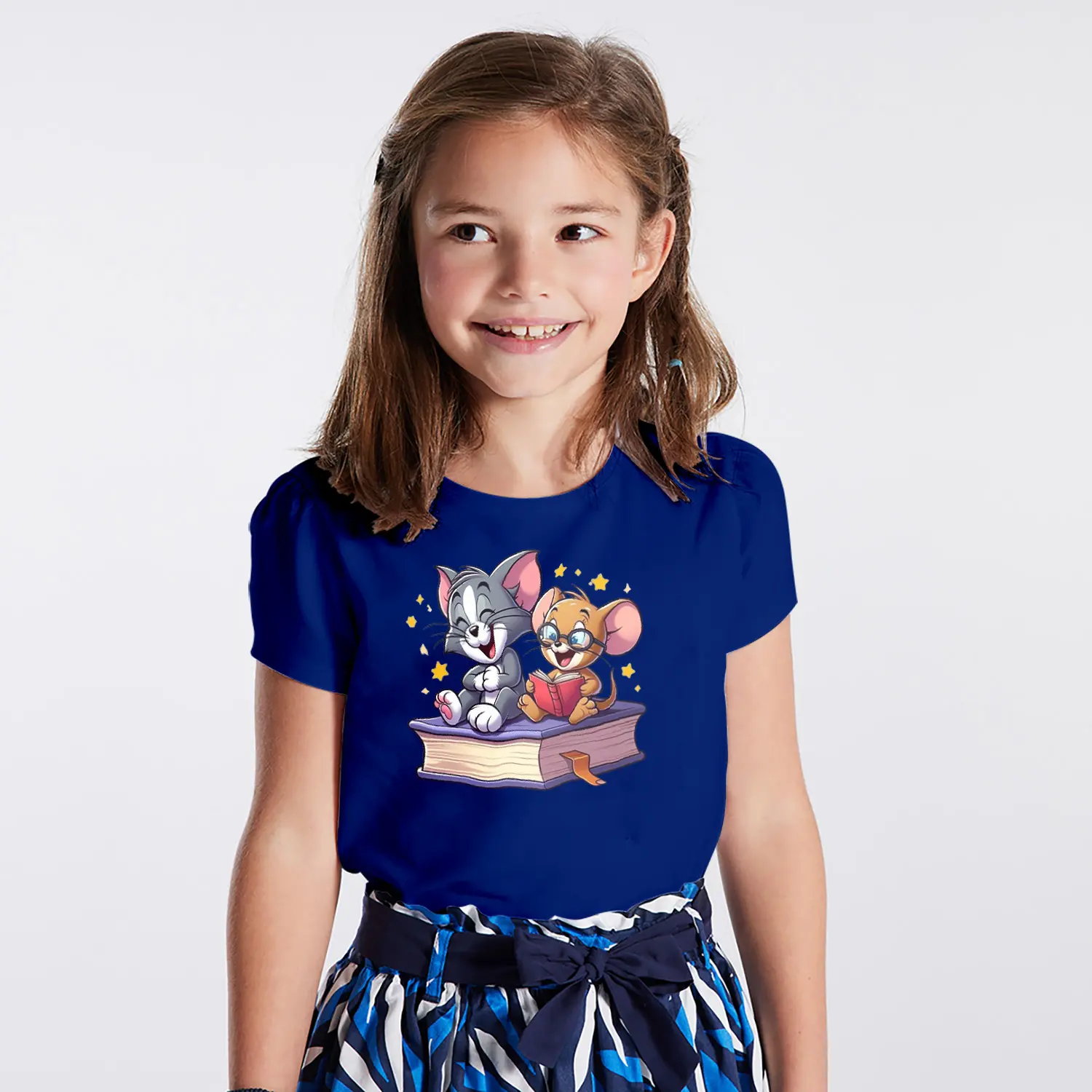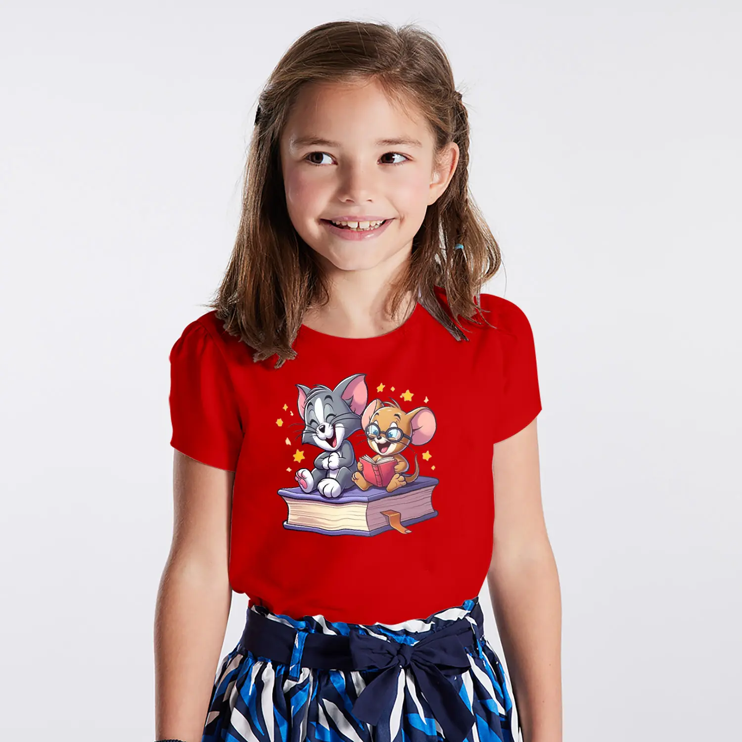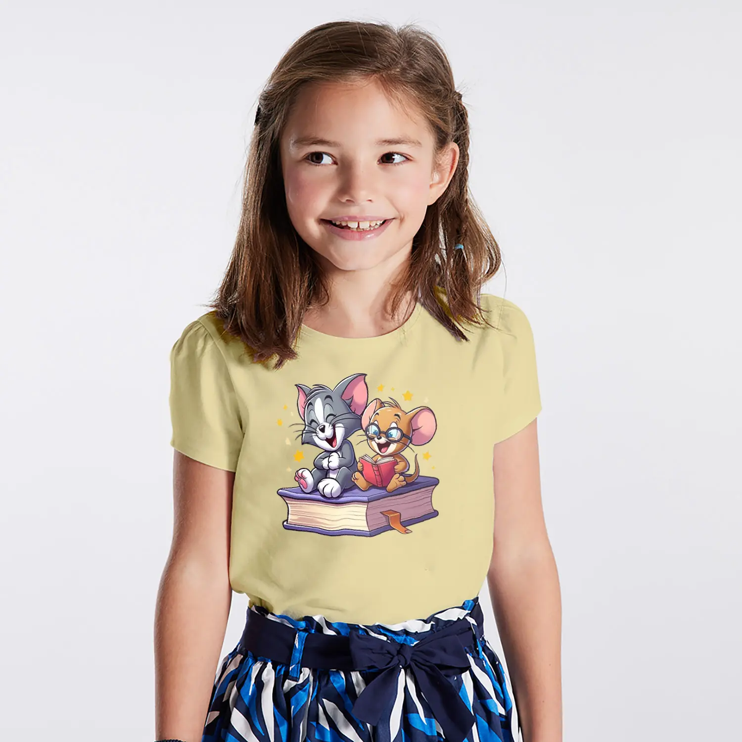 Kitap Okuyan Kedi ve Fare Karikatür Figürlü Baskılı Kız Çocuk Tişörtü