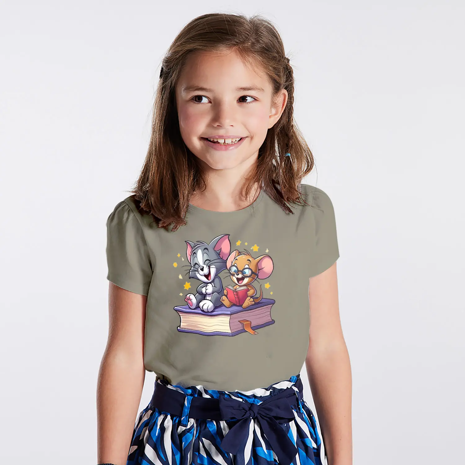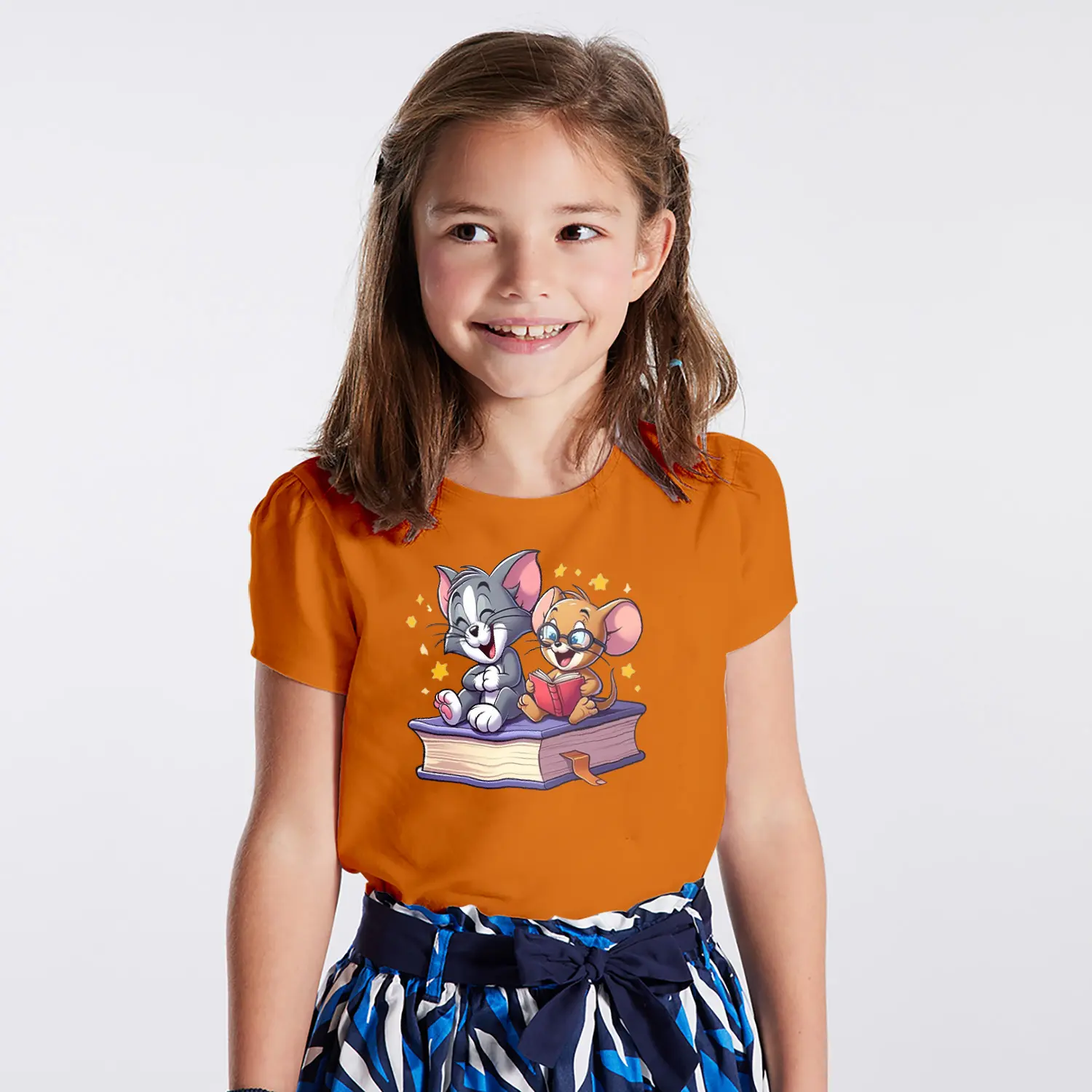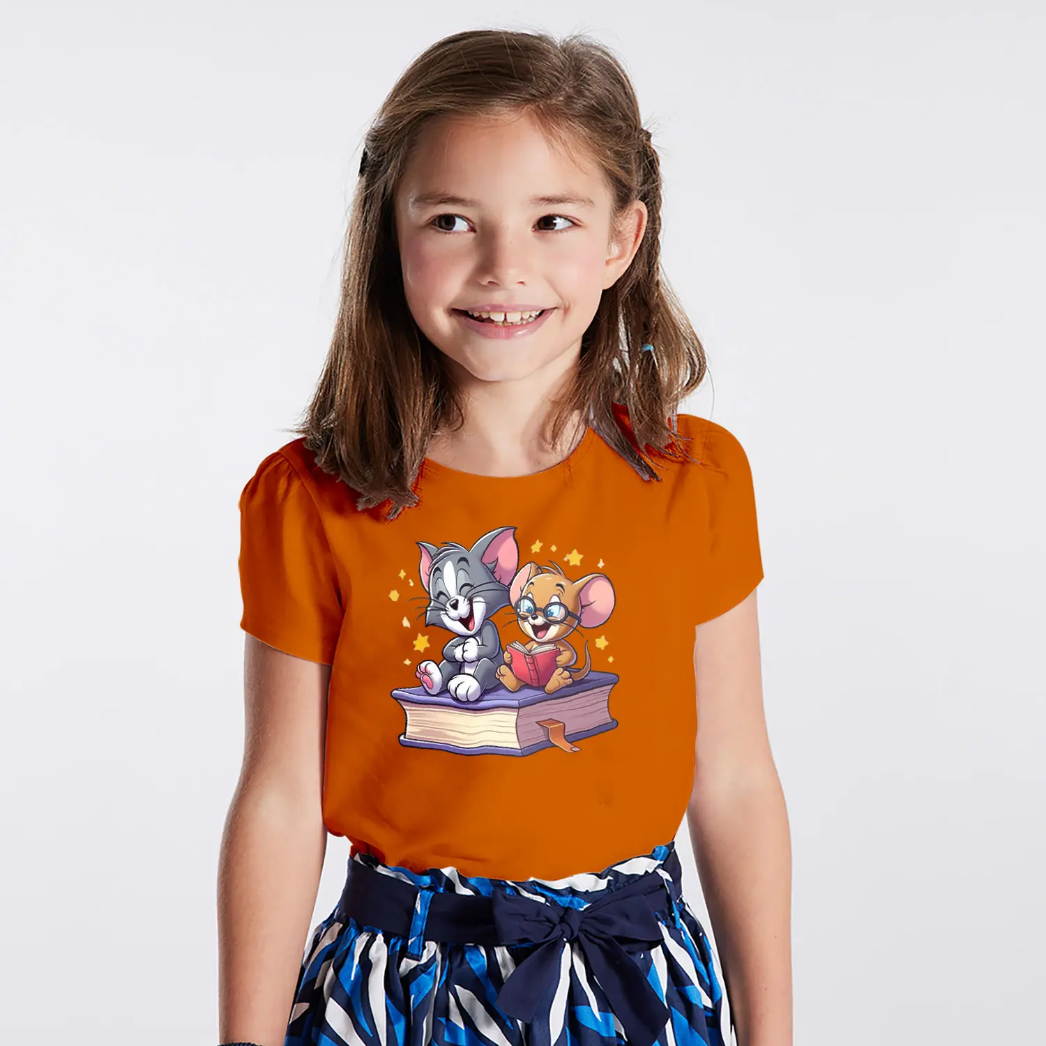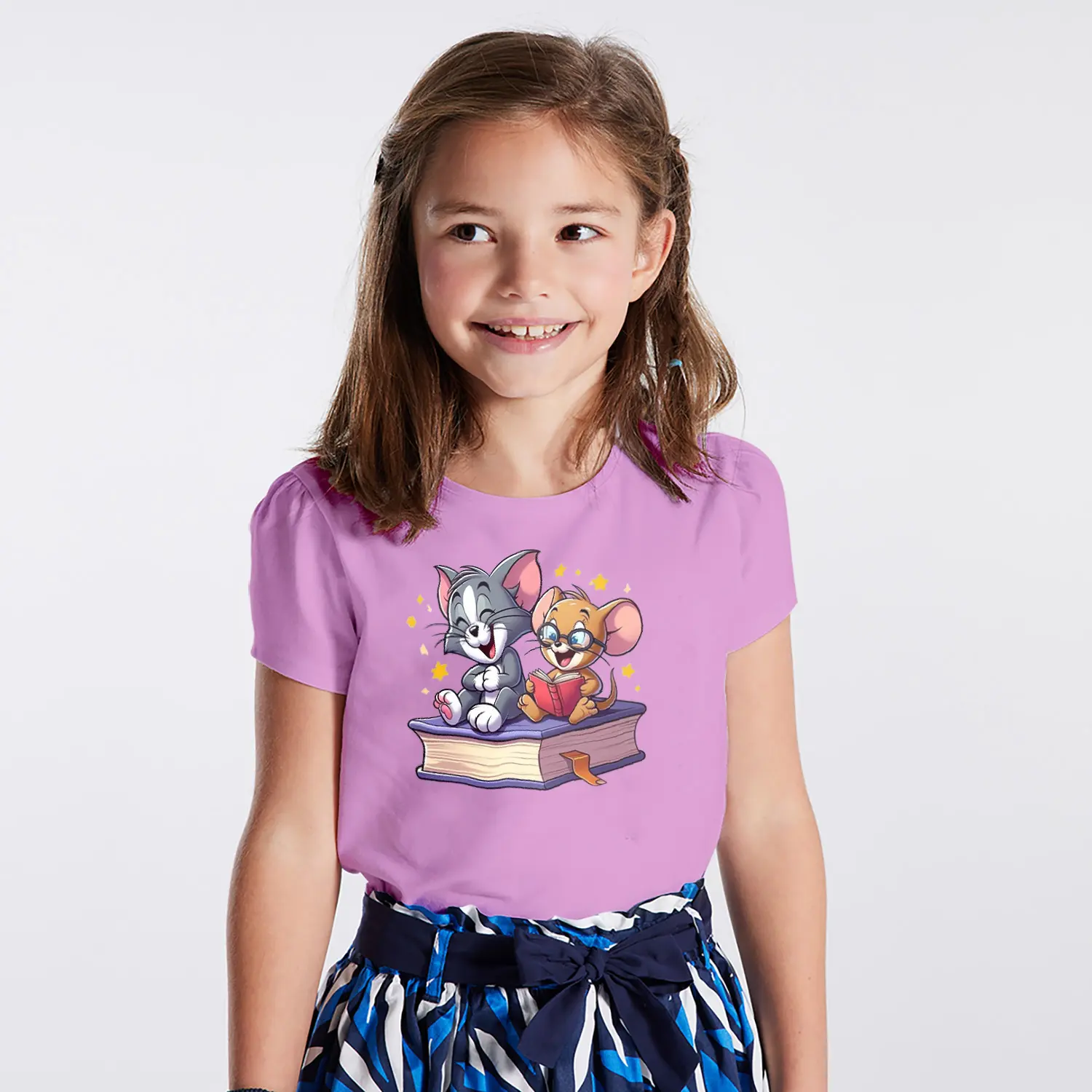 Kitap Okuyan Kedi ve Fare Karikatür Figürlü Baskılı Kız Çocuk Tişörtü