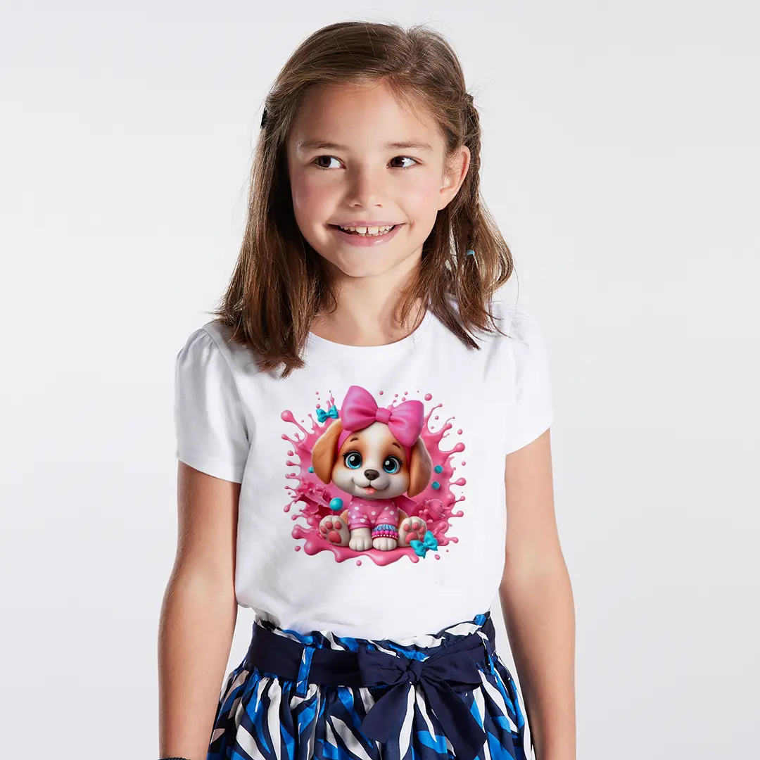 Kız Çocuk Fiyonklu Köpek Baskılı Tişört – Sevimli Köpek Desenli Pamuk Çocuk Tişört