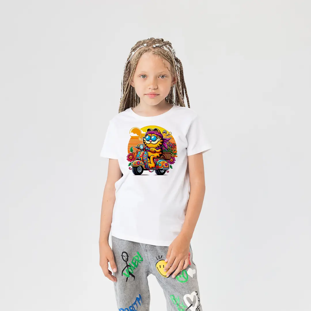 Kız Çocuk Garfield Vespa Scooter Baskılı Tişört – Eğlenceli Çizgi Karakter Çocuk Tişört