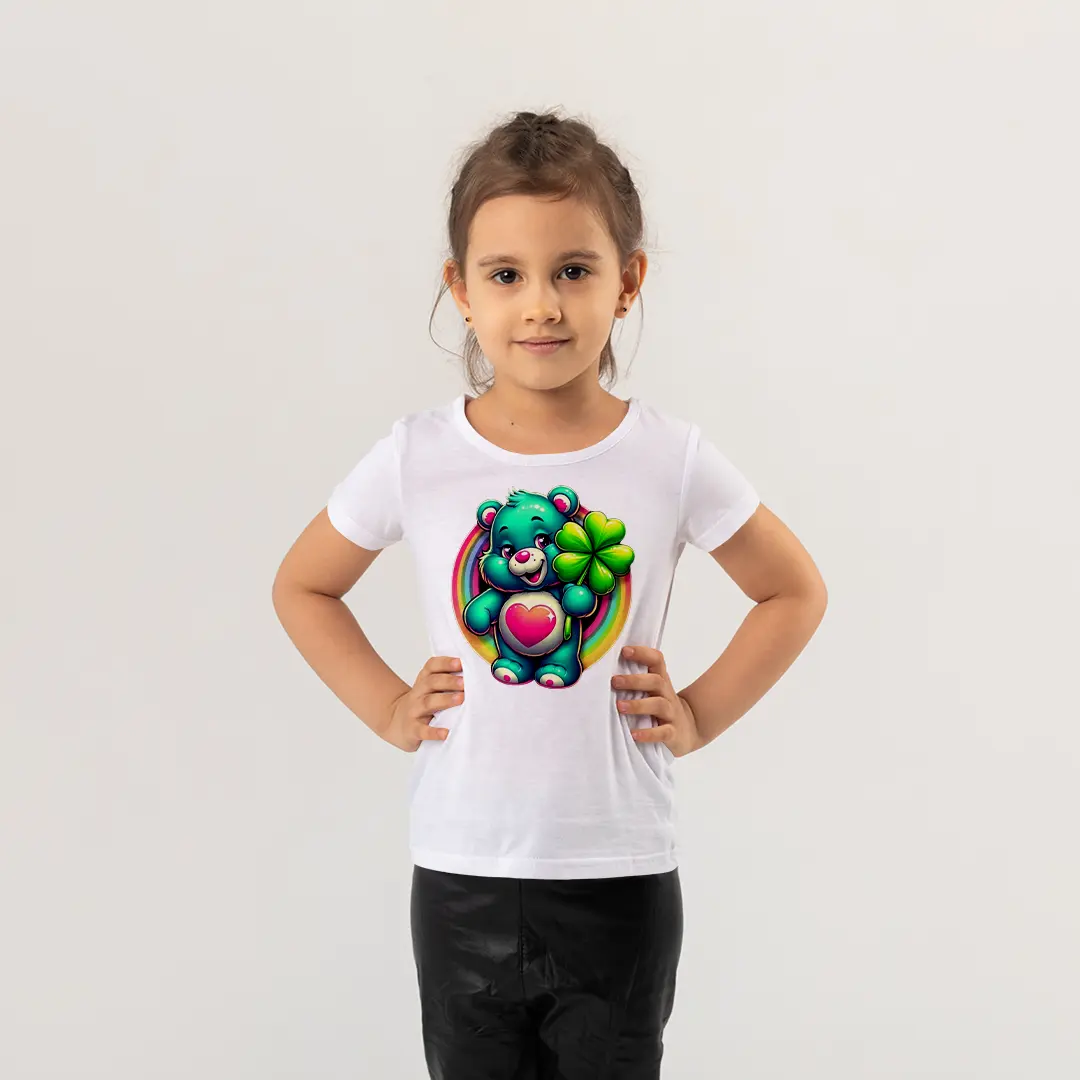 Kız Çocuk Sevimli Ayıcık Gökkuşağı Baskılı Tişört – Renkli Karakter Çocuk Tişört