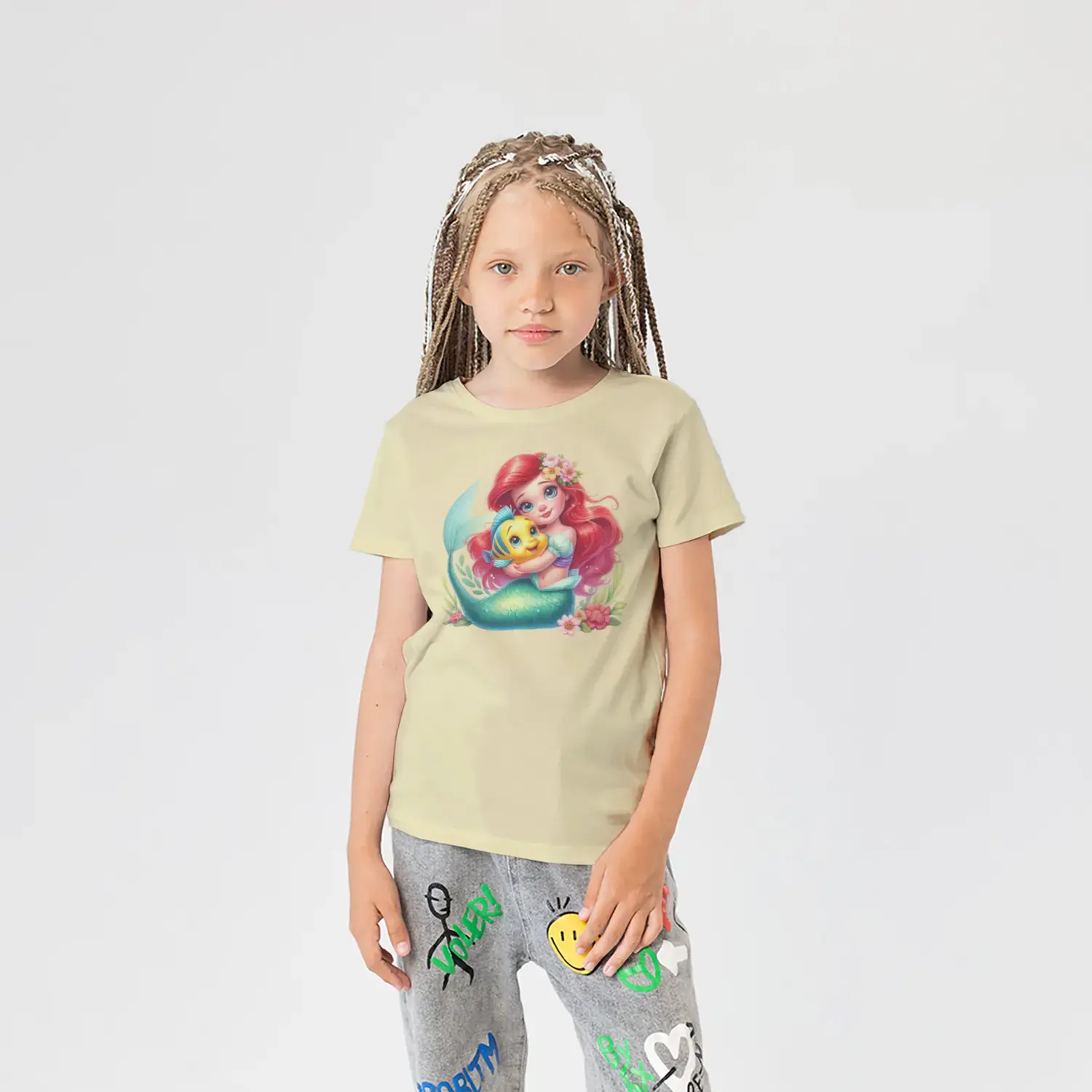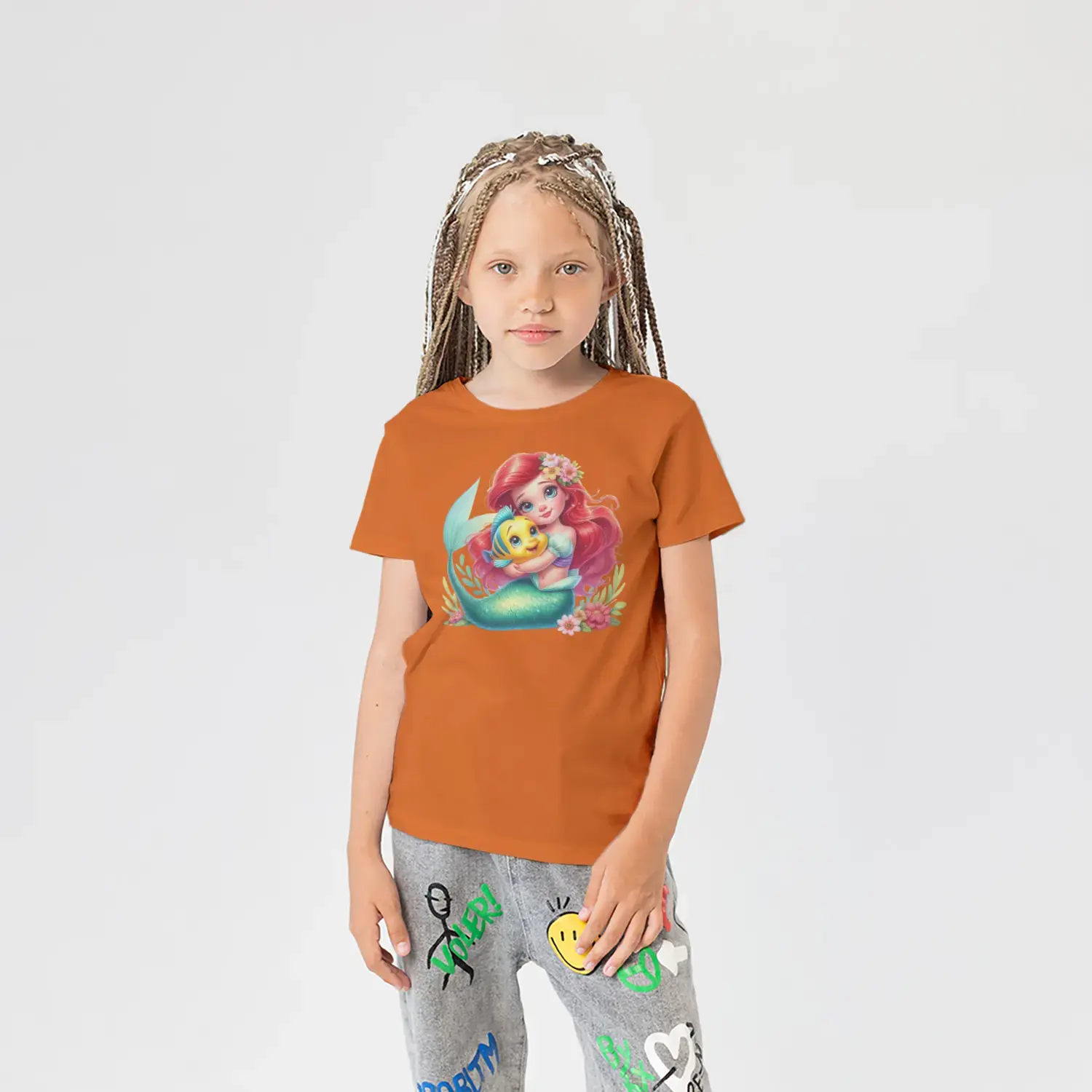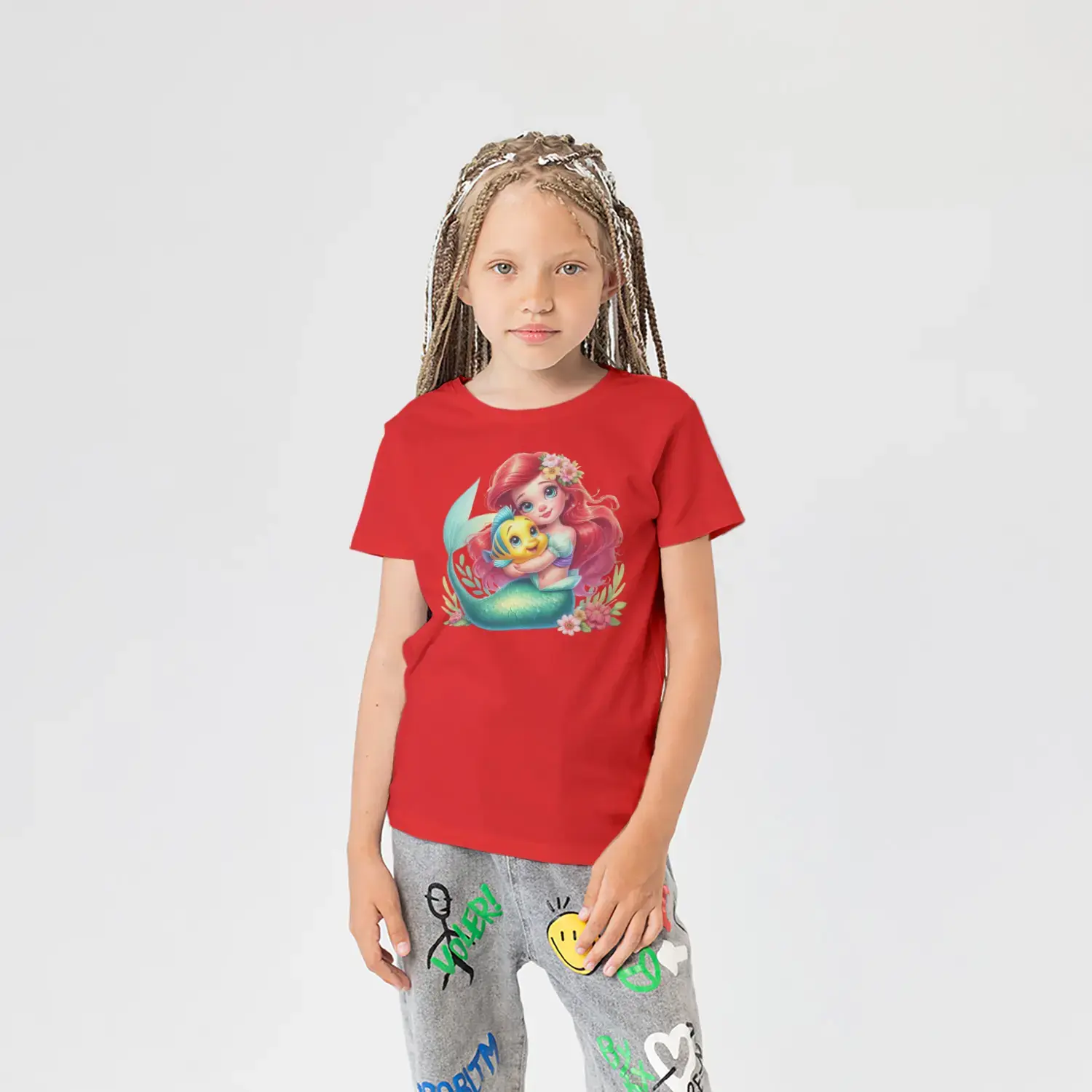 Kızıl Saçlı Deniz Kızı ve Sarı Balık Arkadaşı Baskılı Kız Çocuk Tişörtü