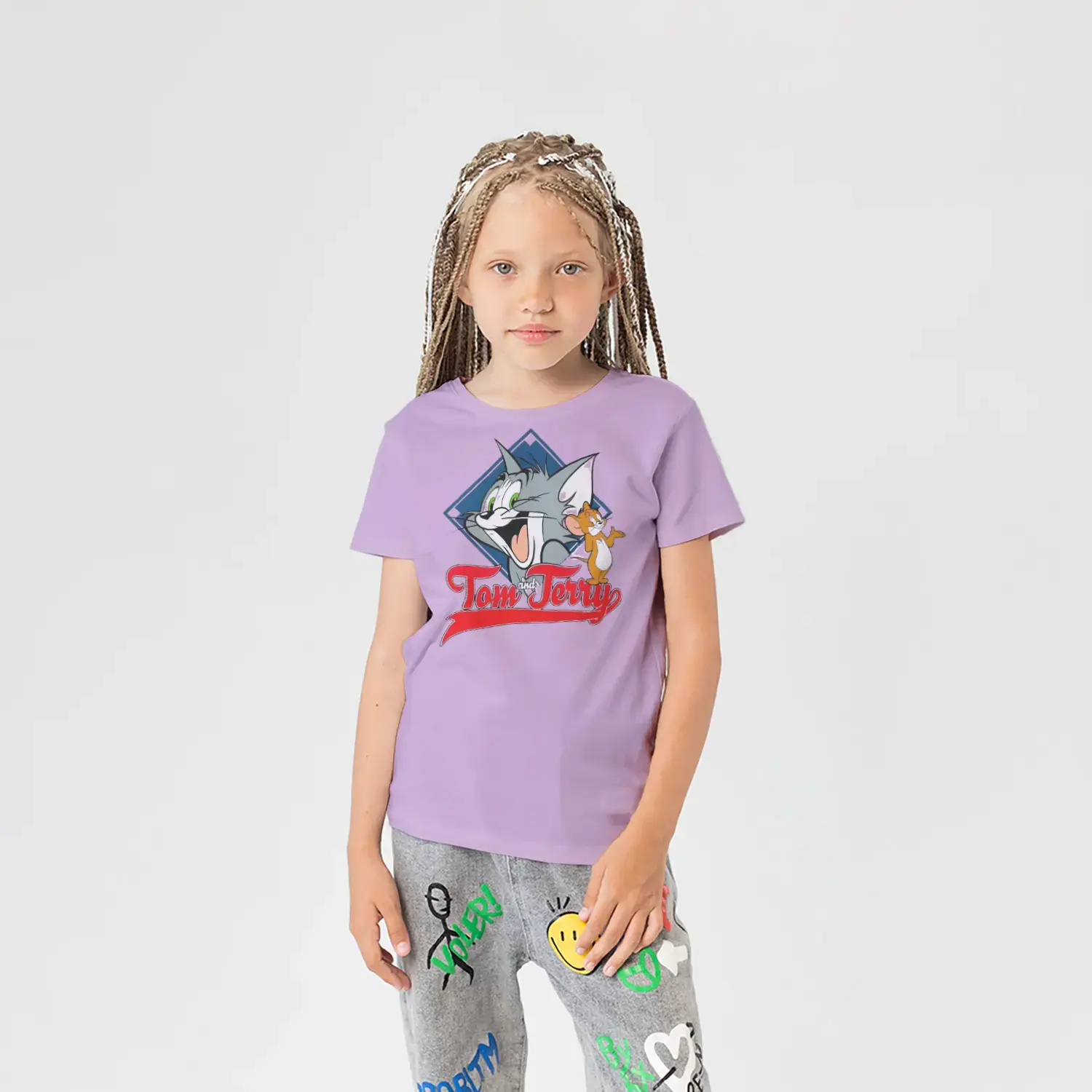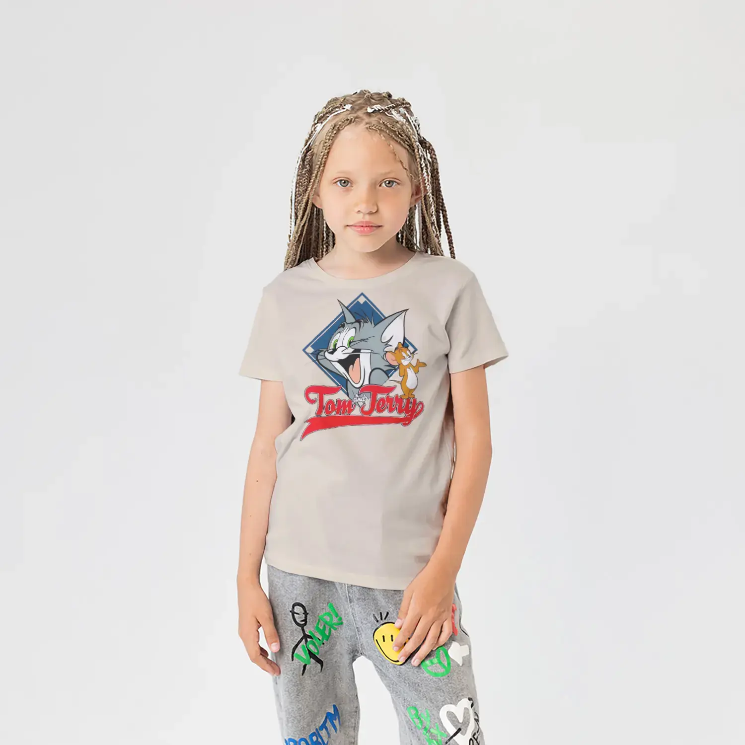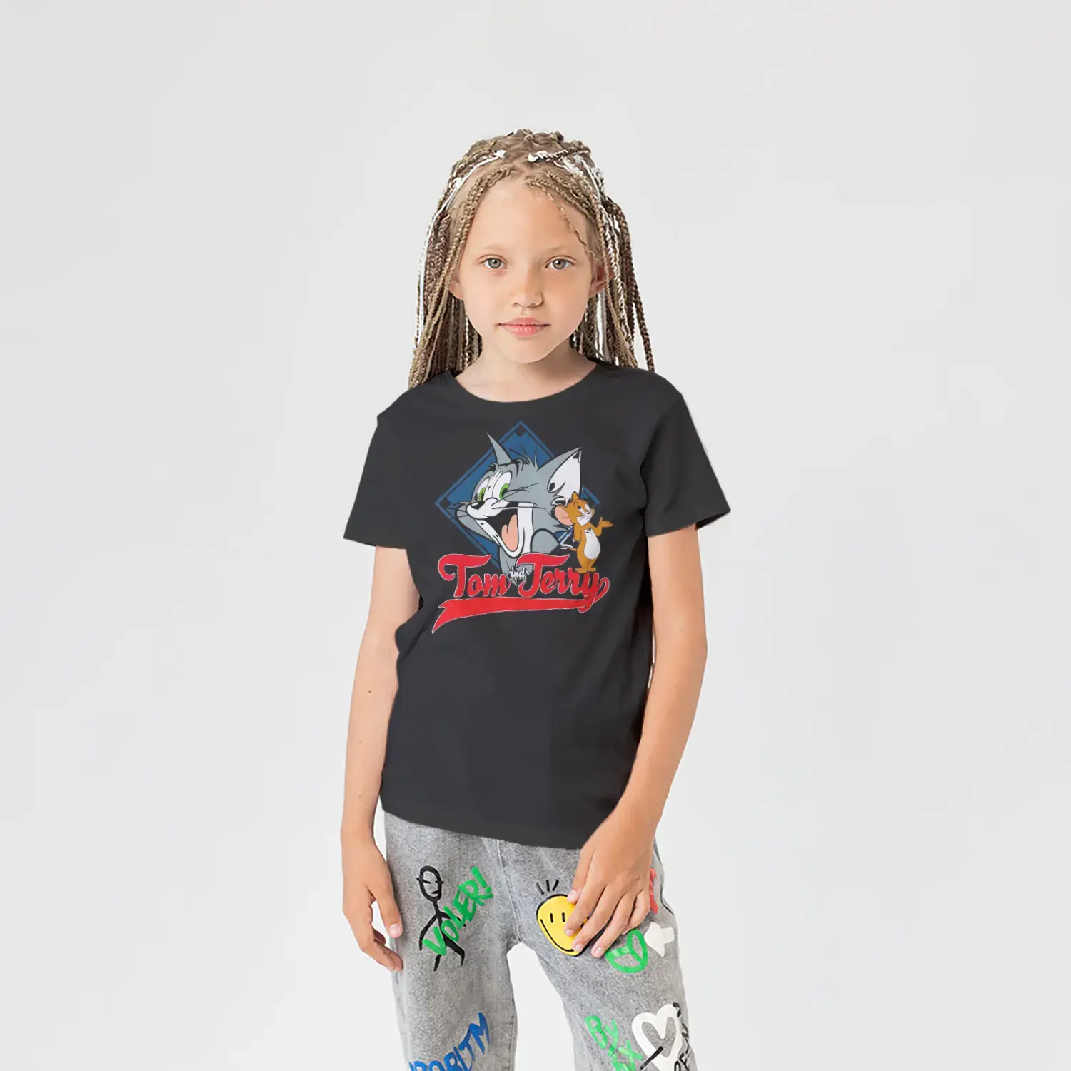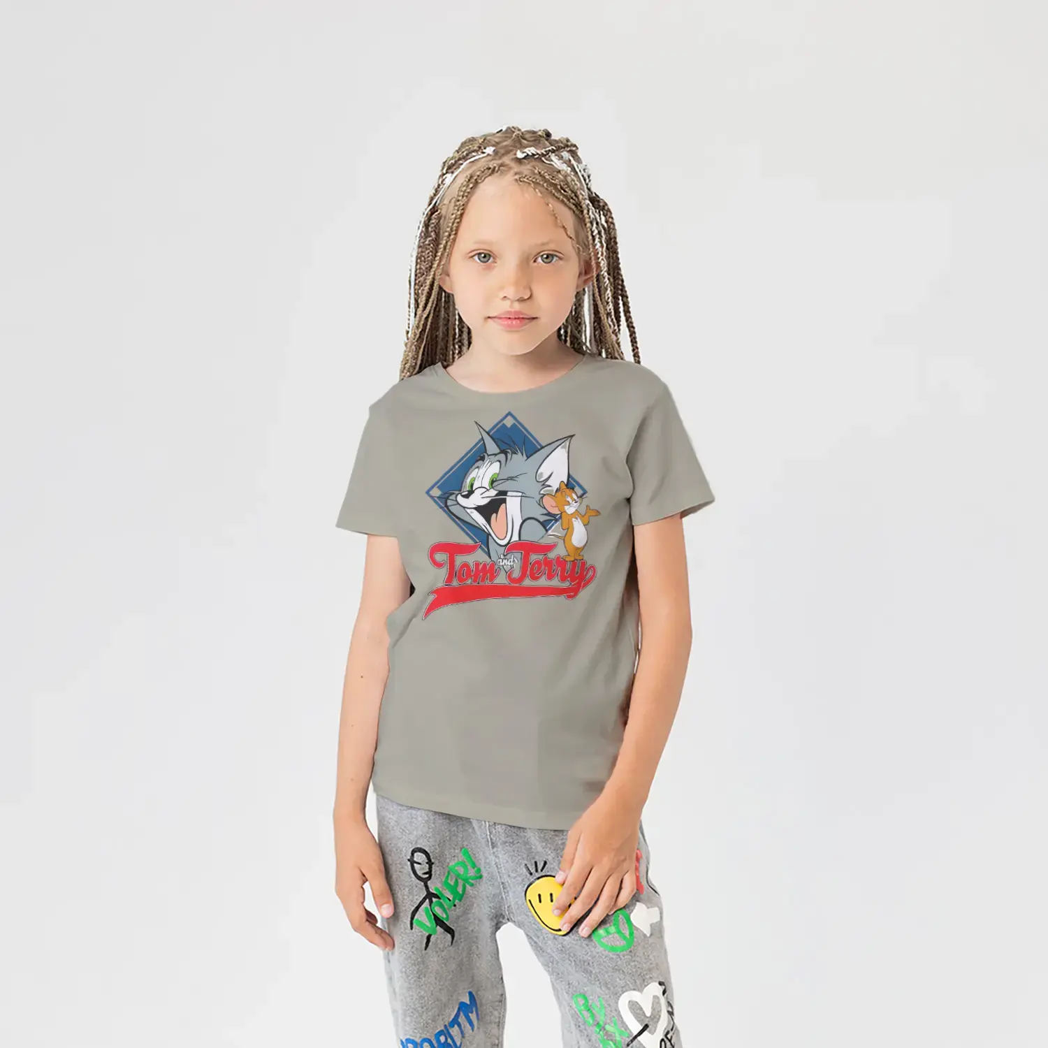 Komik Kedi ve Fare İkili Karikatür Baskılı Kız Çocuk Tişörtü