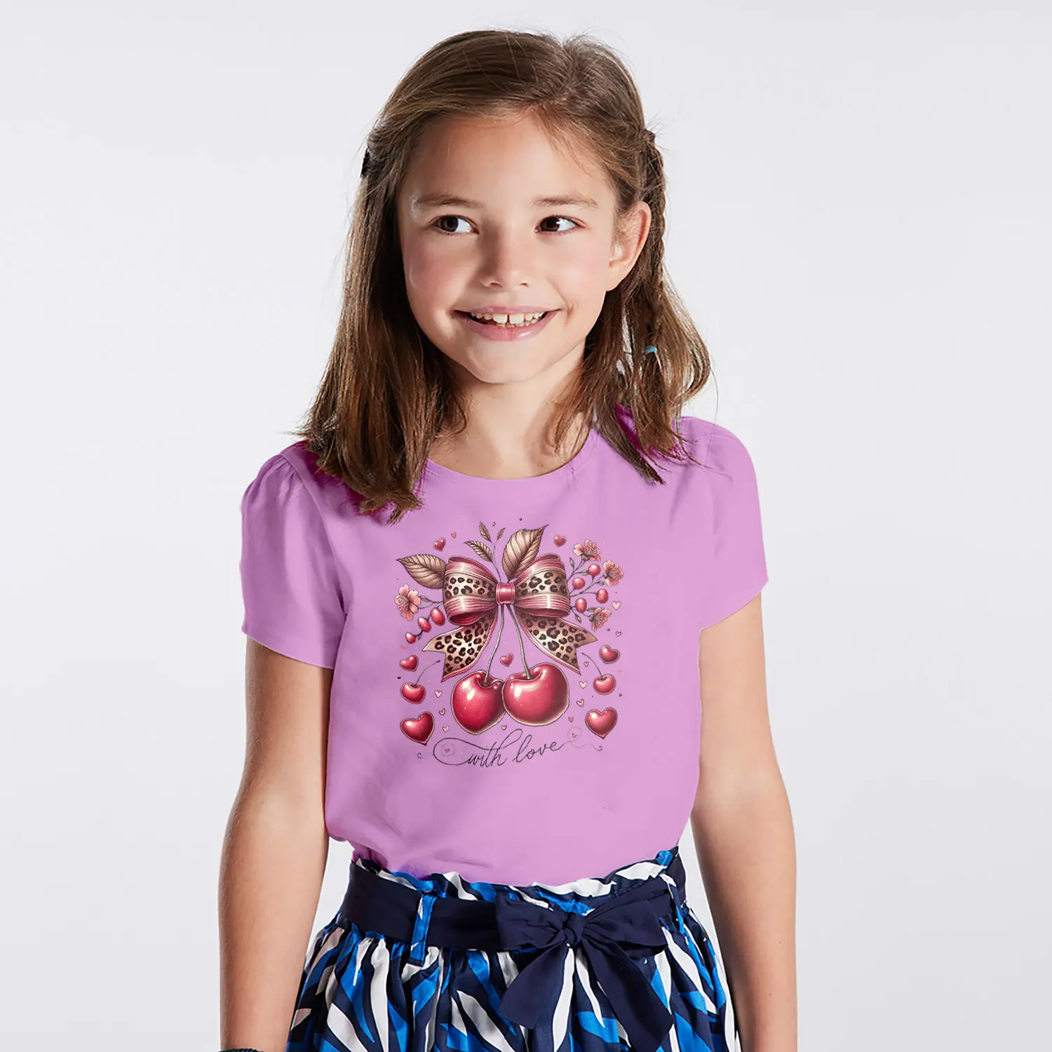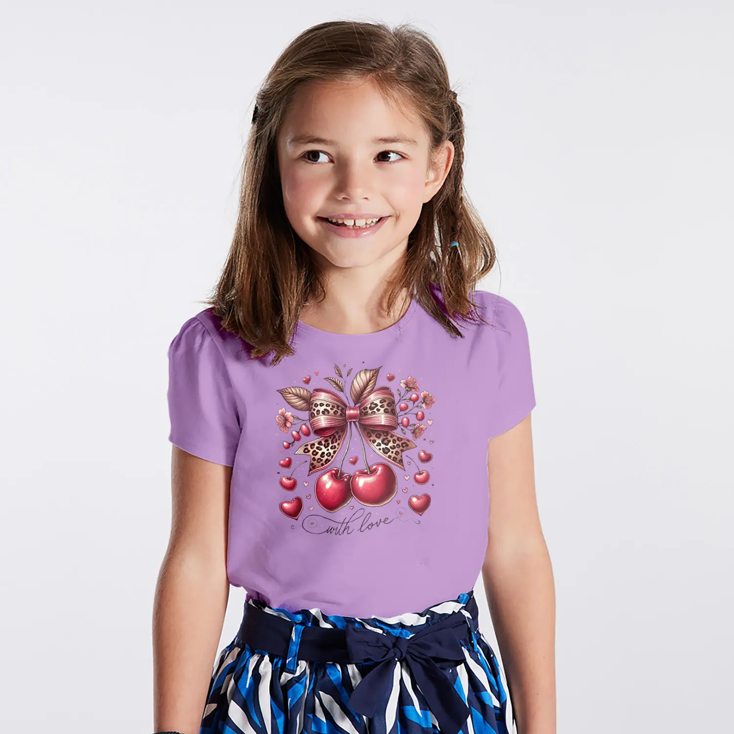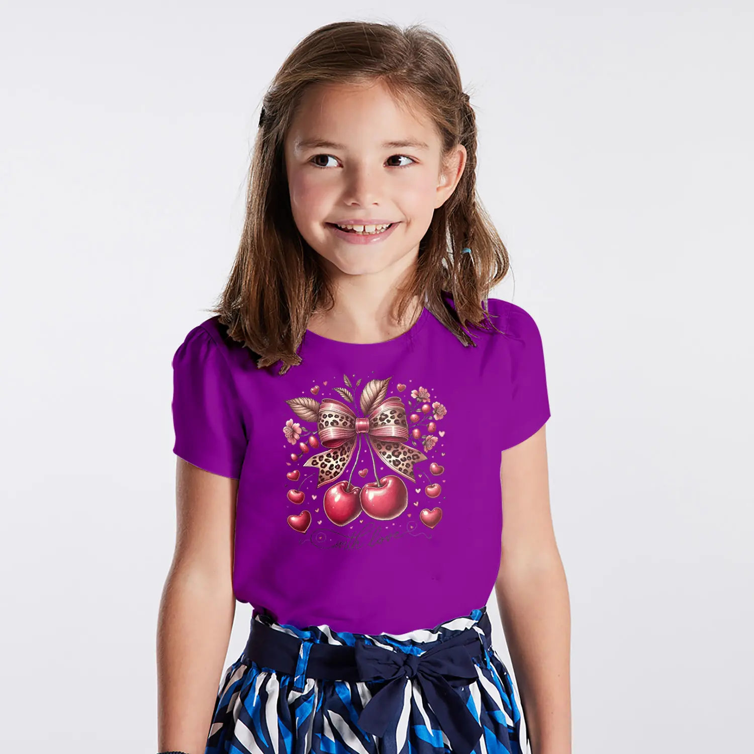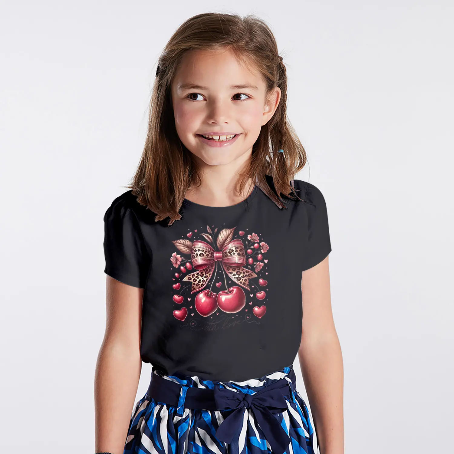 Leopar Desenli Fiyonk ve Kalpli Kiraz With Love Yazılı Baskılı Kız Çocuk Tişörtü