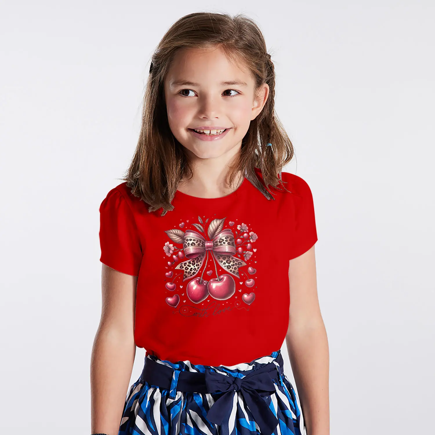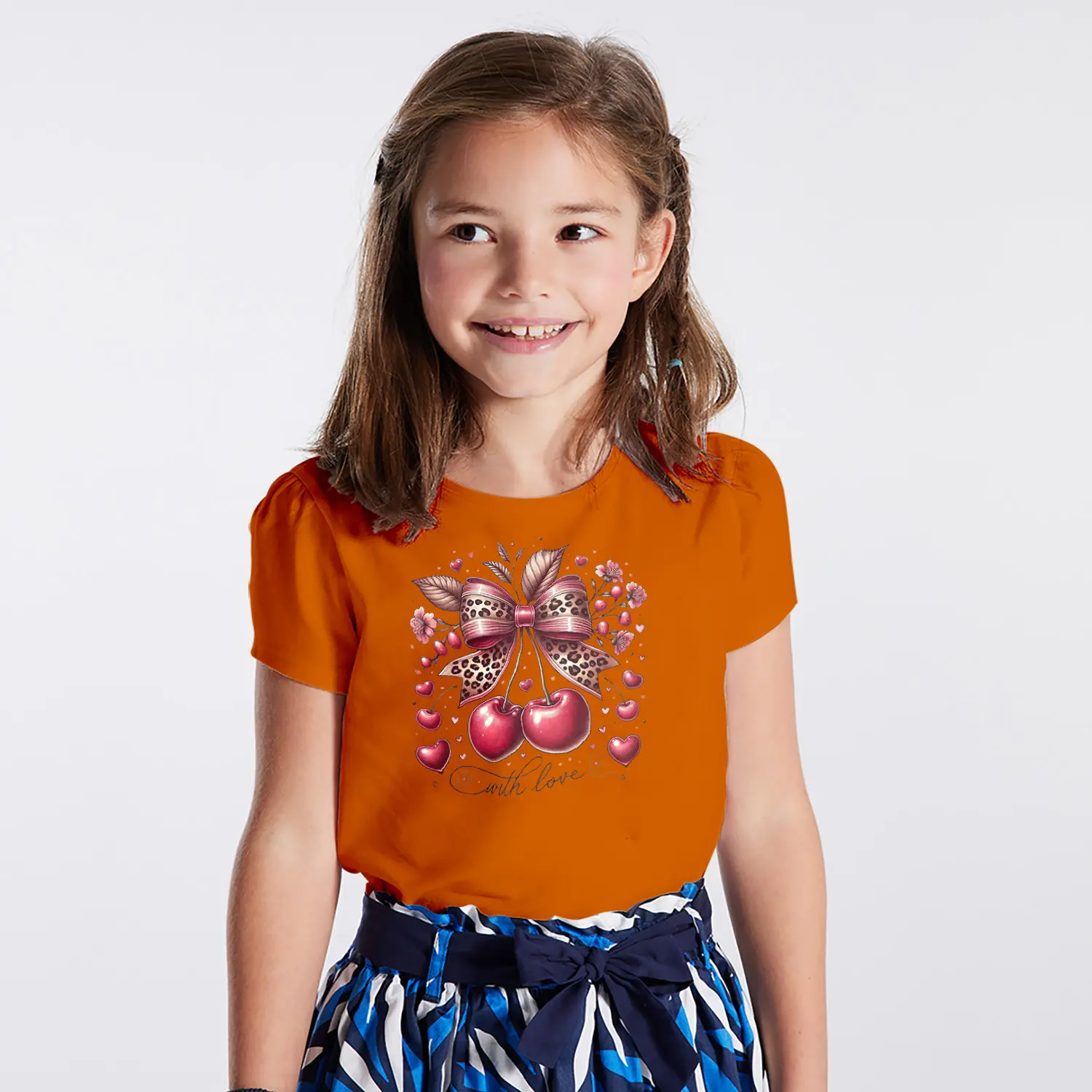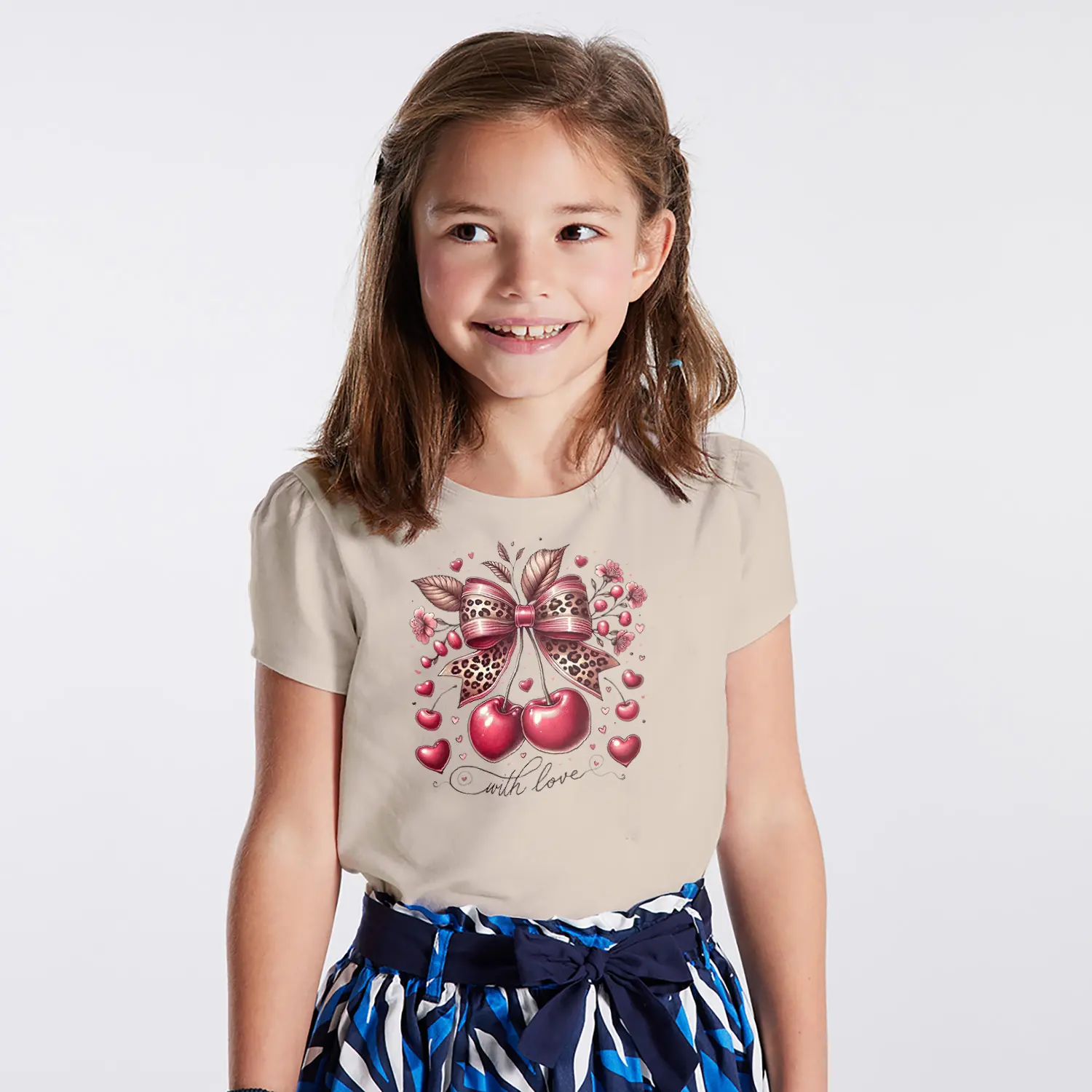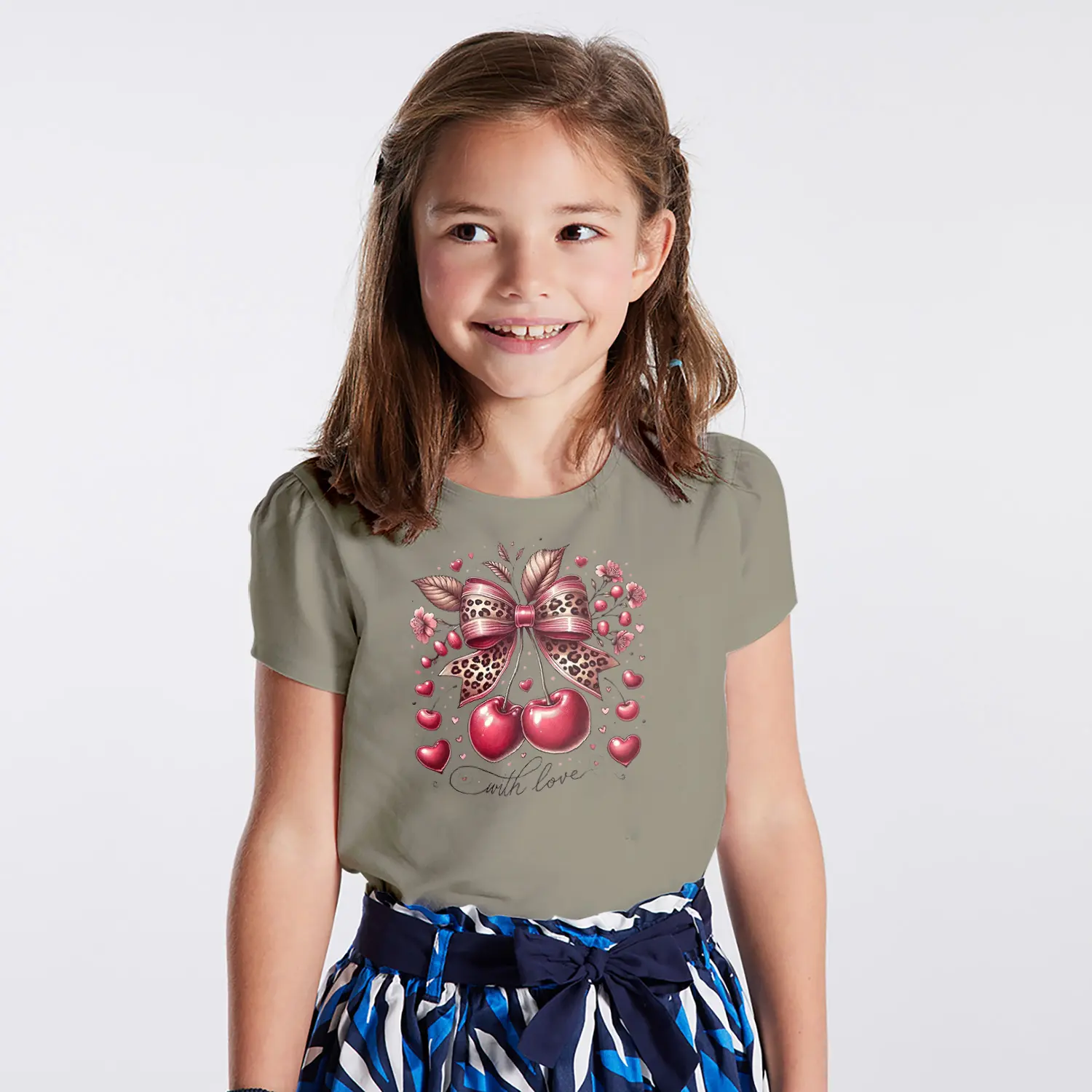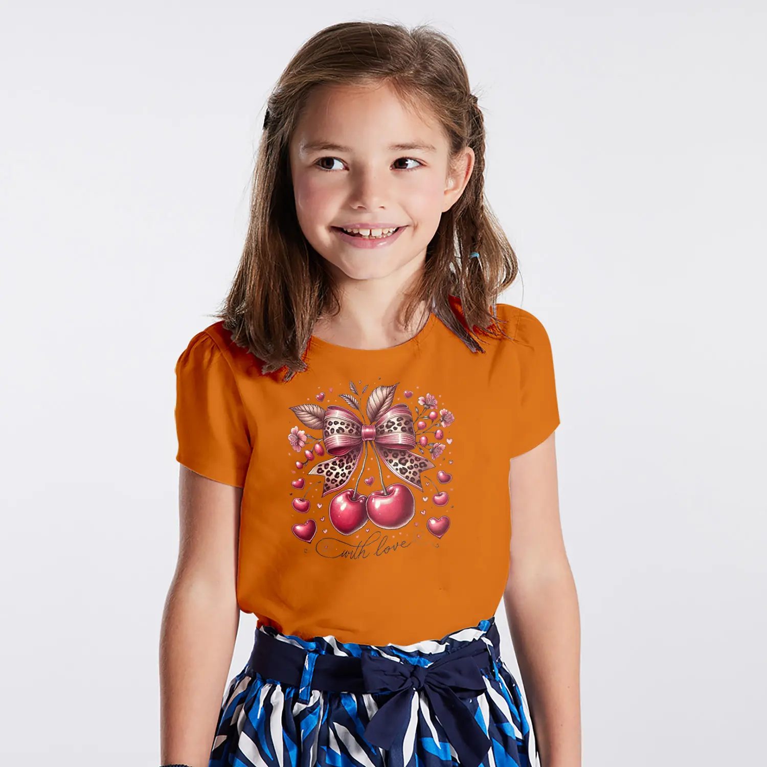 Leopar Desenli Fiyonk ve Kalpli Kiraz With Love Yazılı Baskılı Kız Çocuk Tişörtü