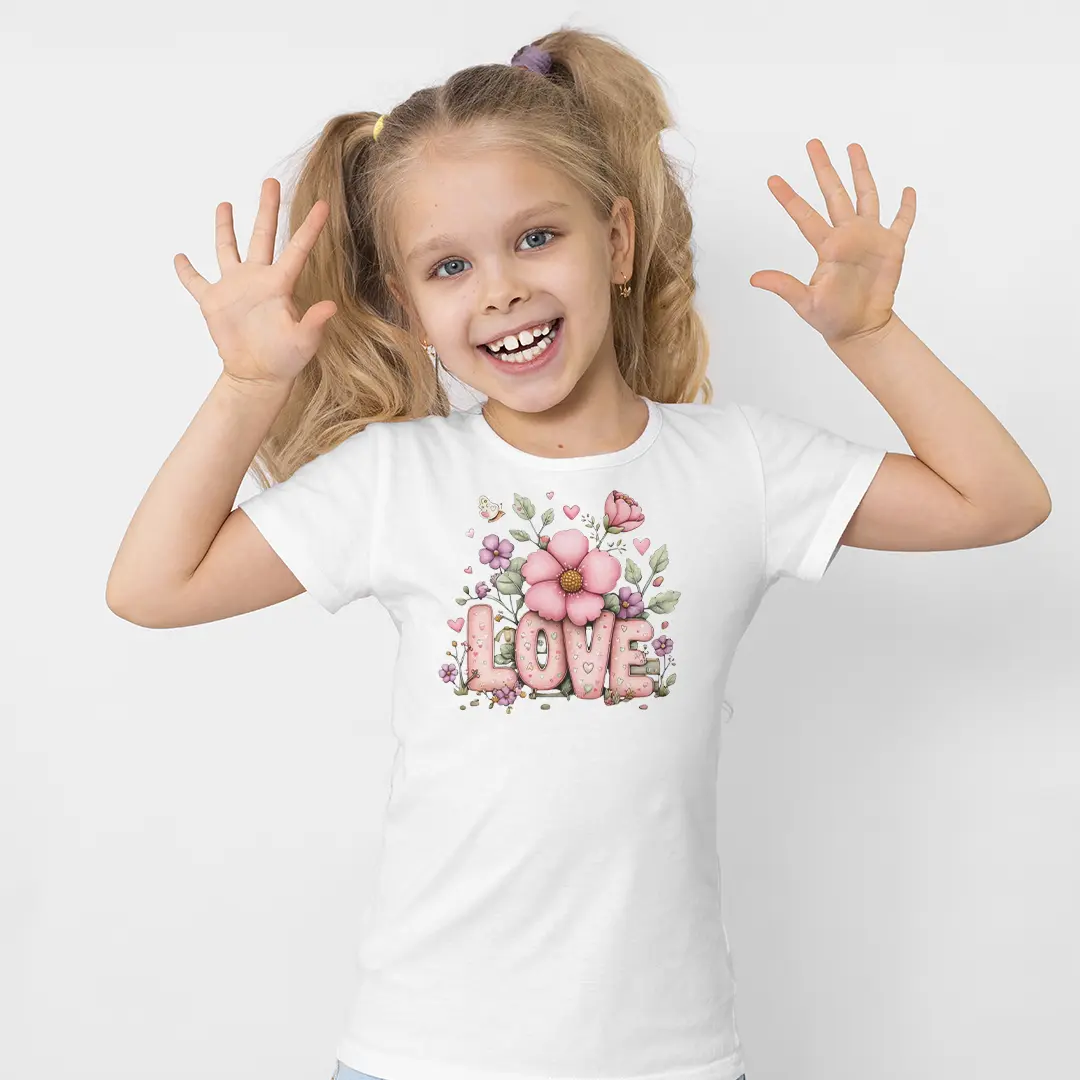 Love Çiçek Kız Çocuk Tişört – Pembe Çiçekli Suluboya Love Yazılı Baskılı Beyaz T-Shirt
