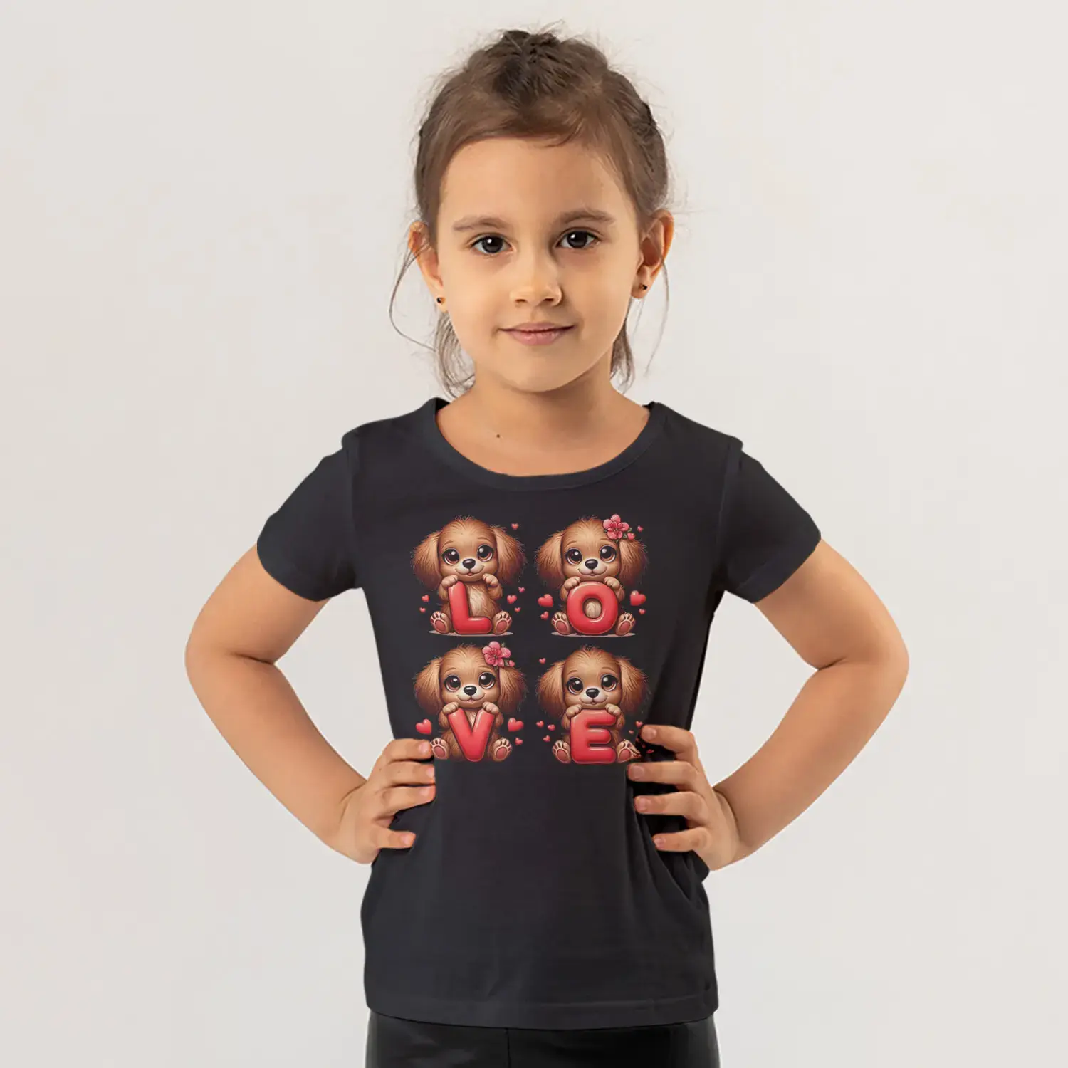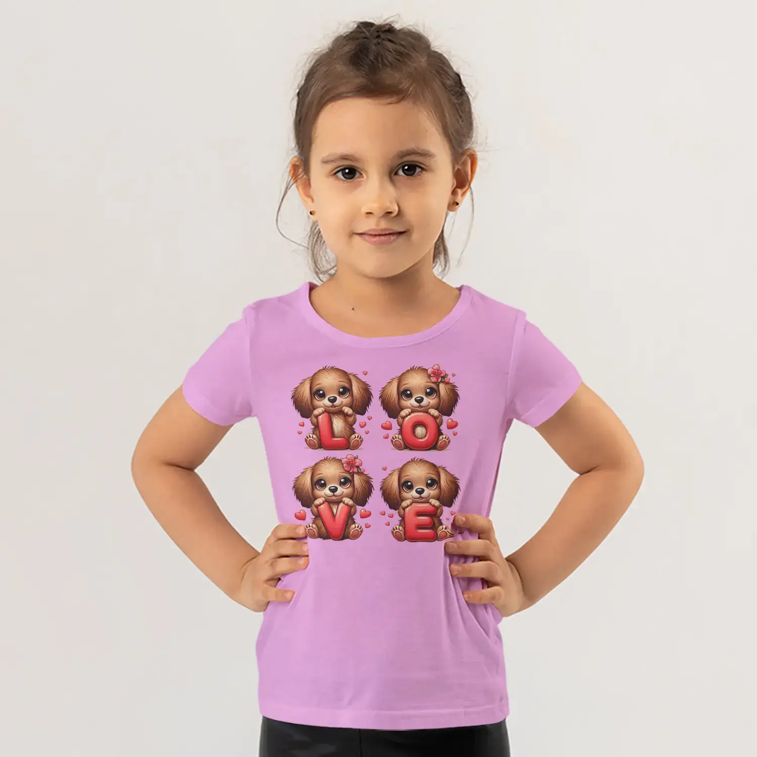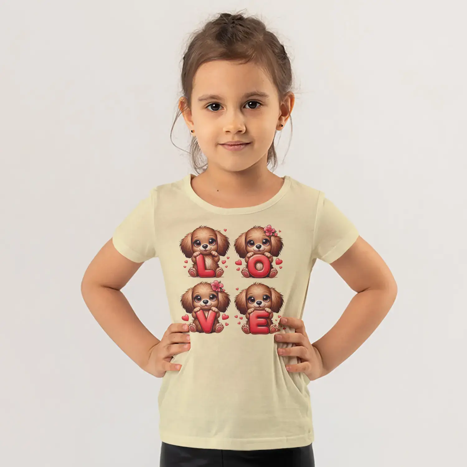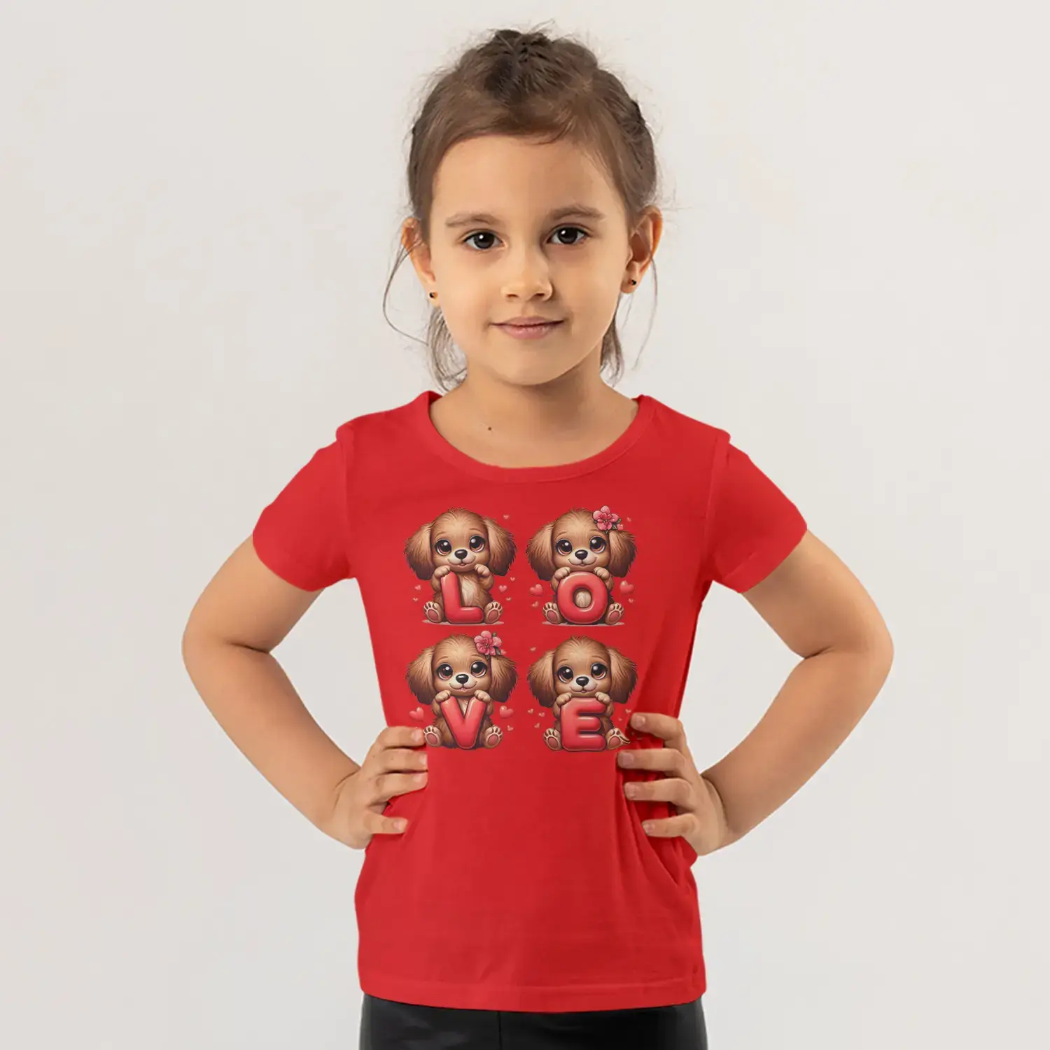 Love Harfli Dört Sevimli Köpek Yavrusu Kalp Baskılı Kız Çocuk Tişörtü