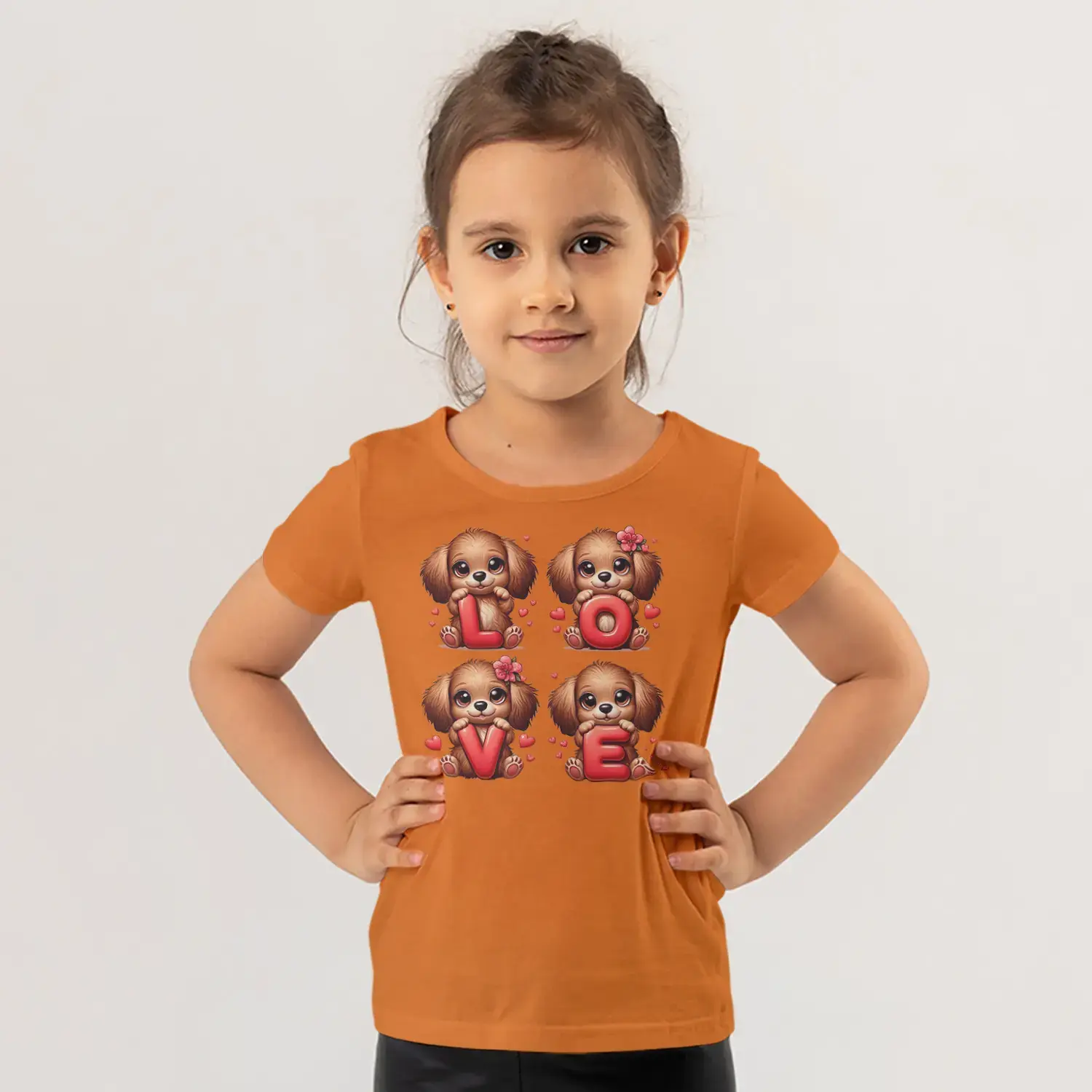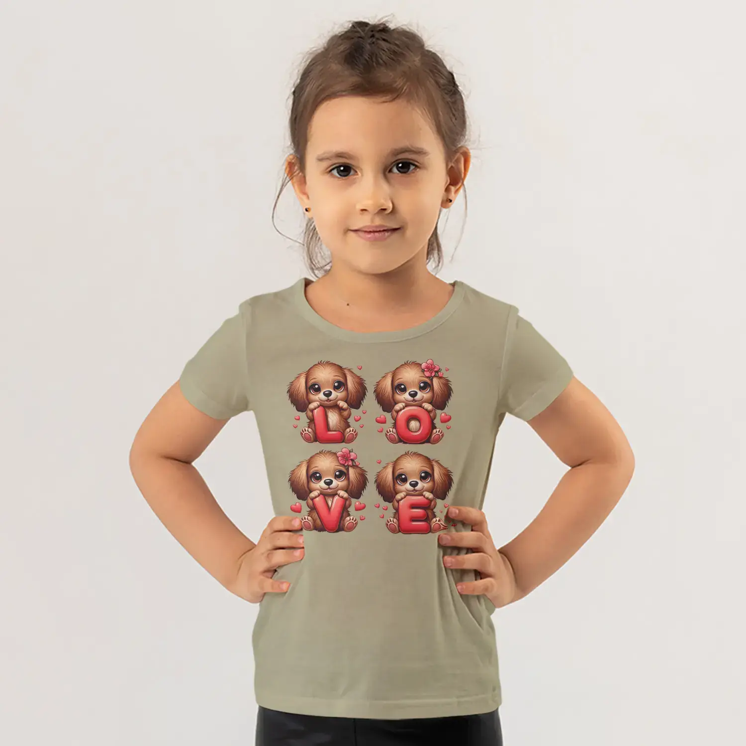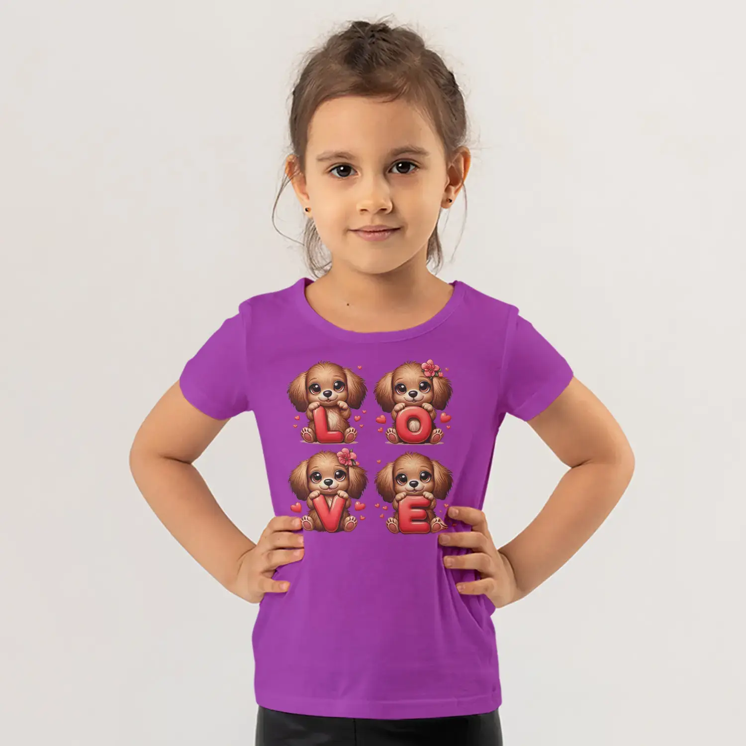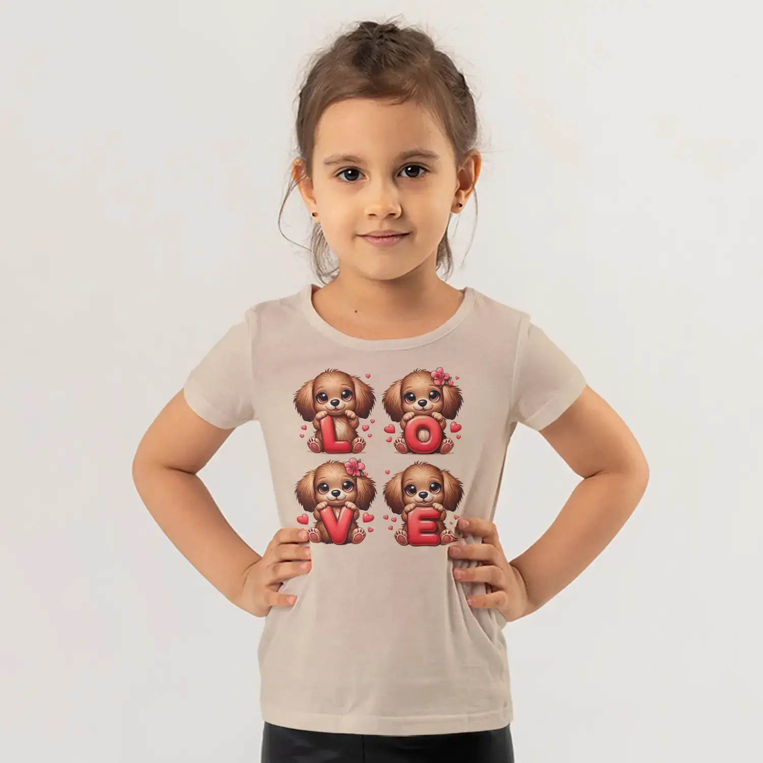 Love Harfli Dört Sevimli Köpek Yavrusu Kalp Baskılı Kız Çocuk Tişörtü