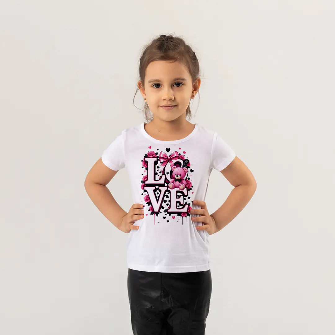 Love Pembe Ayıcık Baskılı Kız Çocuk Tişörtü – Gül ve Kalp Desenli Çocuk T-Shirt