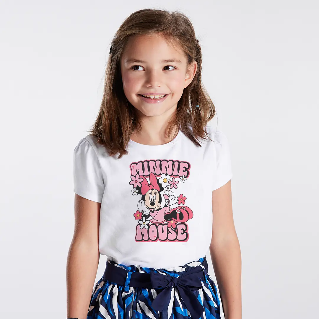 Minnie Mouse Çiçekli Kız Çocuk Tişört – Retro Minnie Mouse Baskılı Beyaz T-Shirt