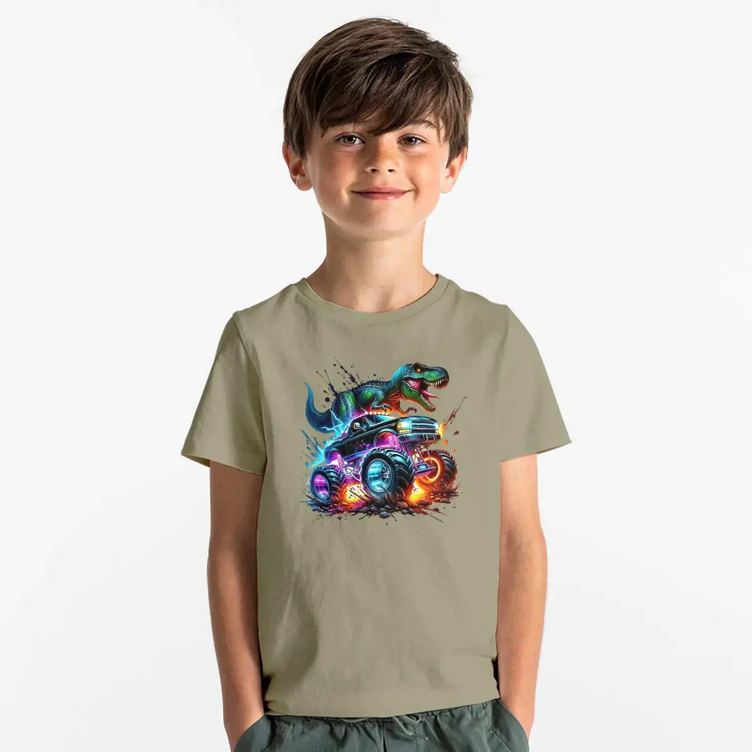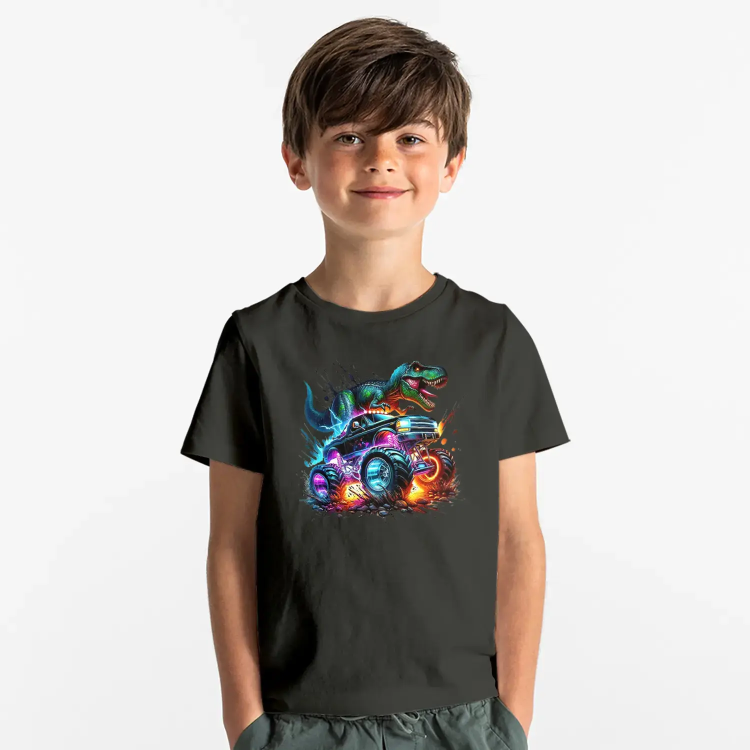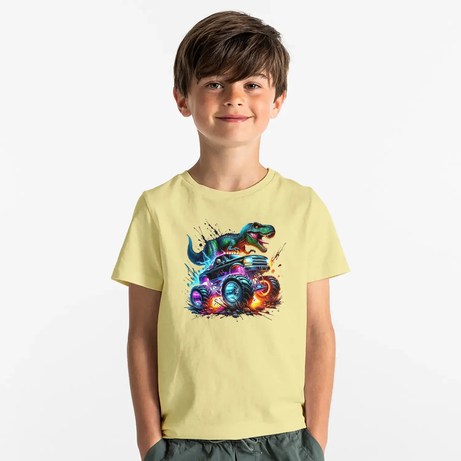 Neon Dinozor Arabalı Baskılı Erkek Çocuk Tişört