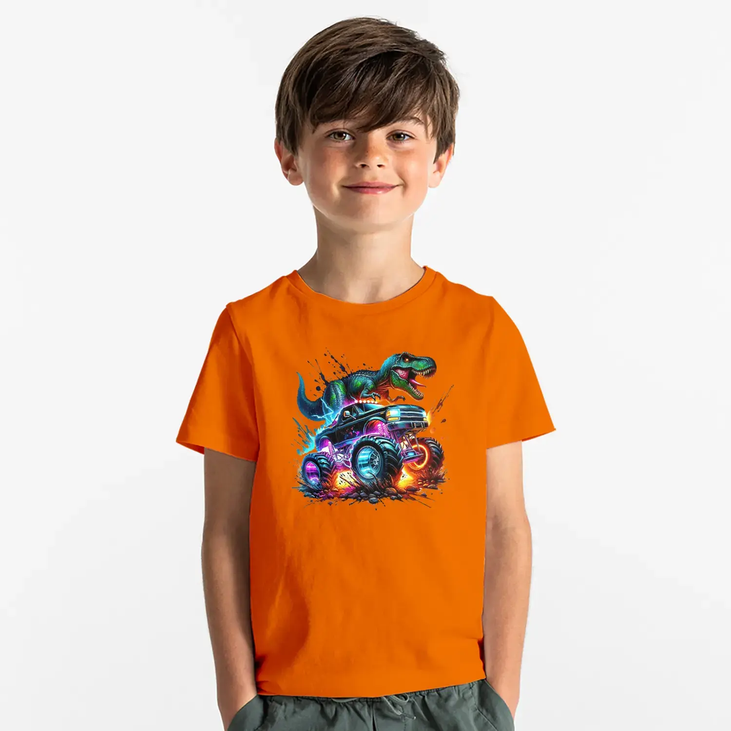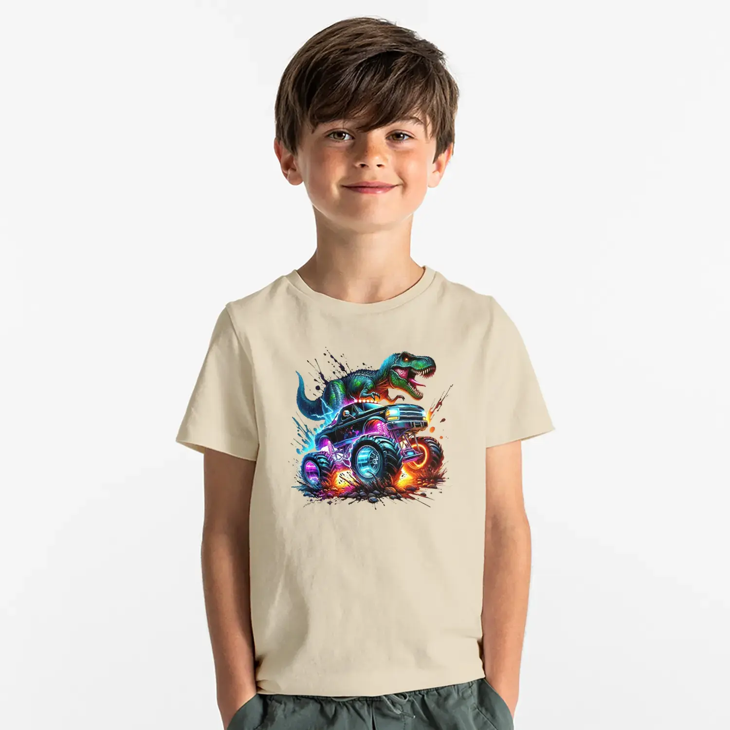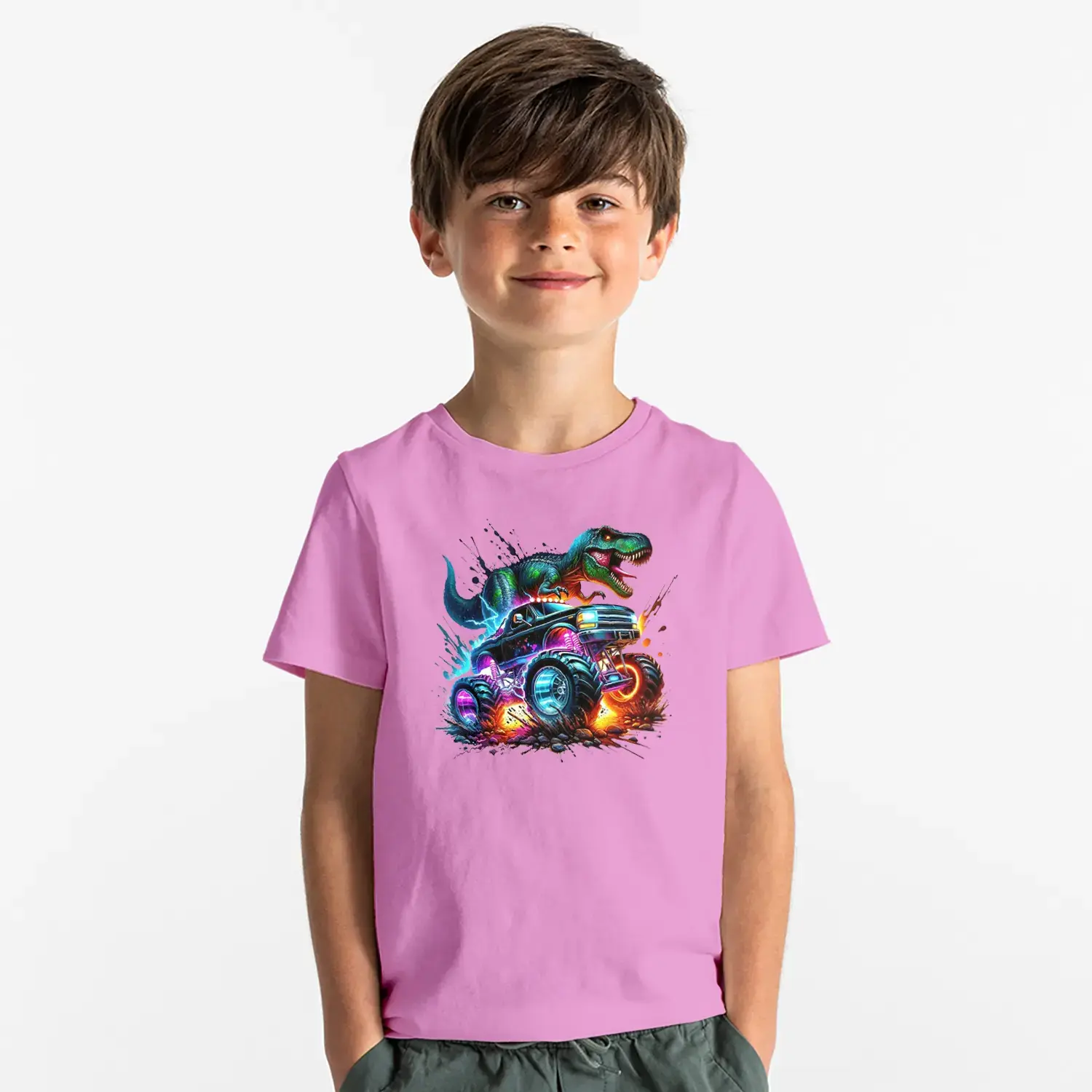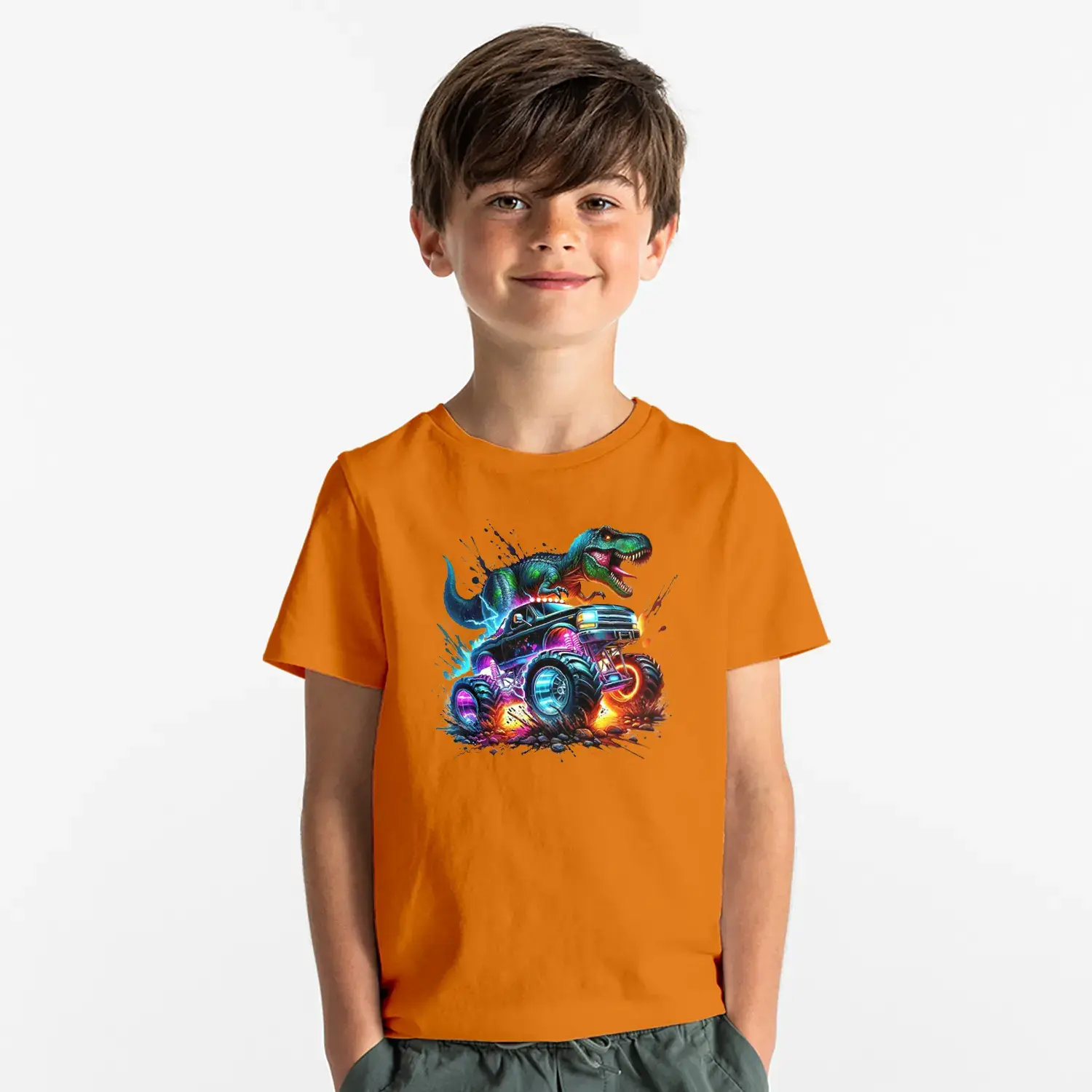 Neon Dinozor Arabalı Baskılı Erkek Çocuk Tişört