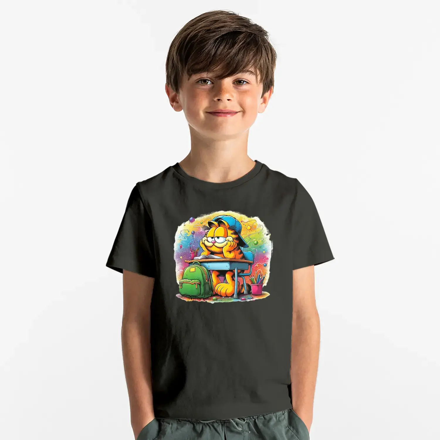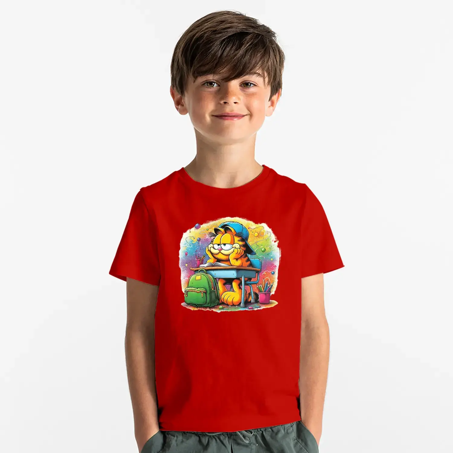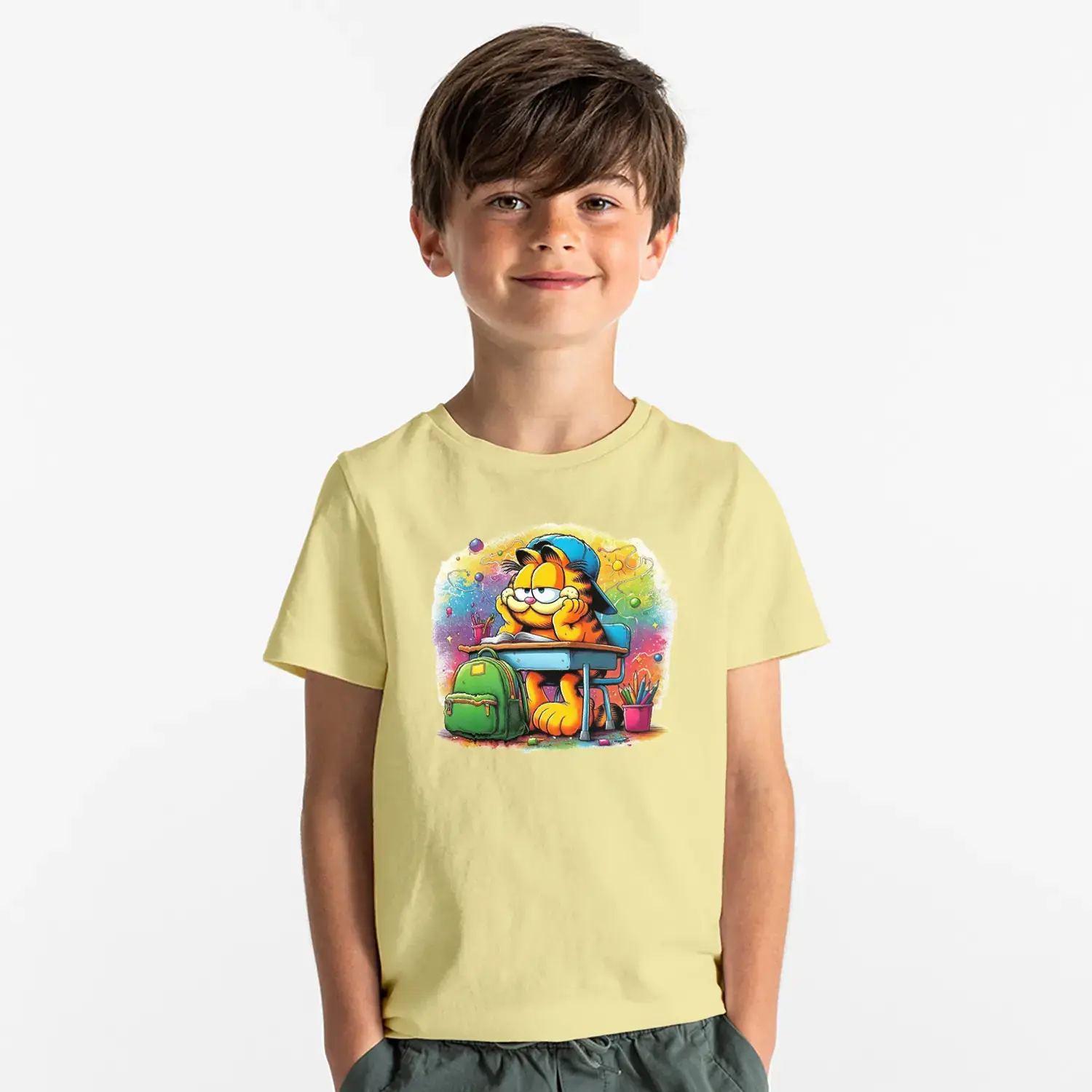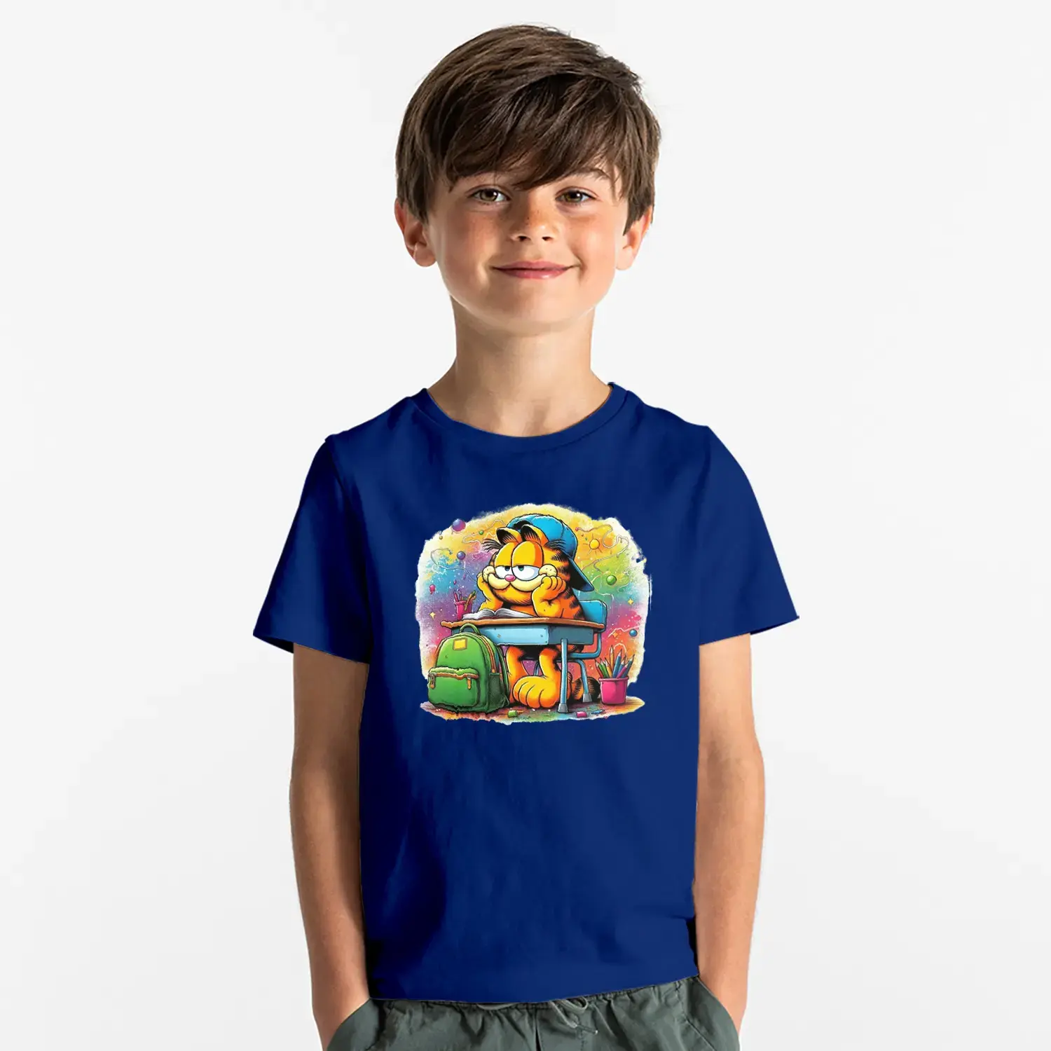Okul Temalı Sevimli Kedi Çizgi Karakter Baskılı Erkek Çocuk Tişört