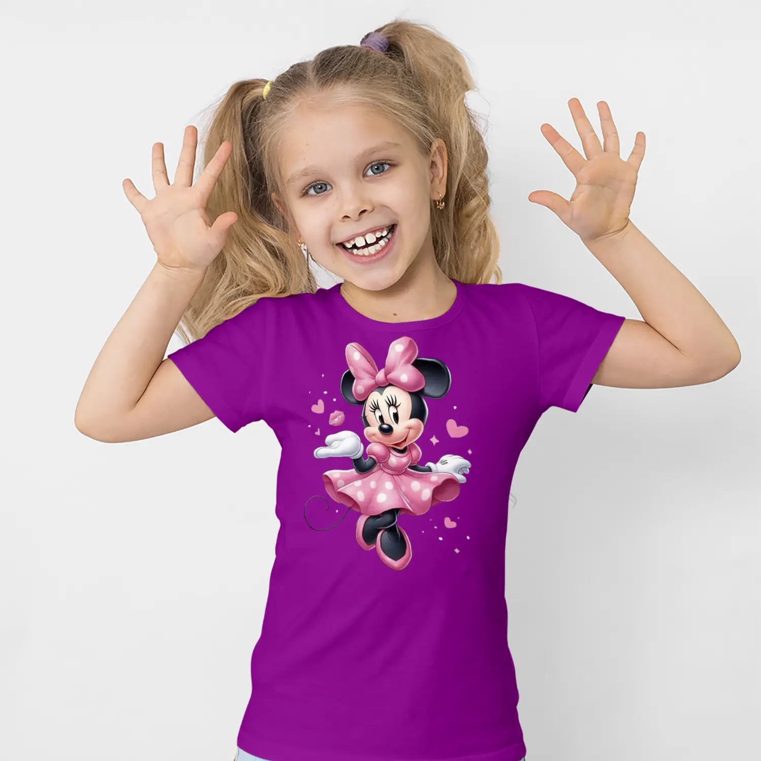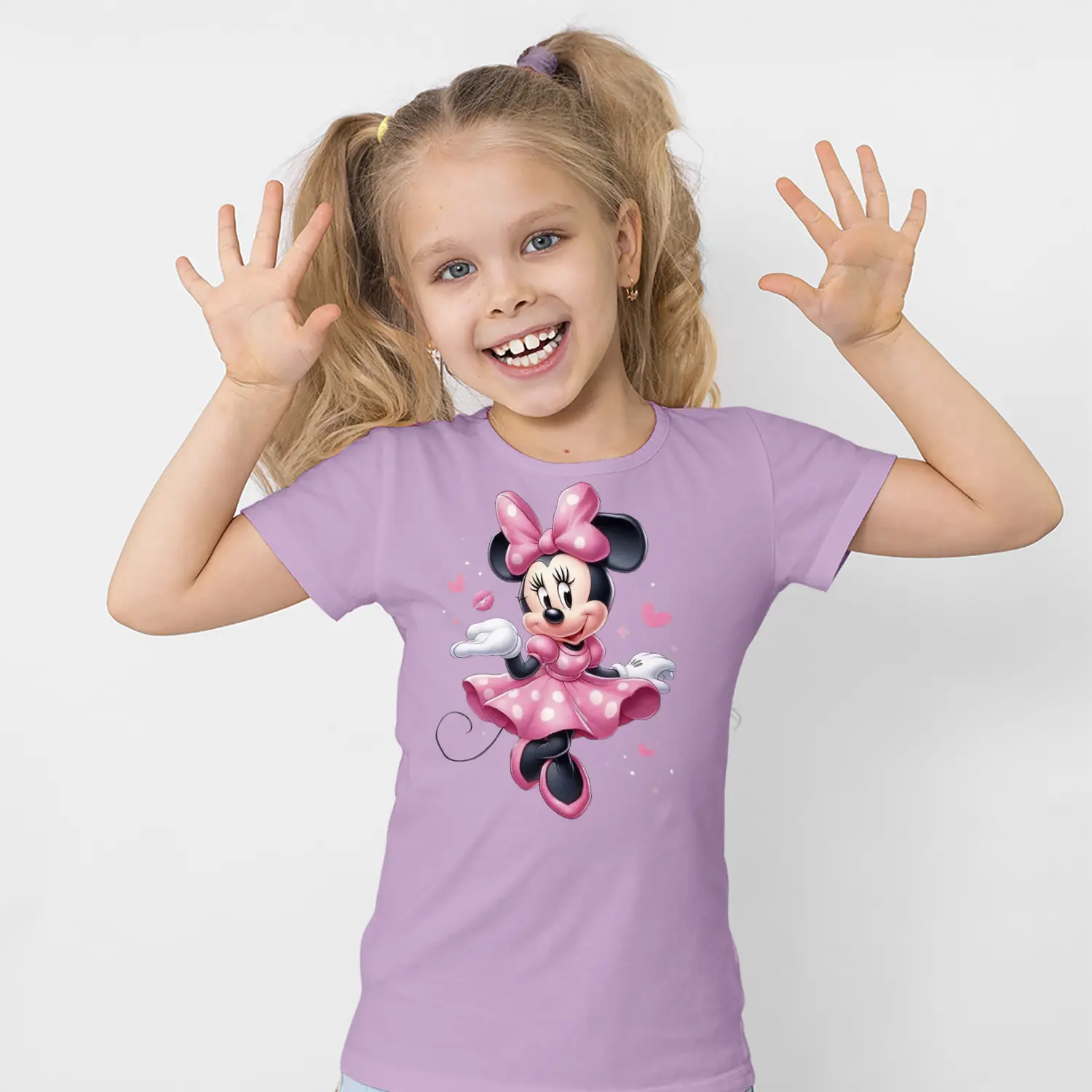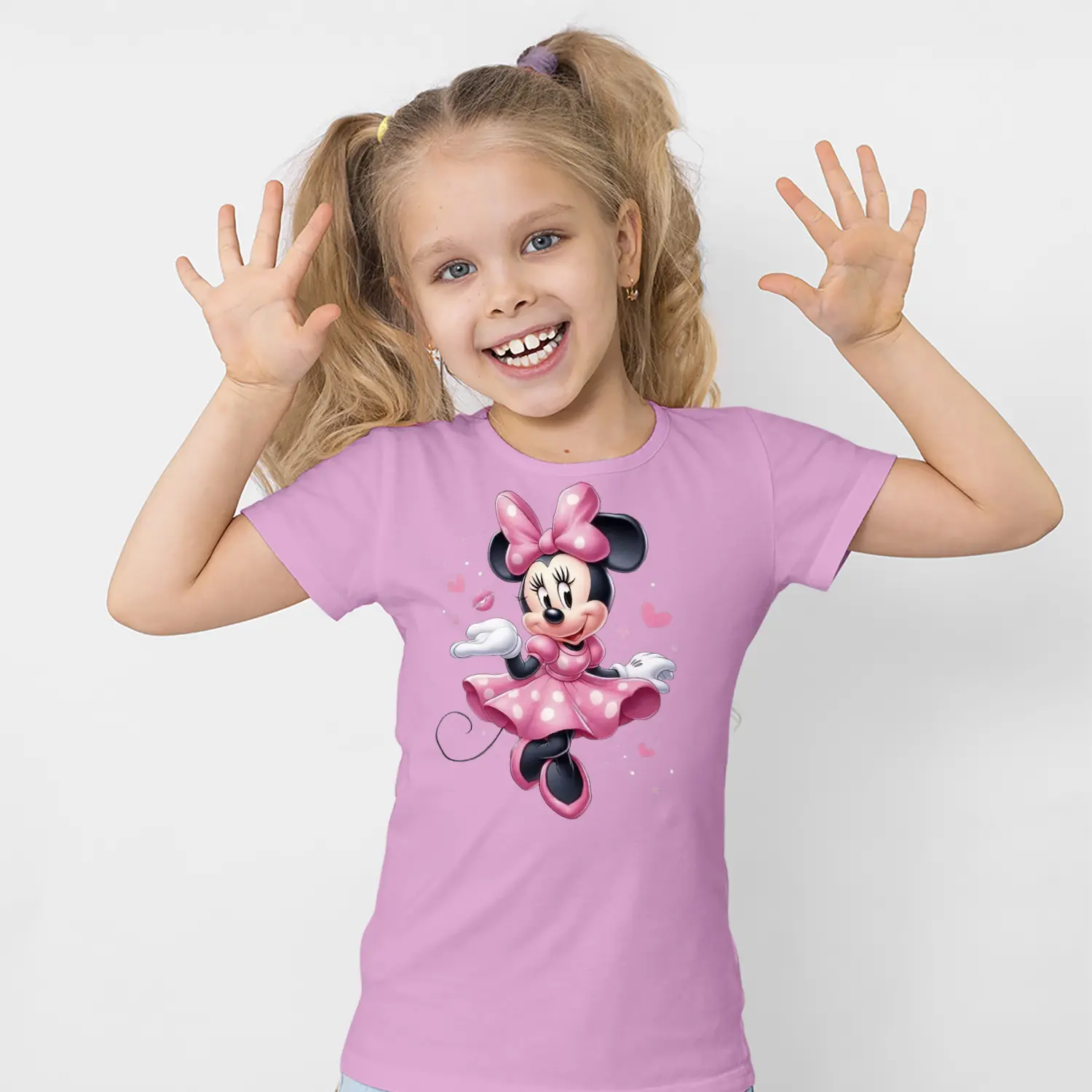 Pembe Elbiseli Fiyonklu Yuvarlak Kulaklı Fare Karikatür Figürlü Baskılı Kız Çocuk Tişörtü