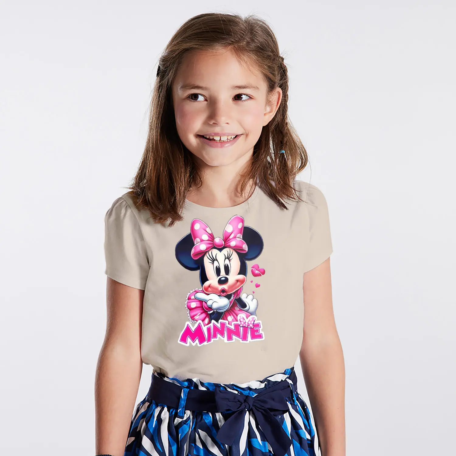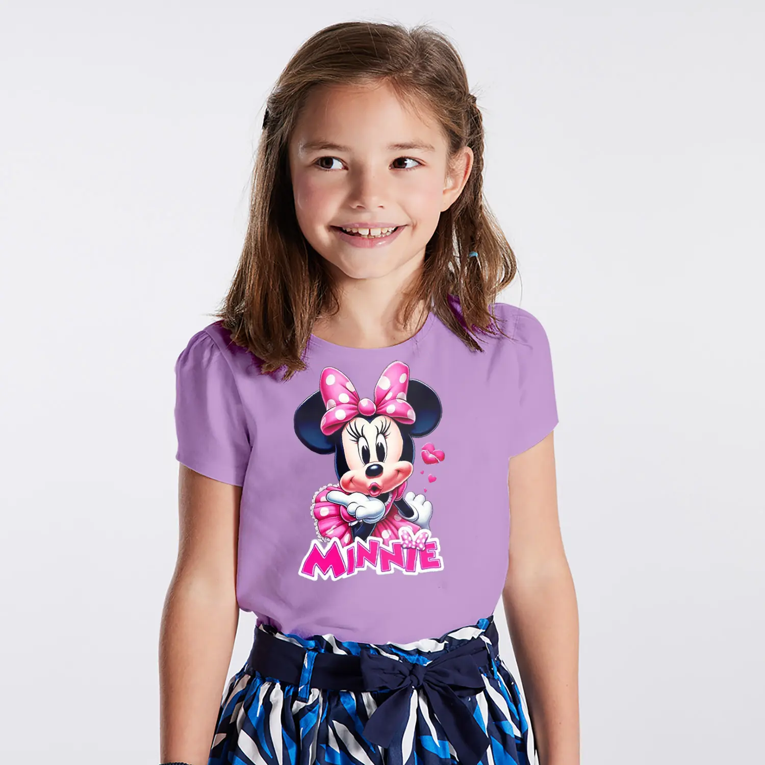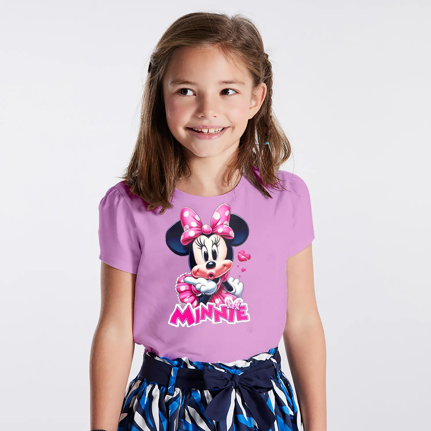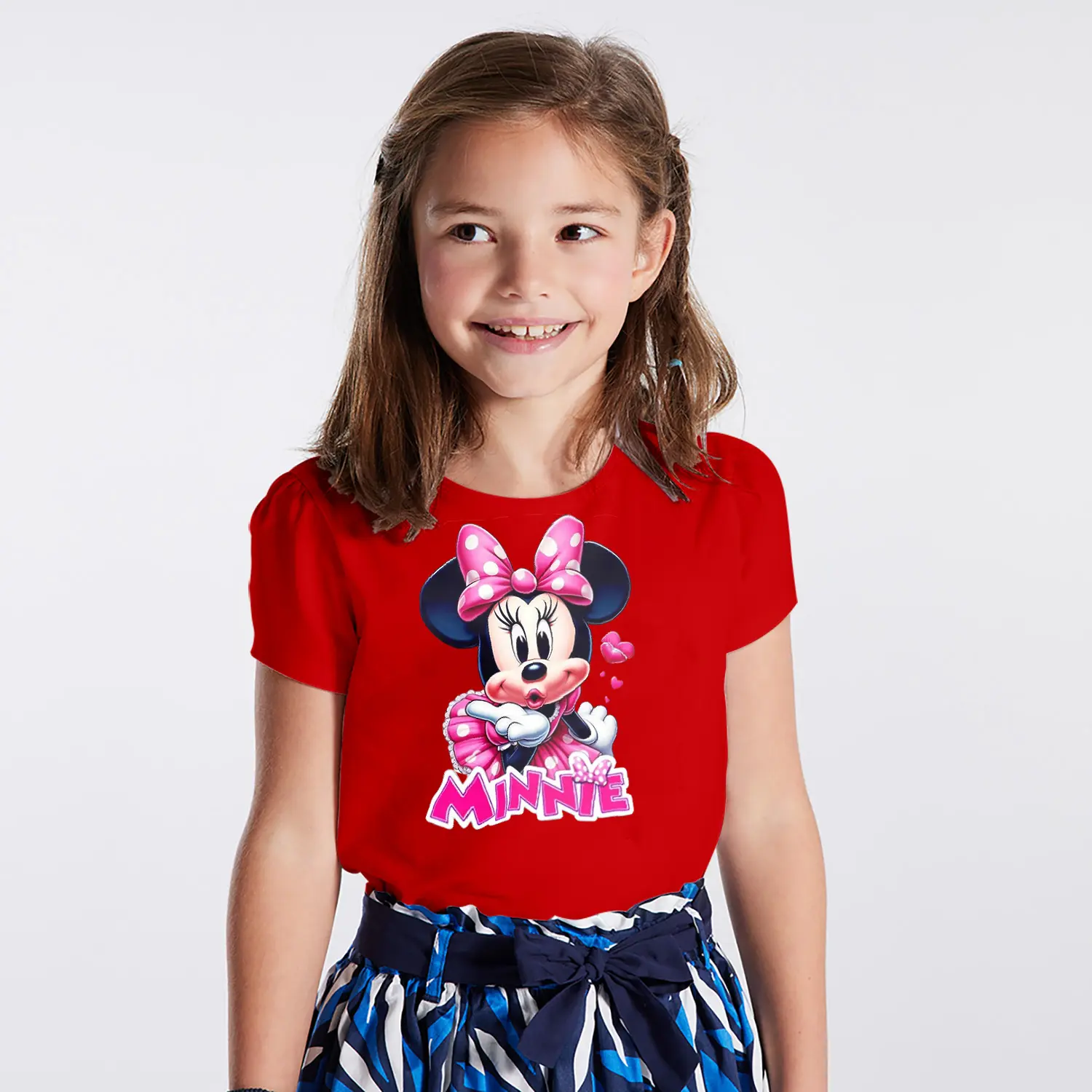 Pembe Elbiseli Kalpli Yuvarlak Kulaklı Fare Karikatür Minnie Yazılı Baskılı Kız Çocuk Tişörtü