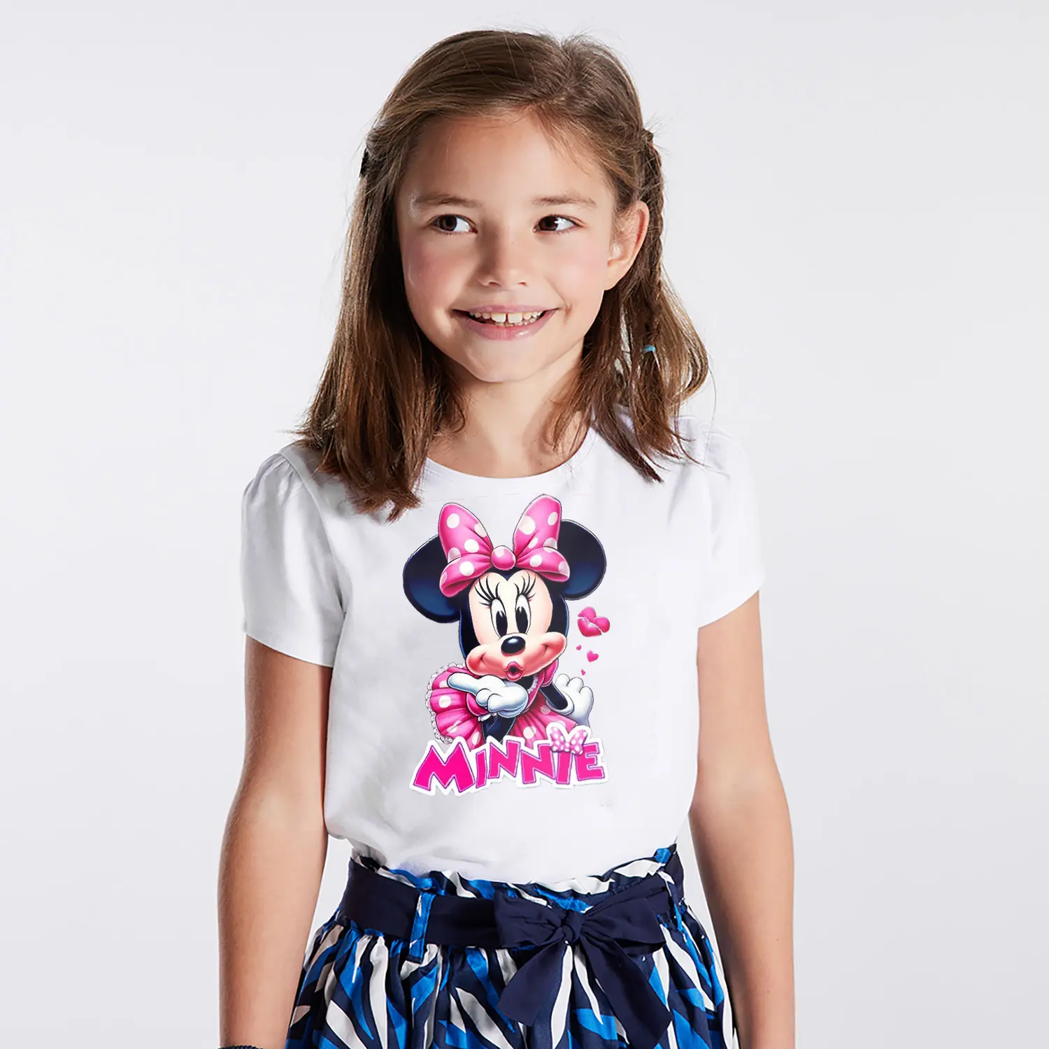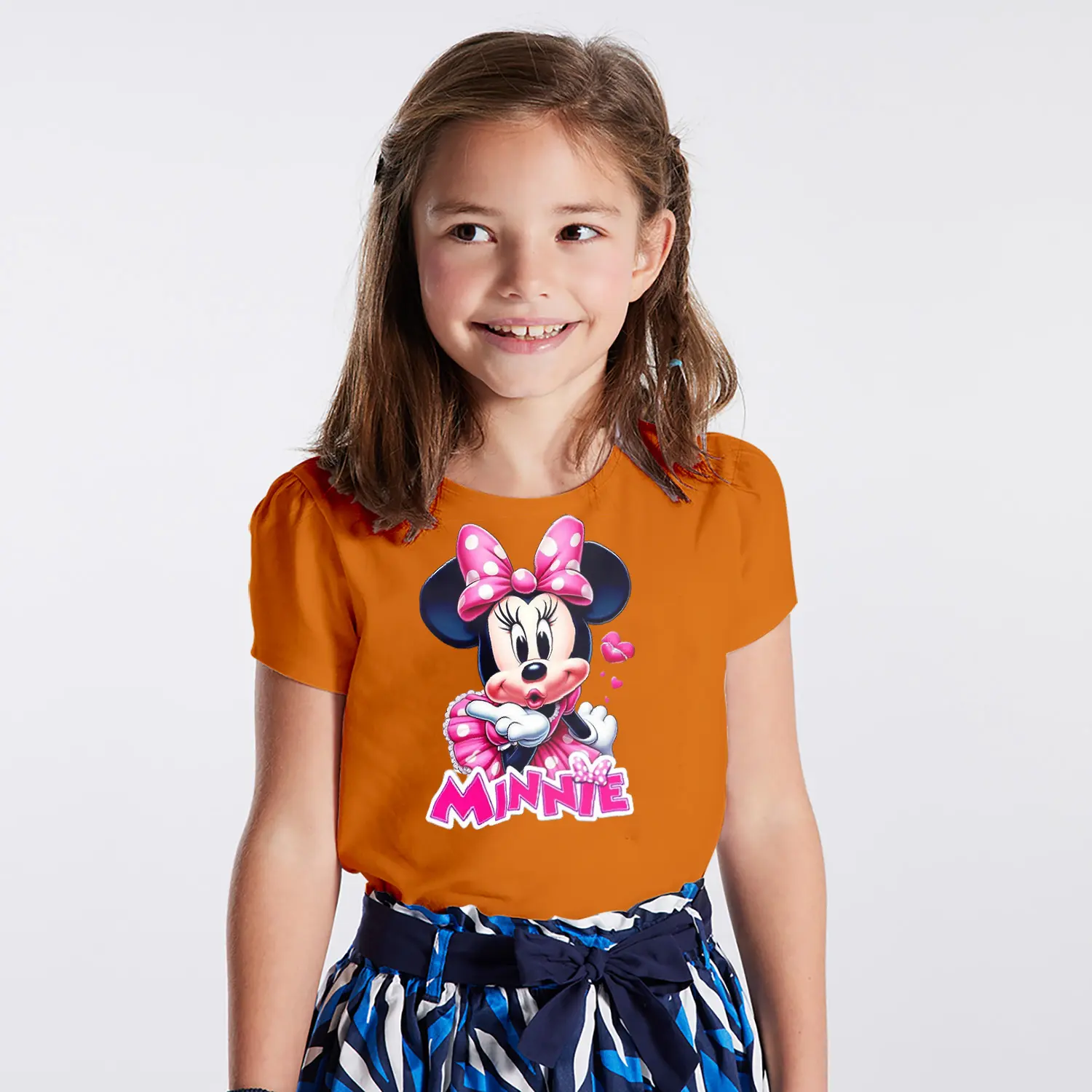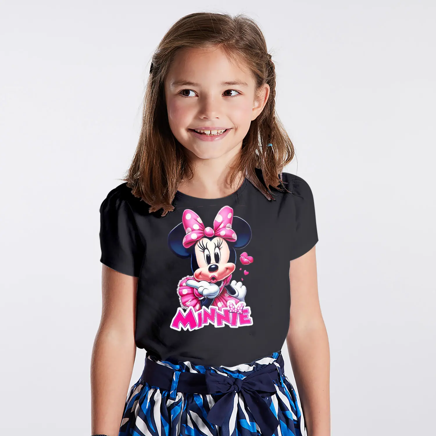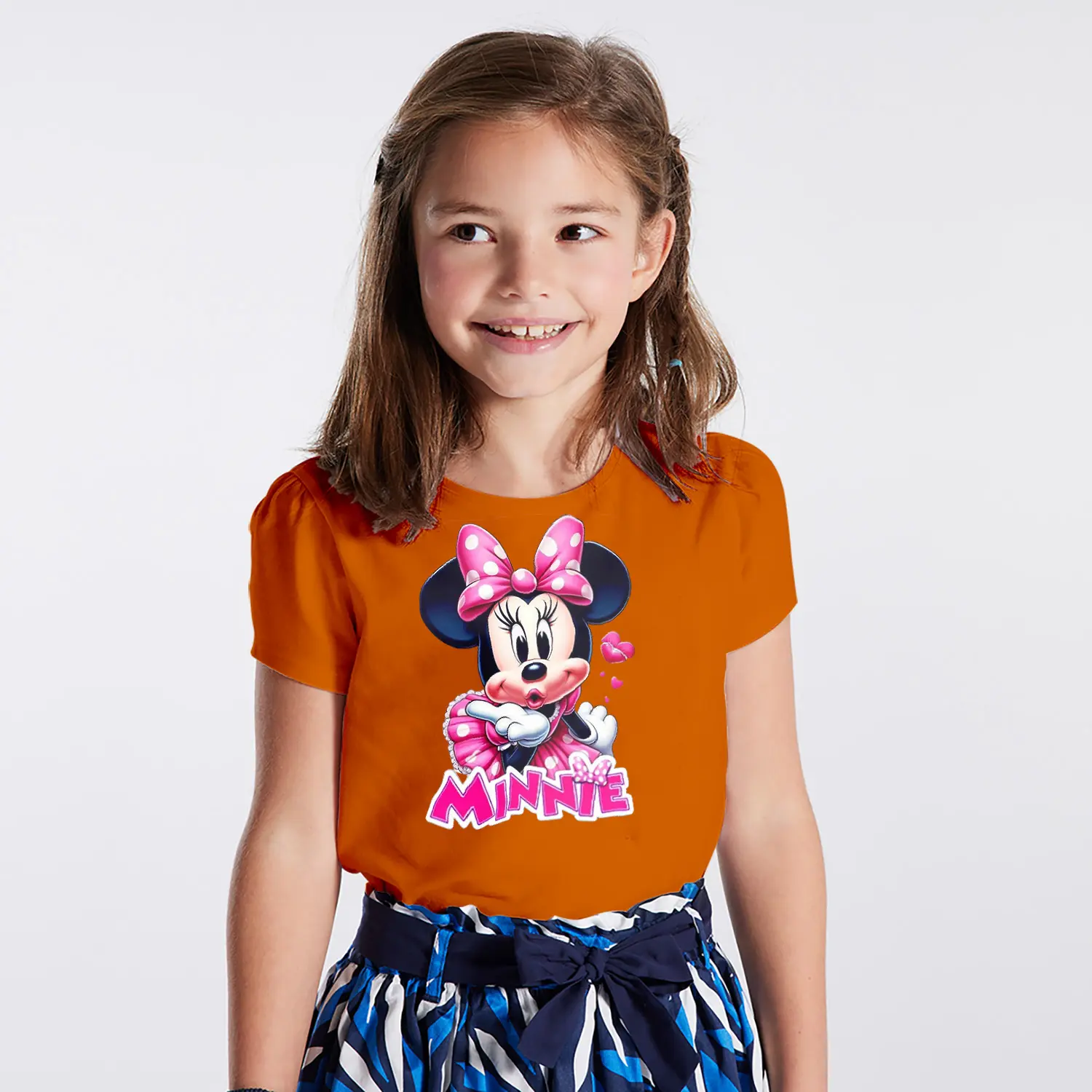 Pembe Elbiseli Kalpli Yuvarlak Kulaklı Fare Karikatür Minnie Yazılı Baskılı Kız Çocuk Tişörtü