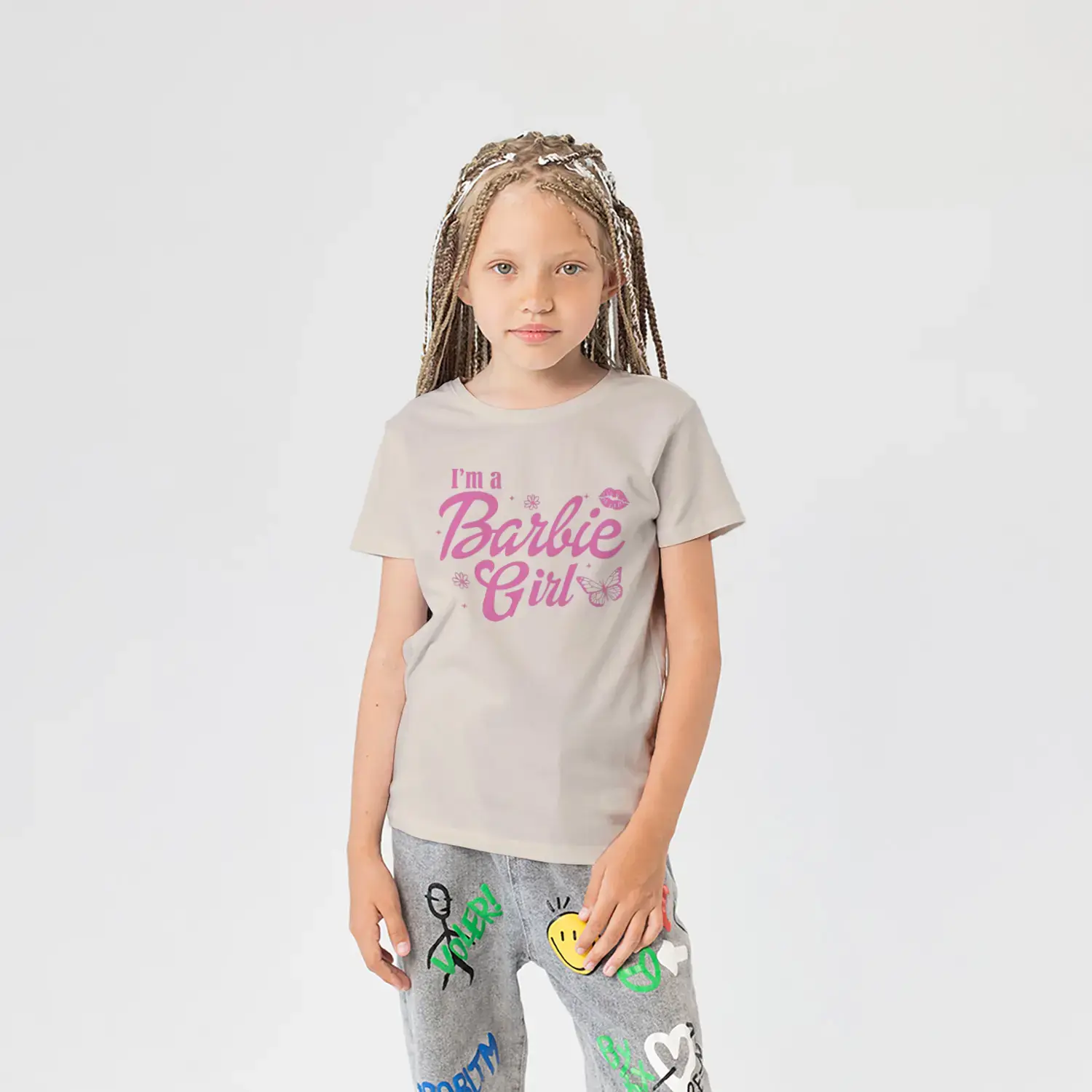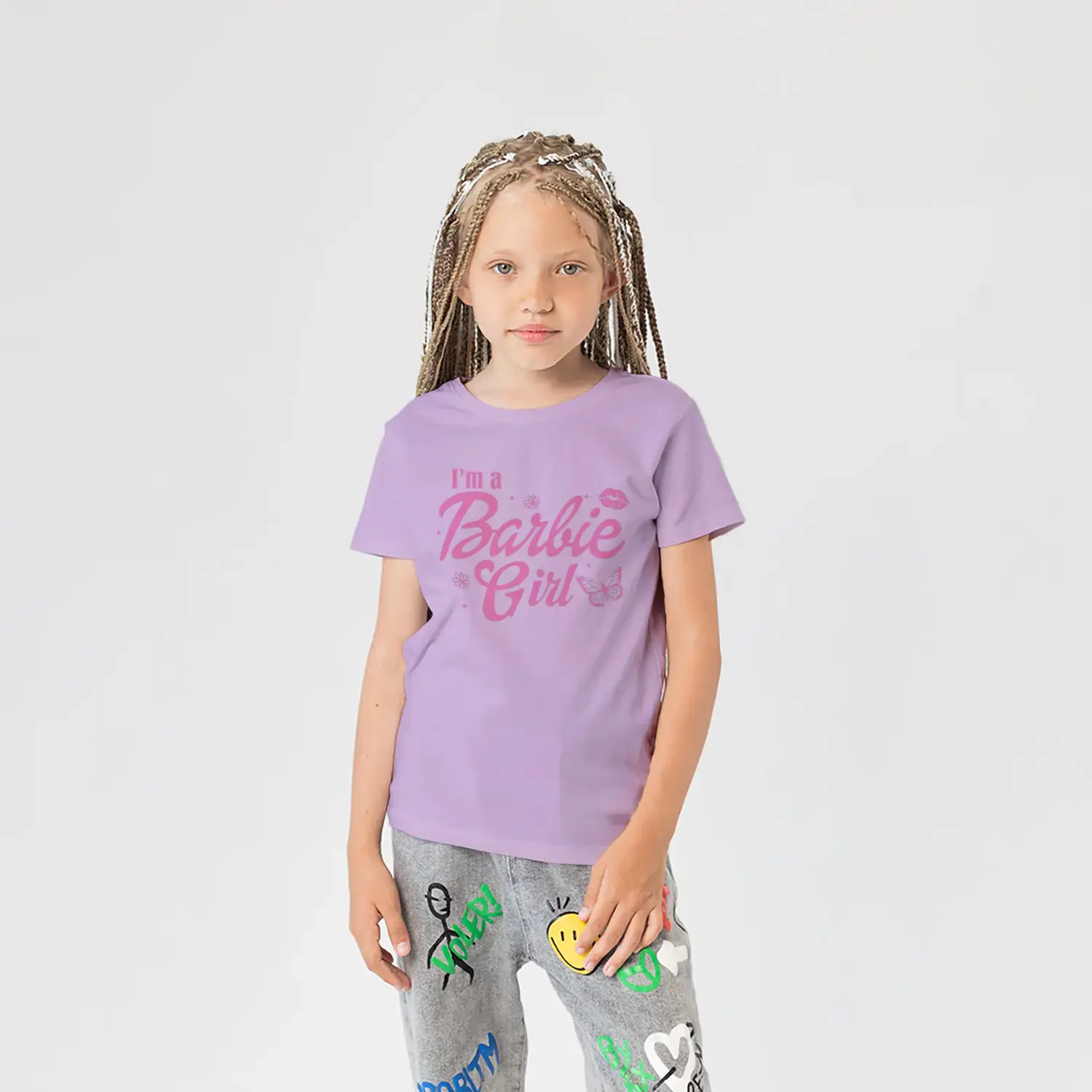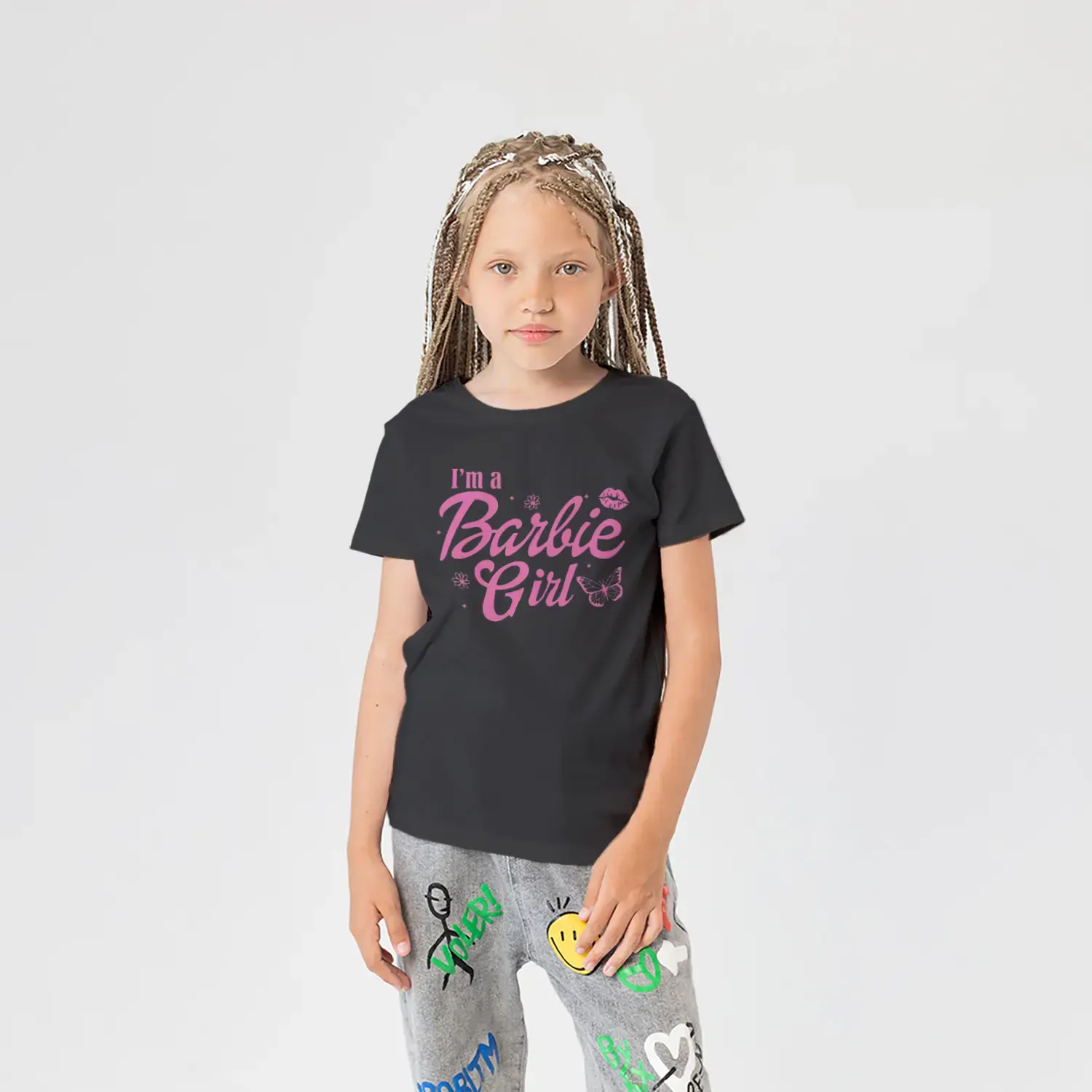 Pembe Kelebek ve Çiçek Süslemeli Moda Kız Yazı Baskılı Kız Çocuk